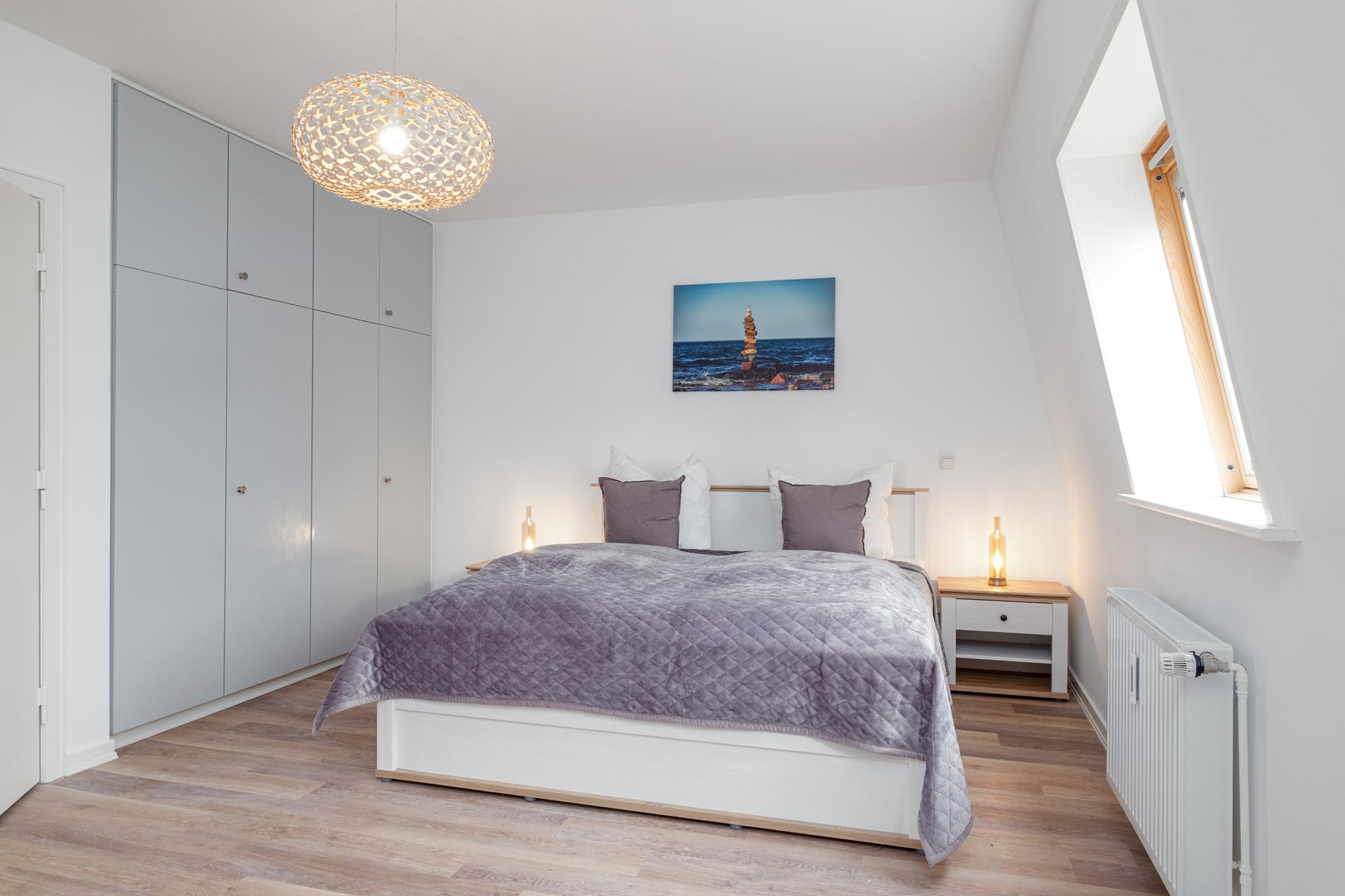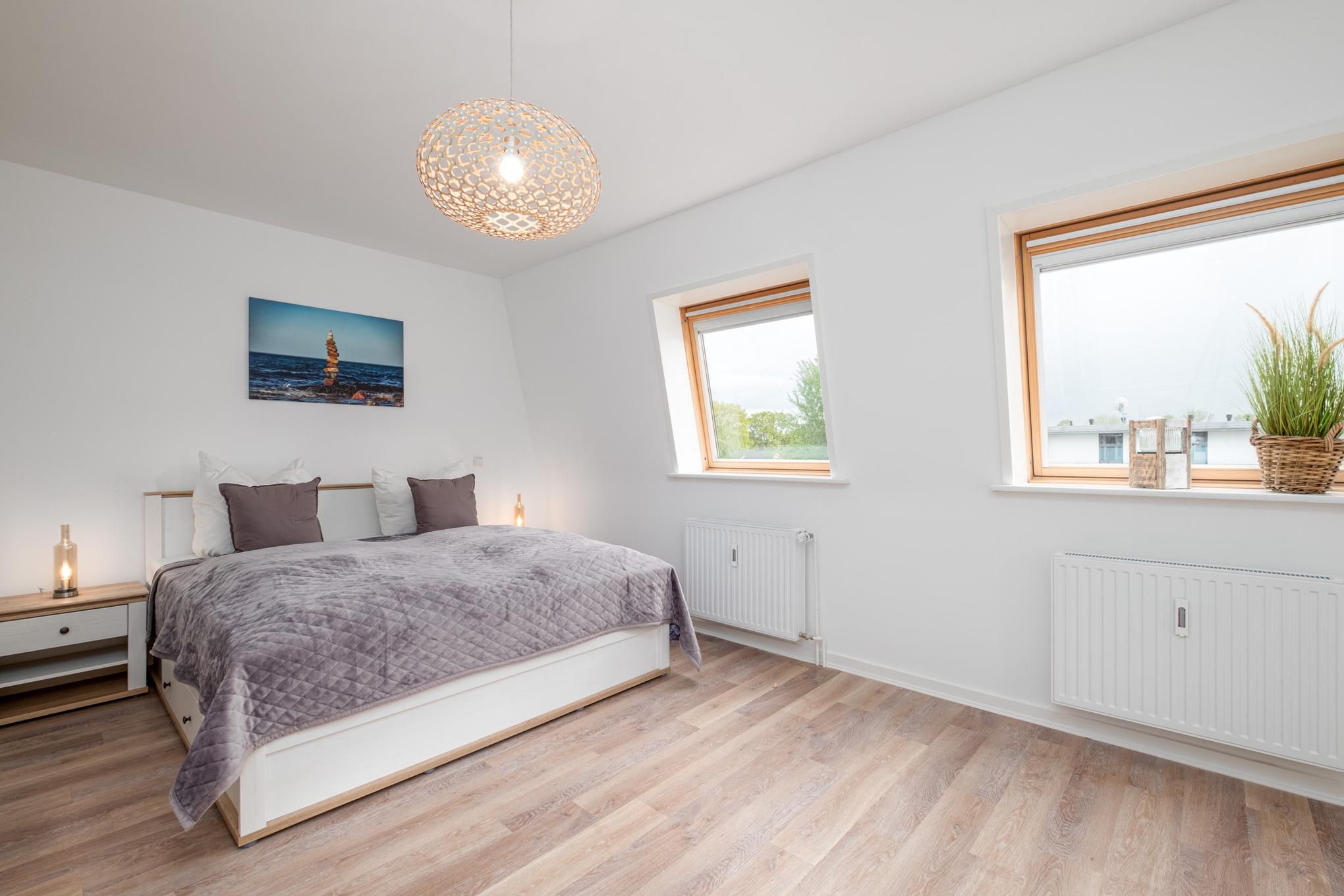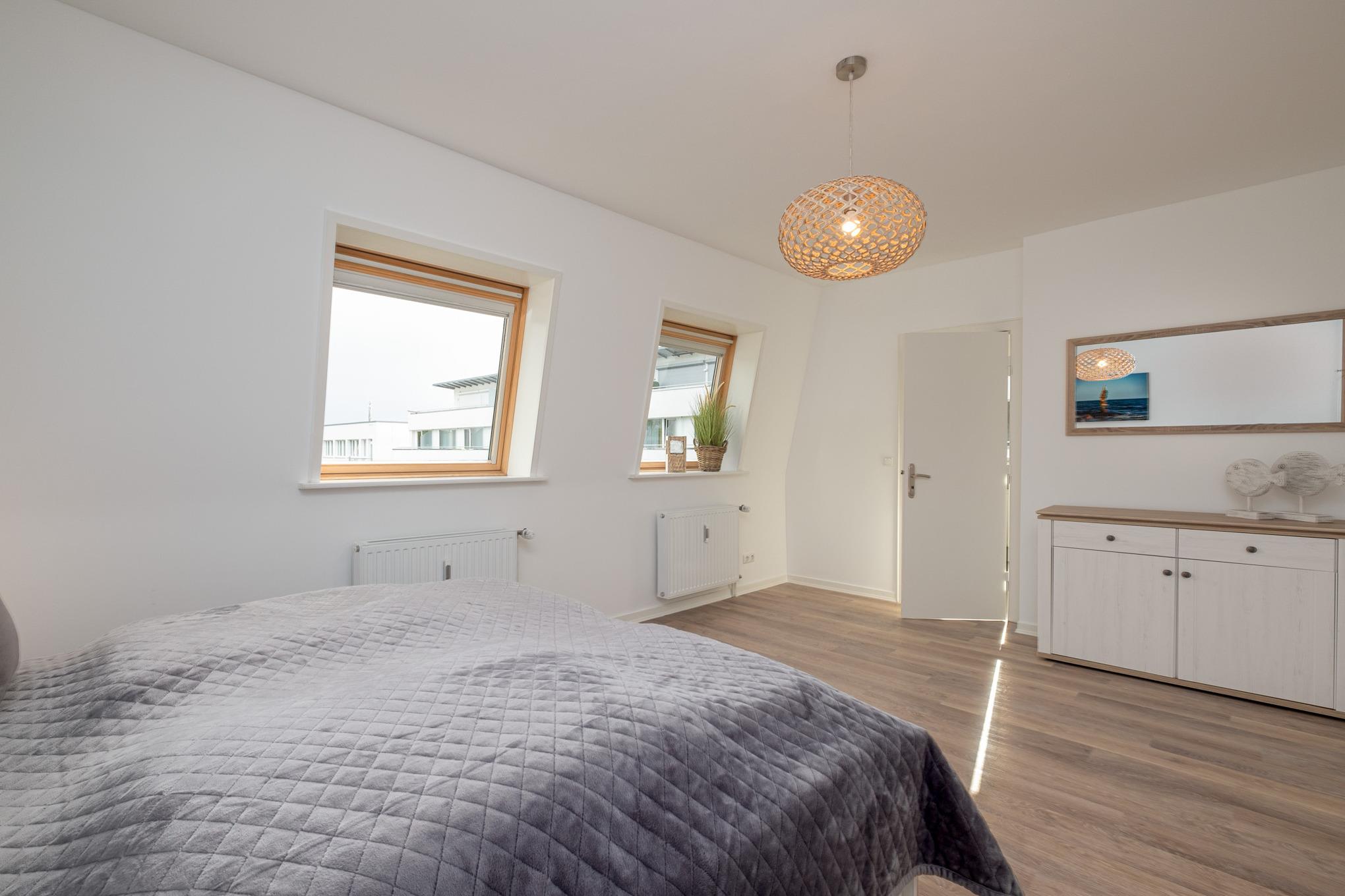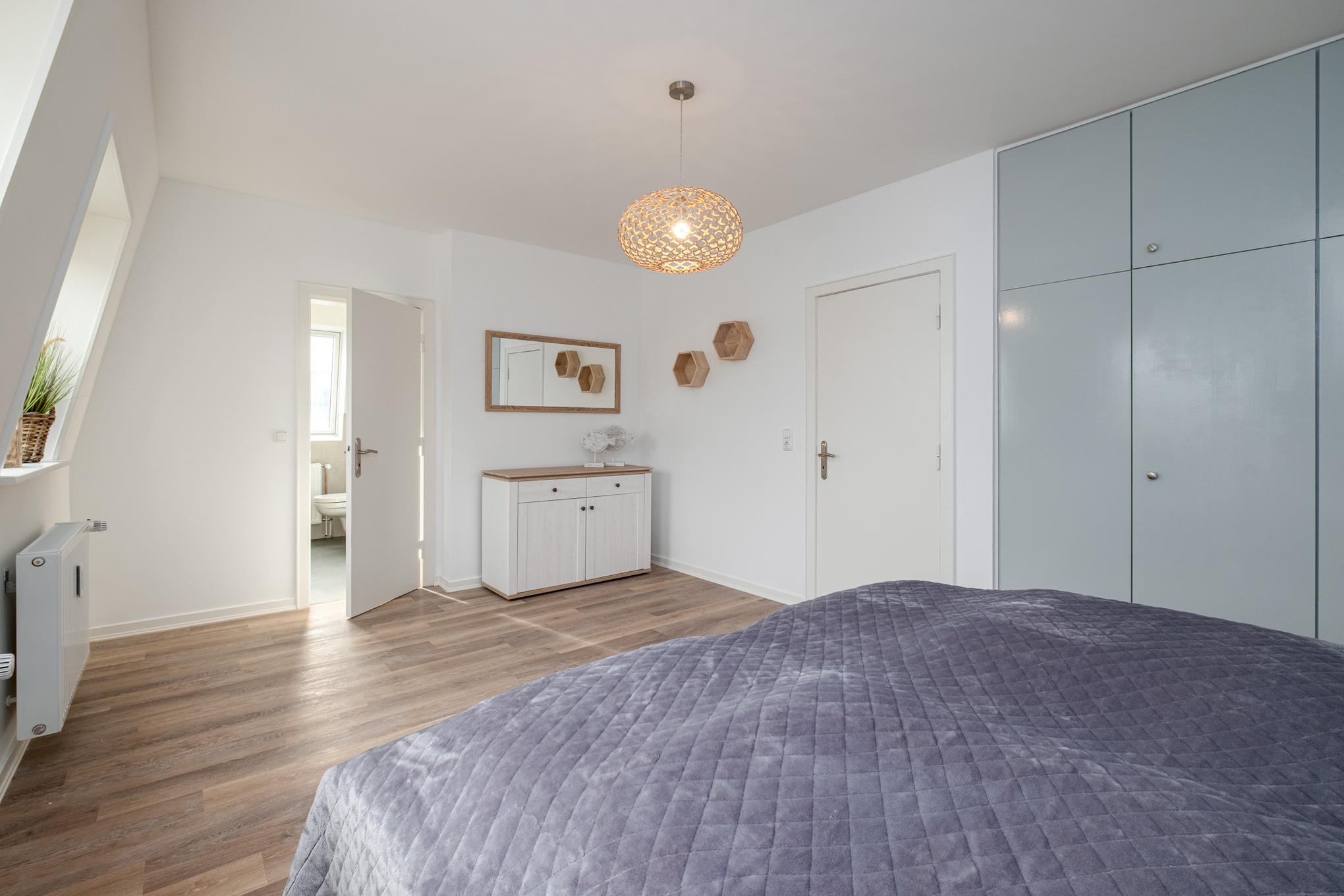 Das Schlafzimmer I ist mit einem Doppelbett (180x200cm) sowie einem großen Kleiderschrank eingerichtet. Von hier aus erreichen Sie direkt das Badezimmer II mit der Badewanne. Das Schlafzimmer II verfügt über ein ausziehbares Tandembett (je 80x200cm). Das Badezimmer I ist mit einer bodengleichen Dusche, einem Waschtisch und dem WC ausgestattet.