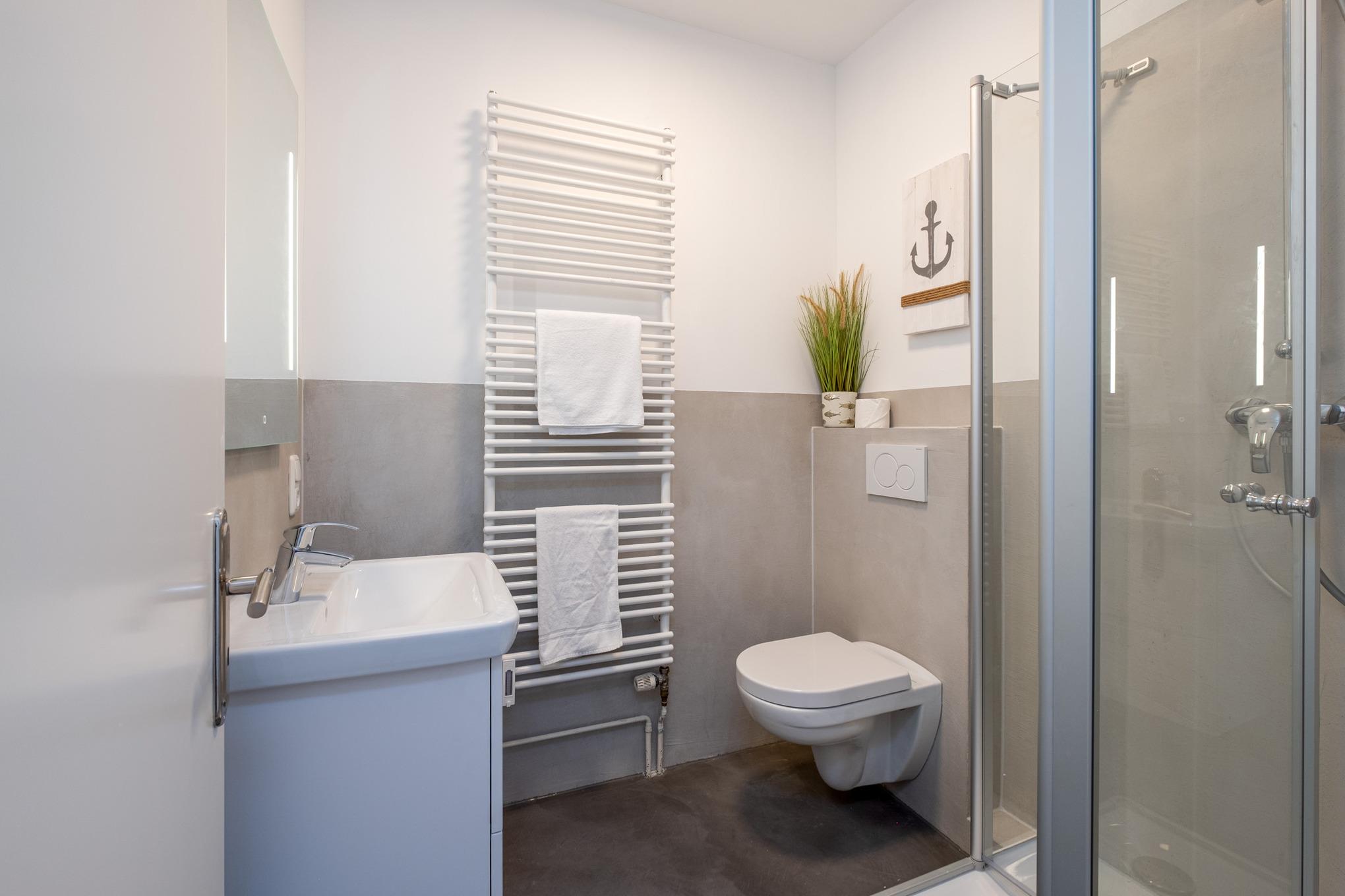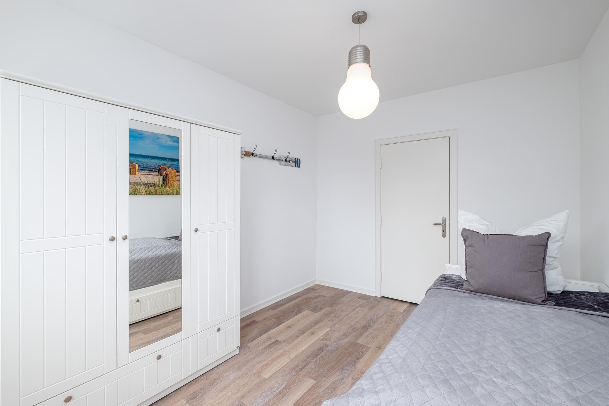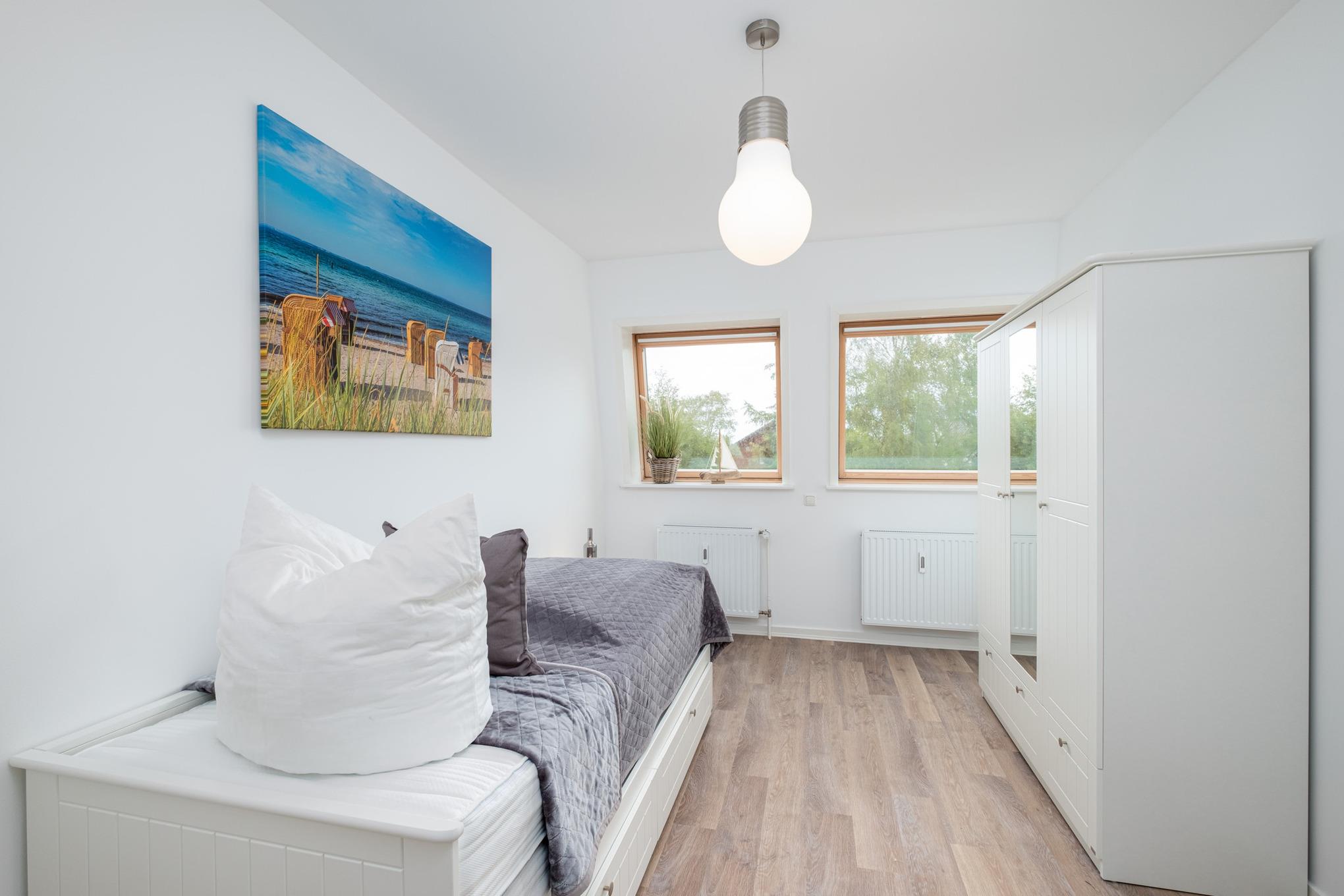 Das Schlafzimmer I ist mit einem Doppelbett (180x200cm) sowie einem großen Kleiderschrank eingerichtet. Von hier aus erreichen Sie direkt das Badezimmer II mit der Badewanne. Das Schlafzimmer II verfügt über ein ausziehbares Tandembett (je 80x200cm). Das Badezimmer I ist mit einer bodengleichen Dusche, einem Waschtisch und dem WC ausgestattet.