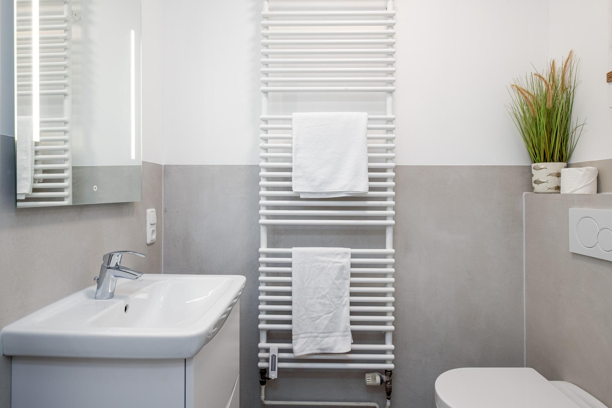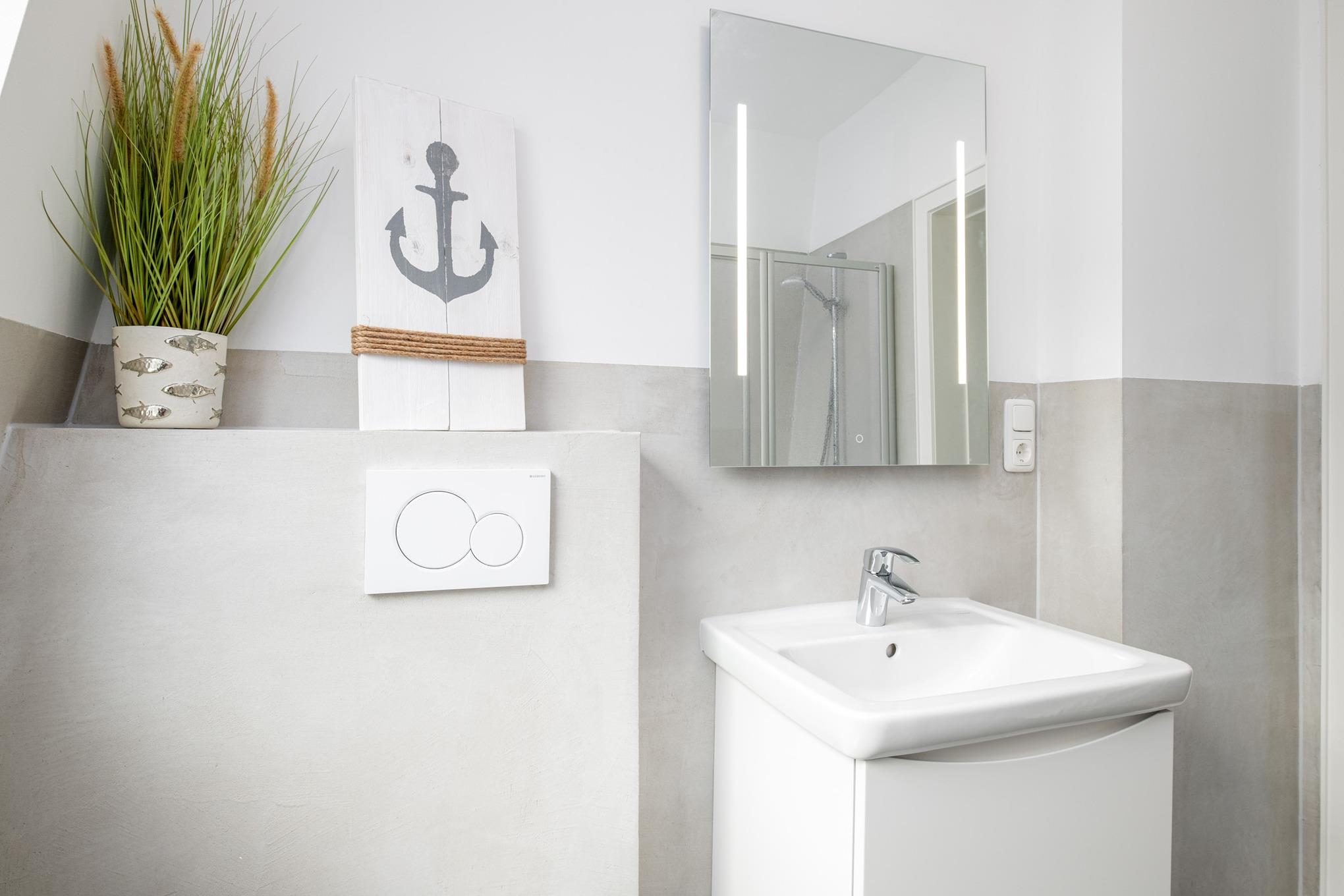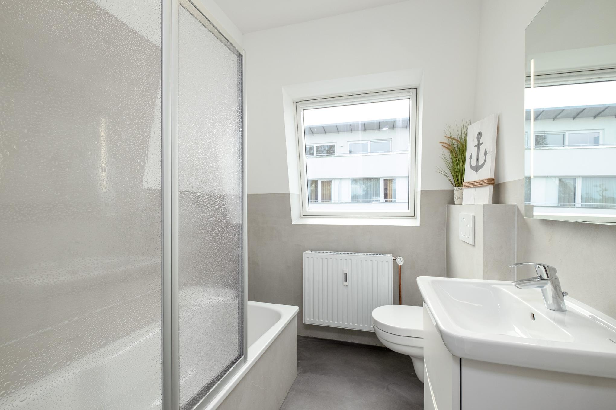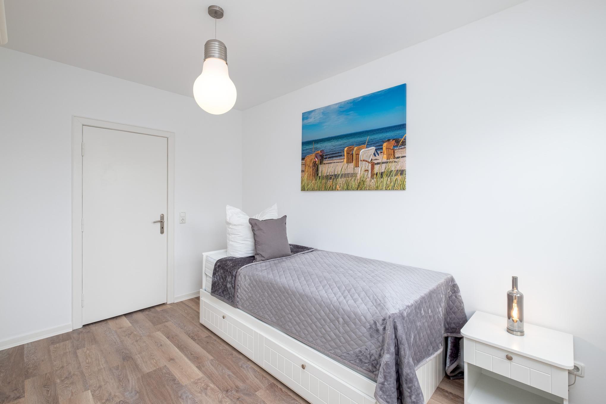 Das Schlafzimmer I ist mit einem Doppelbett (180x200cm) sowie einem großen Kleiderschrank eingerichtet. Von hier aus erreichen Sie direkt das Badezimmer II mit der Badewanne. Das Schlafzimmer II verfügt über ein ausziehbares Tandembett (je 80x200cm). Das Badezimmer I ist mit einer bodengleichen Dusche, einem Waschtisch und dem WC ausgestattet.