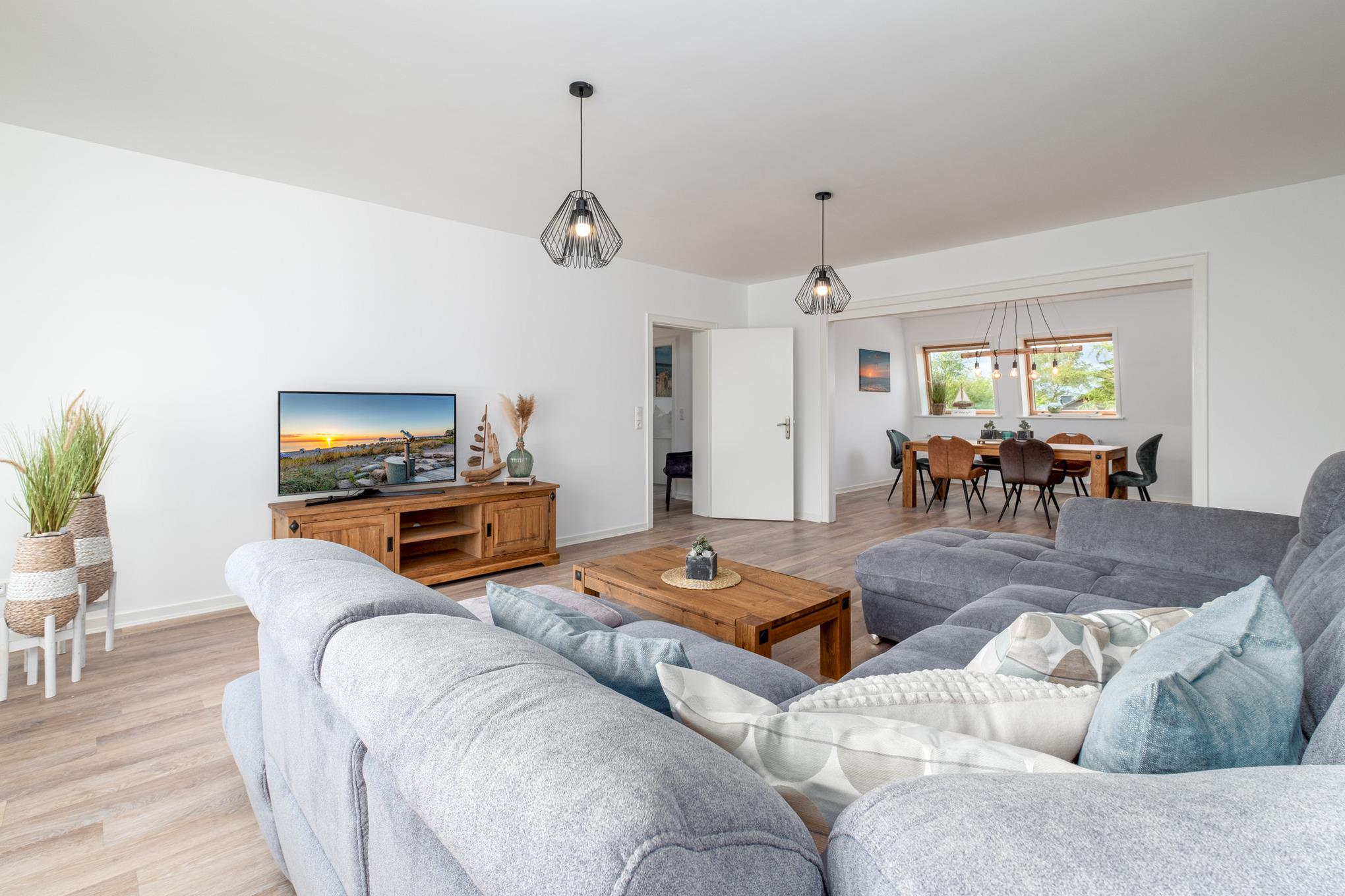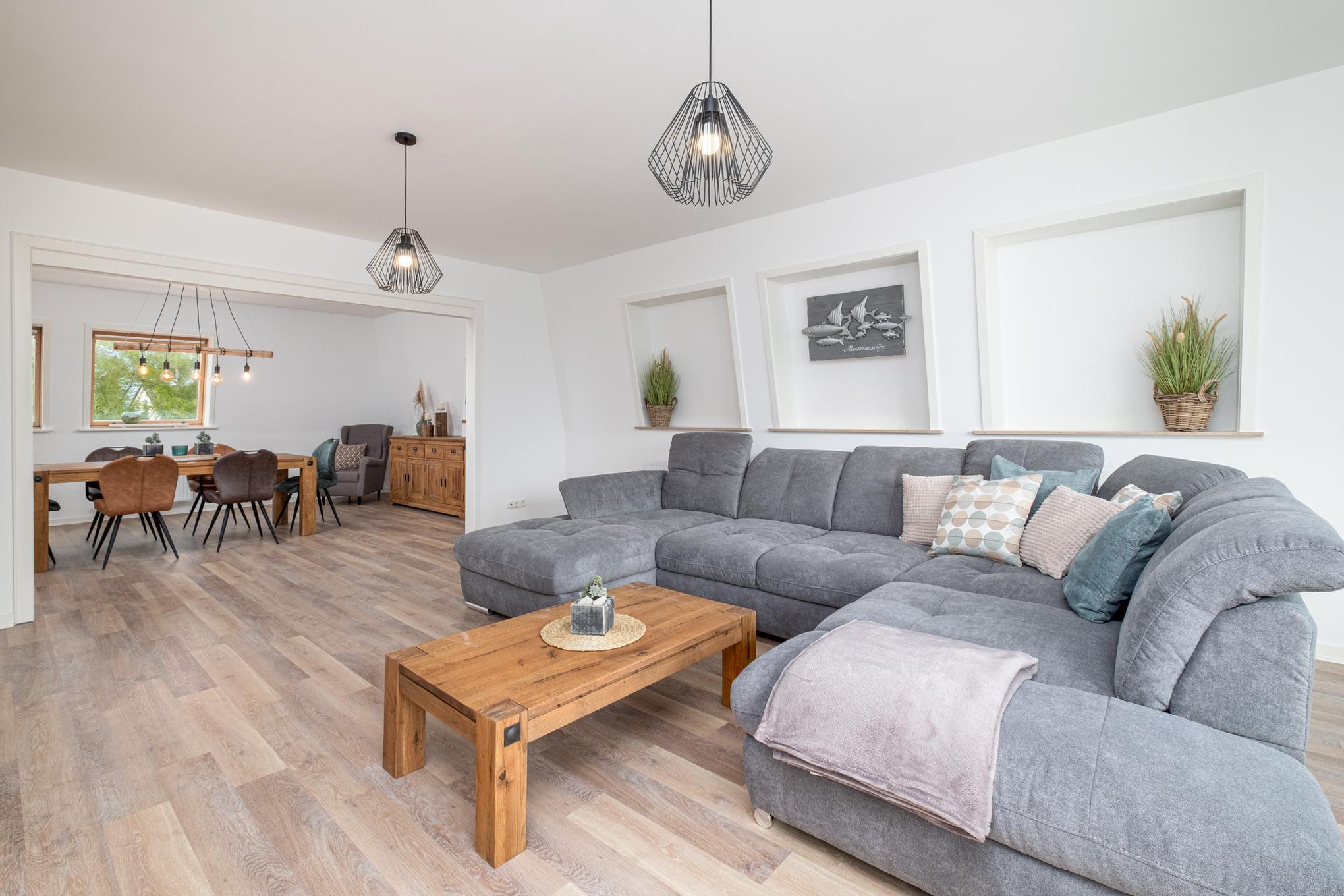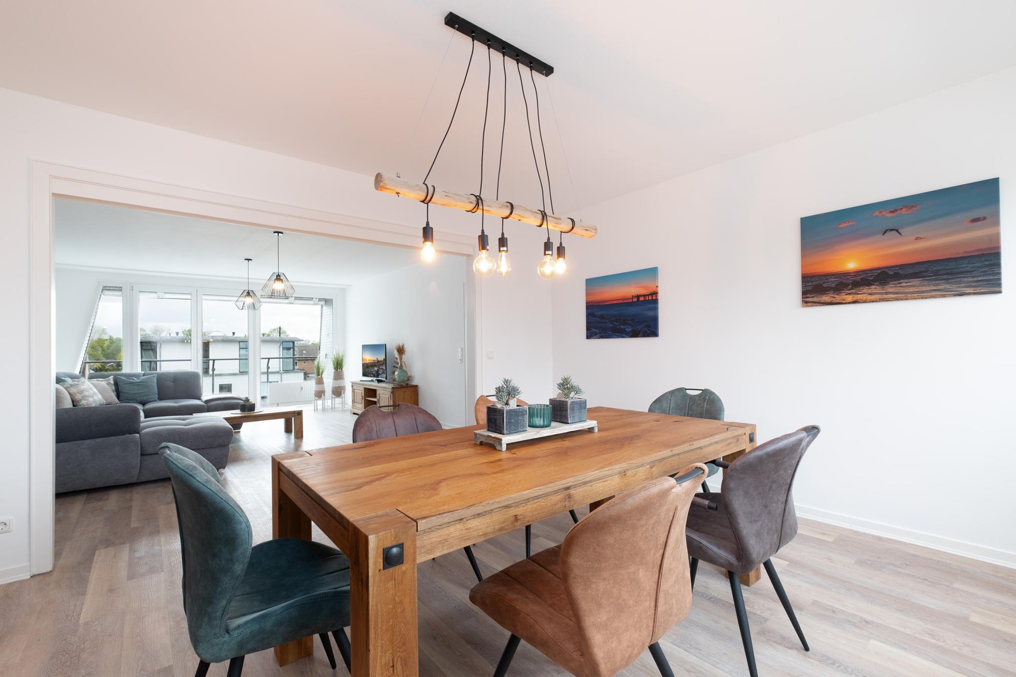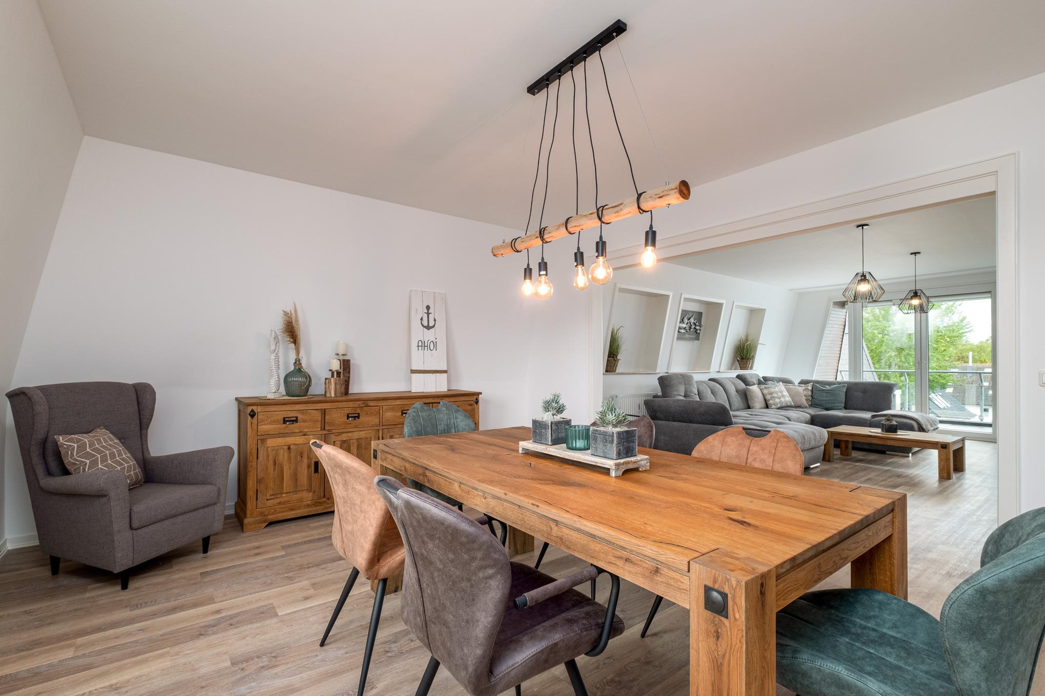 Die Ferienwohnung Ahoi begrüßt Sie auf der zweiten Etage auf 118qm mit einem großen Wohn- und Essbereich, einer separaten Küche, 2 separaten Schlafzimmern und 2 Badezimmern. Das Wohnzimmer ist mit einer großen Couchgarnitur mit Schlaffunktion (160x200cm), einem Flatscreen-TV und einem Blu-Ray-Player ausgestattet. Für die passende Urlaubsmusik stehen Ihnen in diesem Appartement 2 Sonos Boxen zur Verfügung. Der großzügige Essbereich lädt nicht nur zu tollen Mahlzeiten, die sich perfekt und ungestört in der separaten Küche - in welcher Ihnen neben einer Filterkaffeemaschine zudem eine Nespressomaschine zur Verfügung stehen - zubereiten lassen, sondern auch zu witzigen Spieleabenden ein.