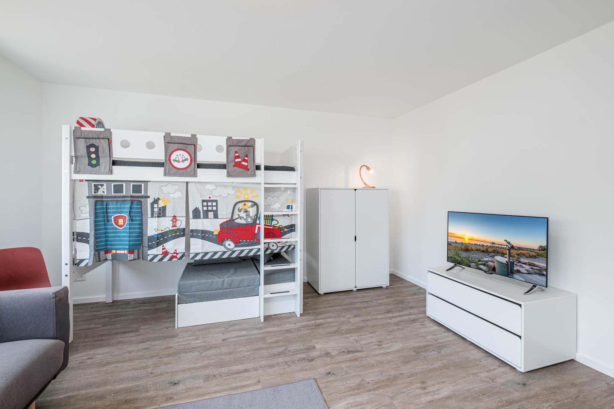 Für die fünfte und sechste Person steht Ihnen ein drittes Schlafzimmer mit einem Einzel-Etagenbett (0,90x2,00m) und einer ausziehbaren vierten Schlafmöglichkeit (0,80x1,80m) zur Verfügung - dieses Schlafzimmer ist eher für Kinder geeignet. Hier finden Sie ebenfalls einen Fernseher, der für zusätzliche Unterhaltung sorgt.