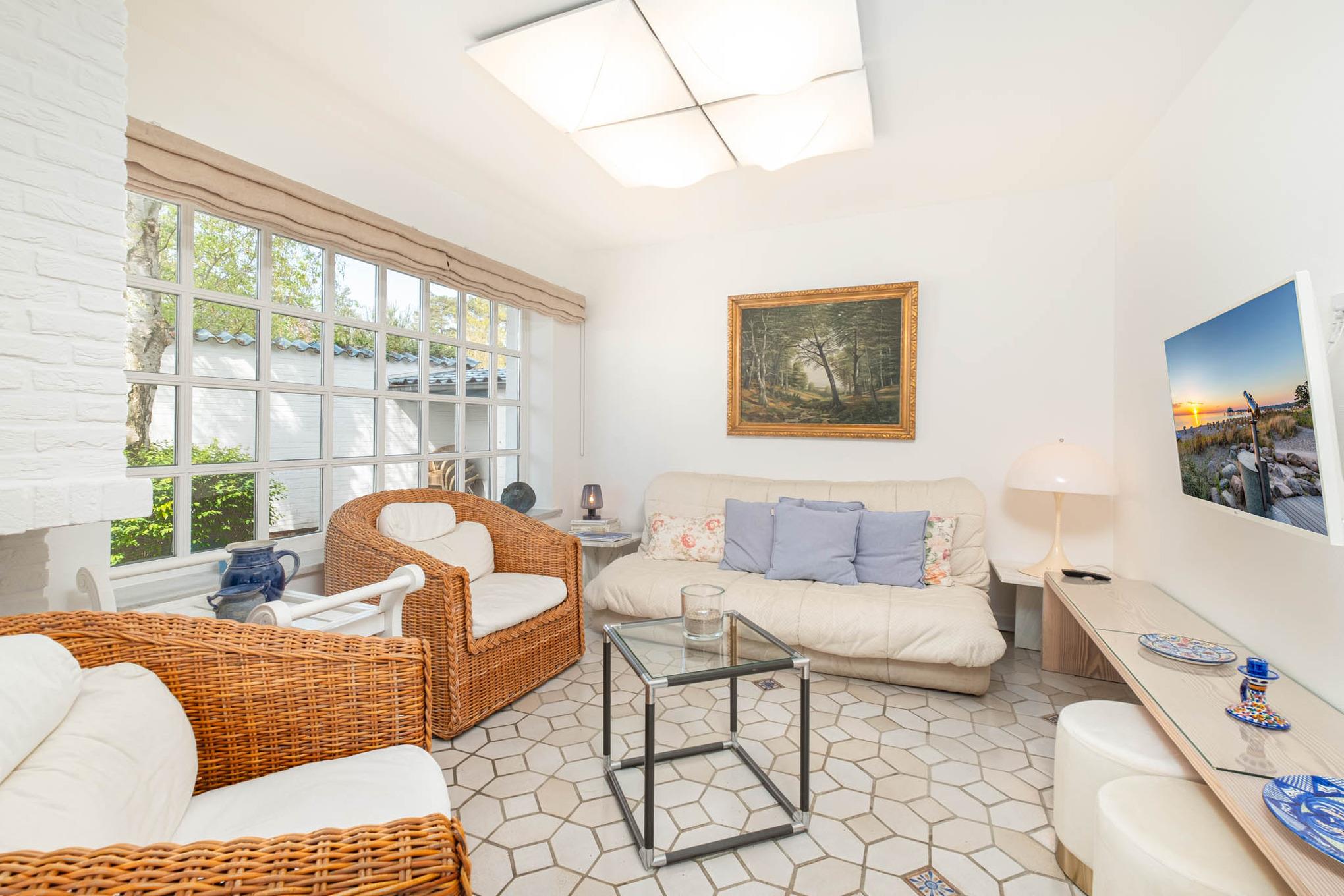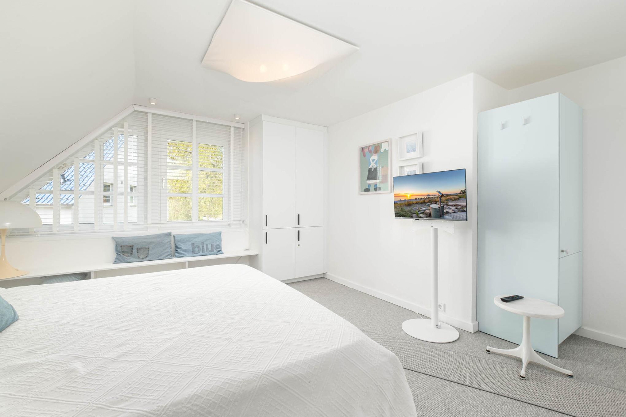 Bitte beachten Sie, dass der TV im Schlafzimmer die Sender ZDF, ARD, ZDF NEO, 3 SAT, KIKA, ONE, ARTE, WDR sowie PHOENIX empfängt. Private Sender sind dort leider nicht zu empfangen, auch eine Smart-Funktion gibt es leider nicht.