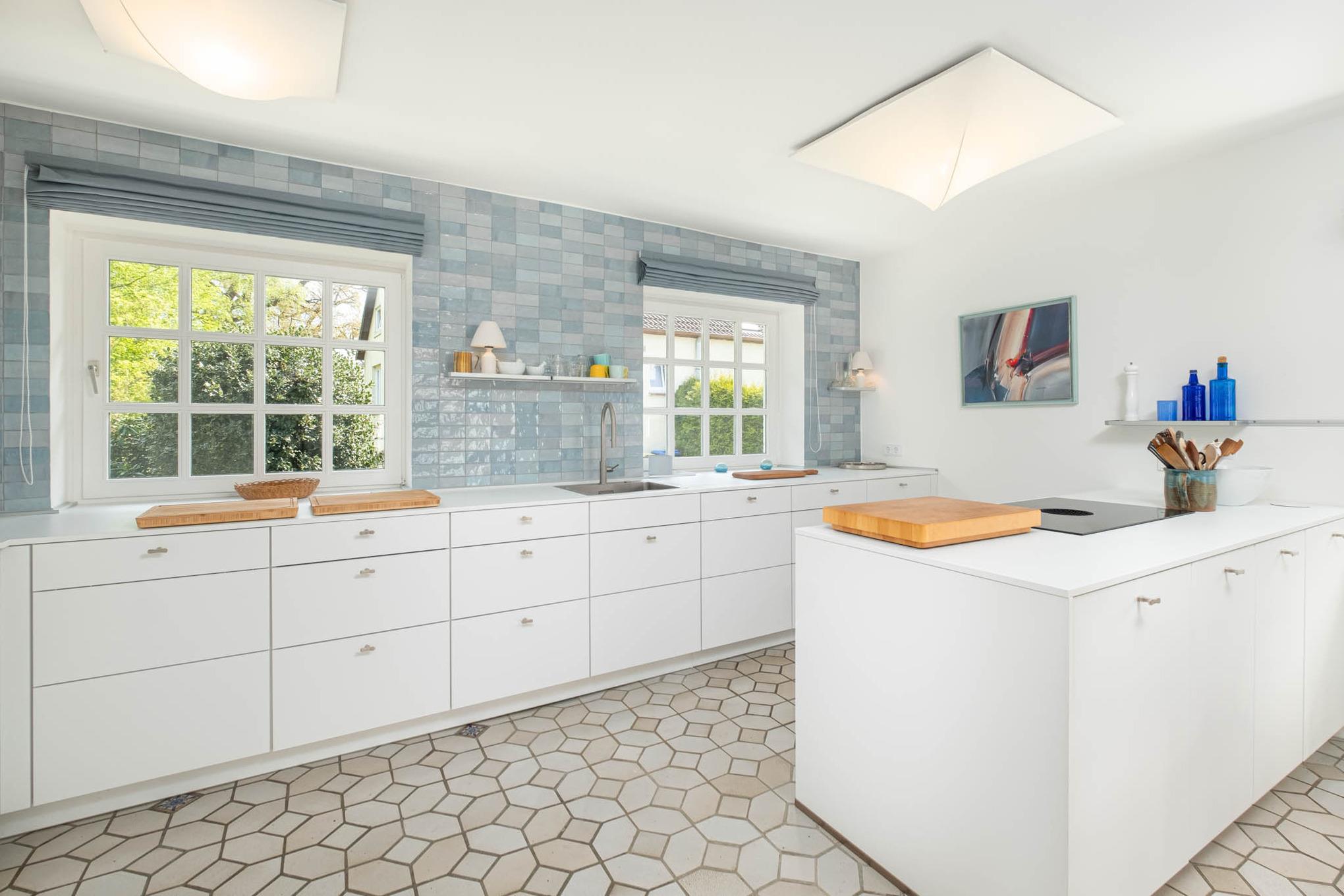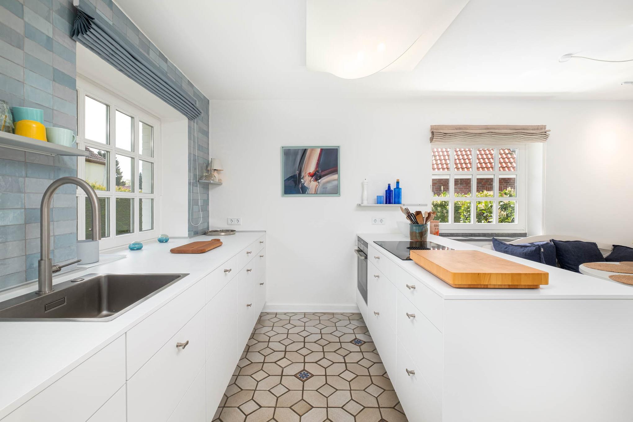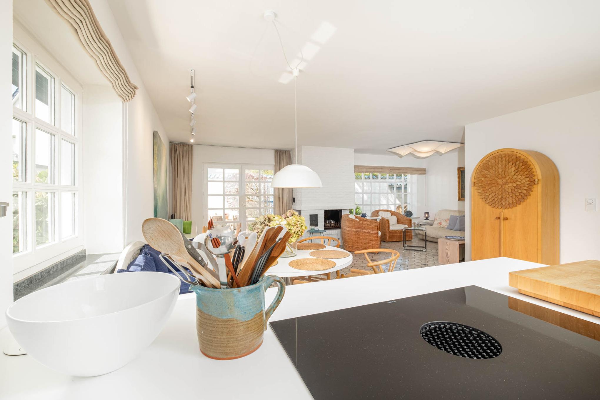 Die angrenzende offene Küche ist unter anderem mit einem Induktionskochfeld, Backofen und Geschirrspüler ausgestattet und bietet ausreichend Platz zum Kochen und Genießen.