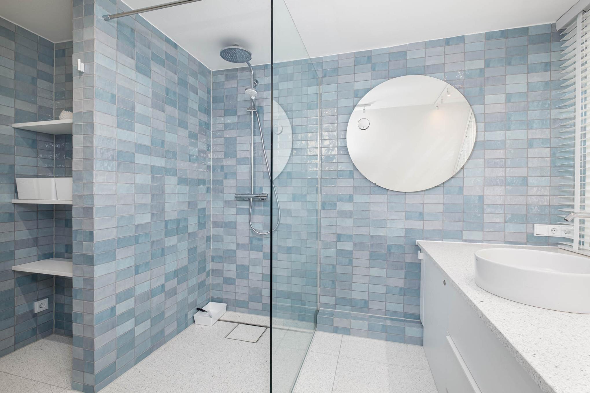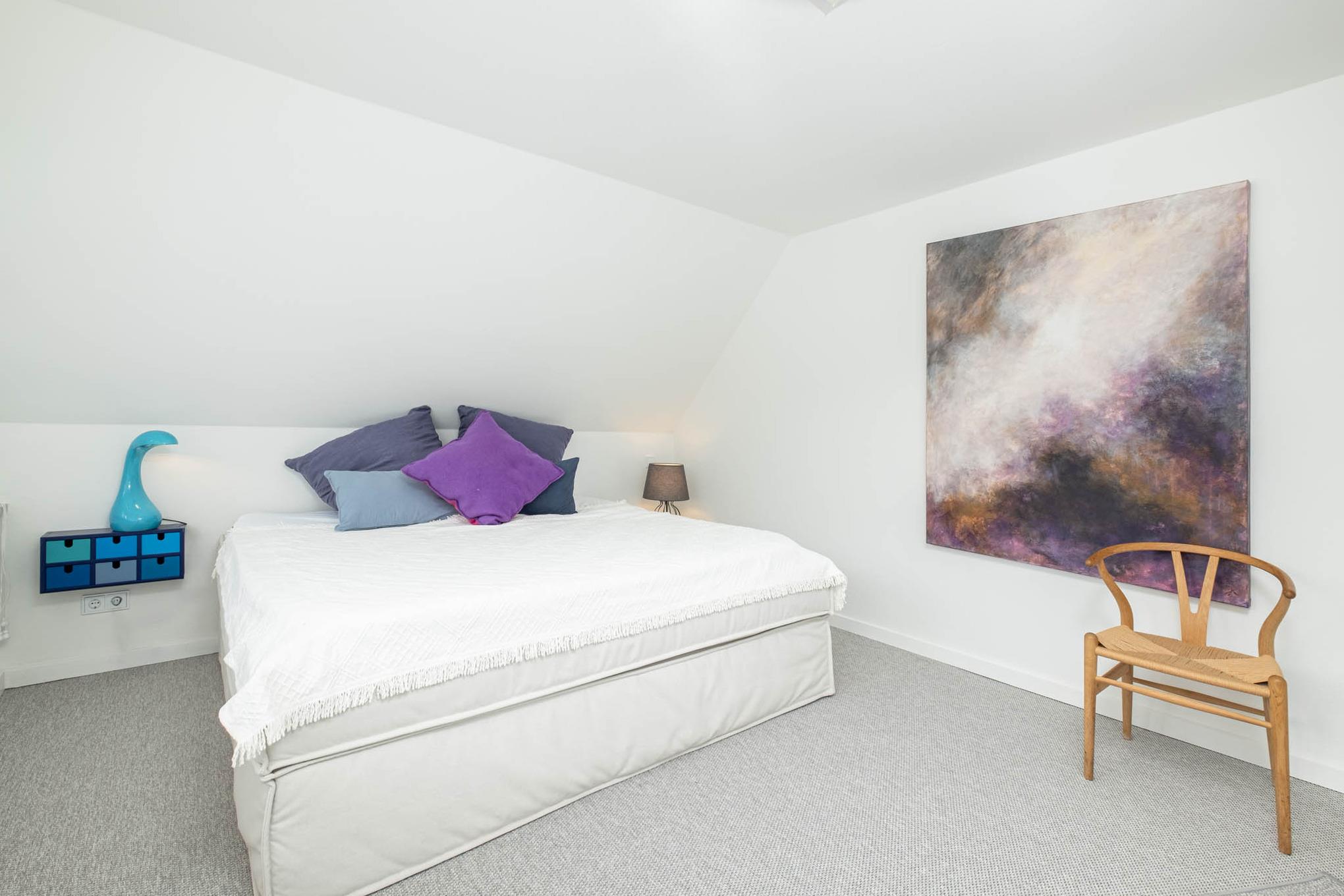 Das Schlafzimmer I bietet ein komfortables Doppelbett (160x200 cm) und einen Kleiderschrank. Im Schlafzimmer II erwartet Sie ebenfalls ein Doppelbett (200x200 cm), ein TV (keine privaten Sender, keine Smartfunktion) und ausreichend Stauraum für Ihr Reisegepäck. Das Badezimmer punktet mit einer ebenerdigen Dusche, die durch eine Duschtrennwand abgetrennt ist, sowie einem WC.