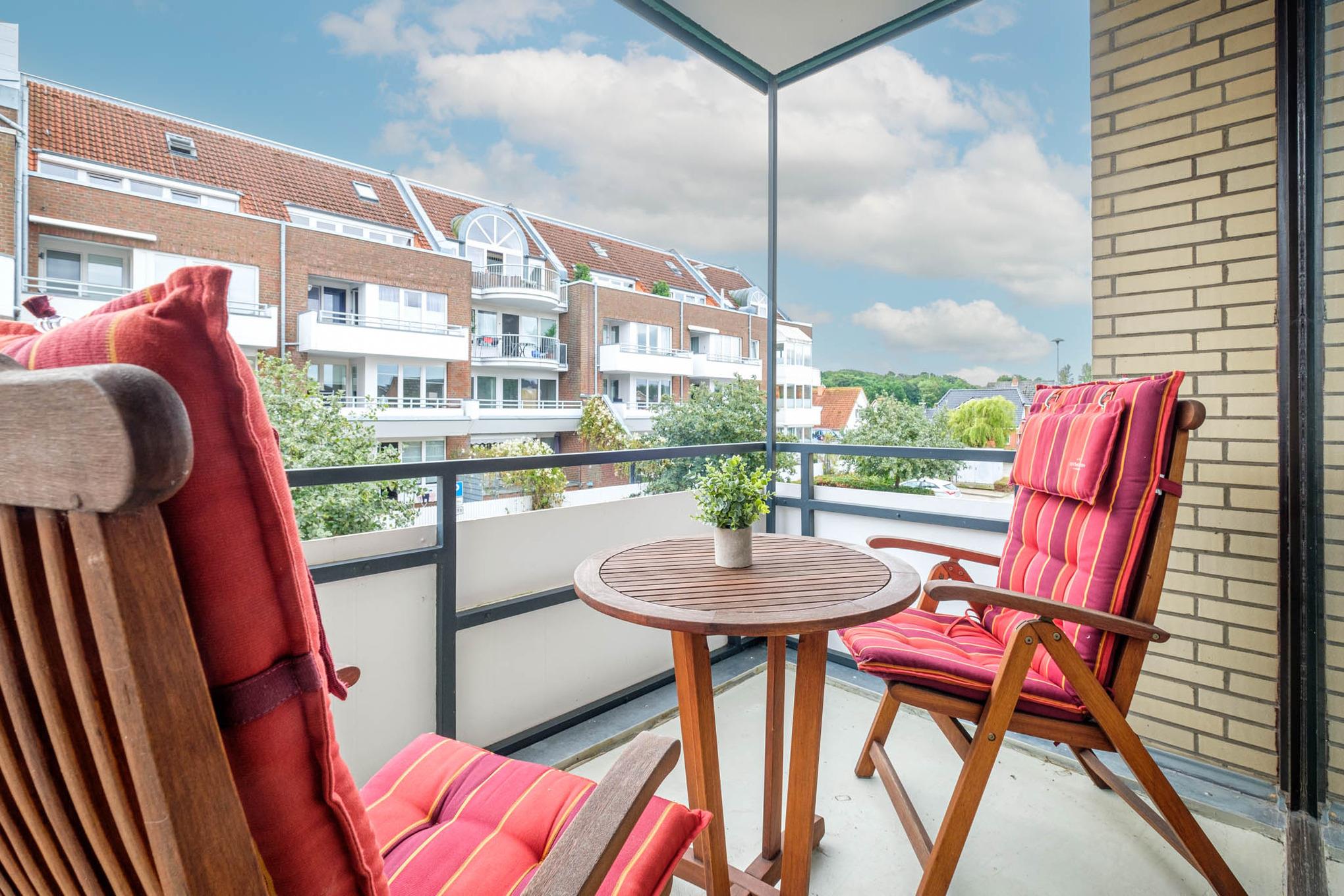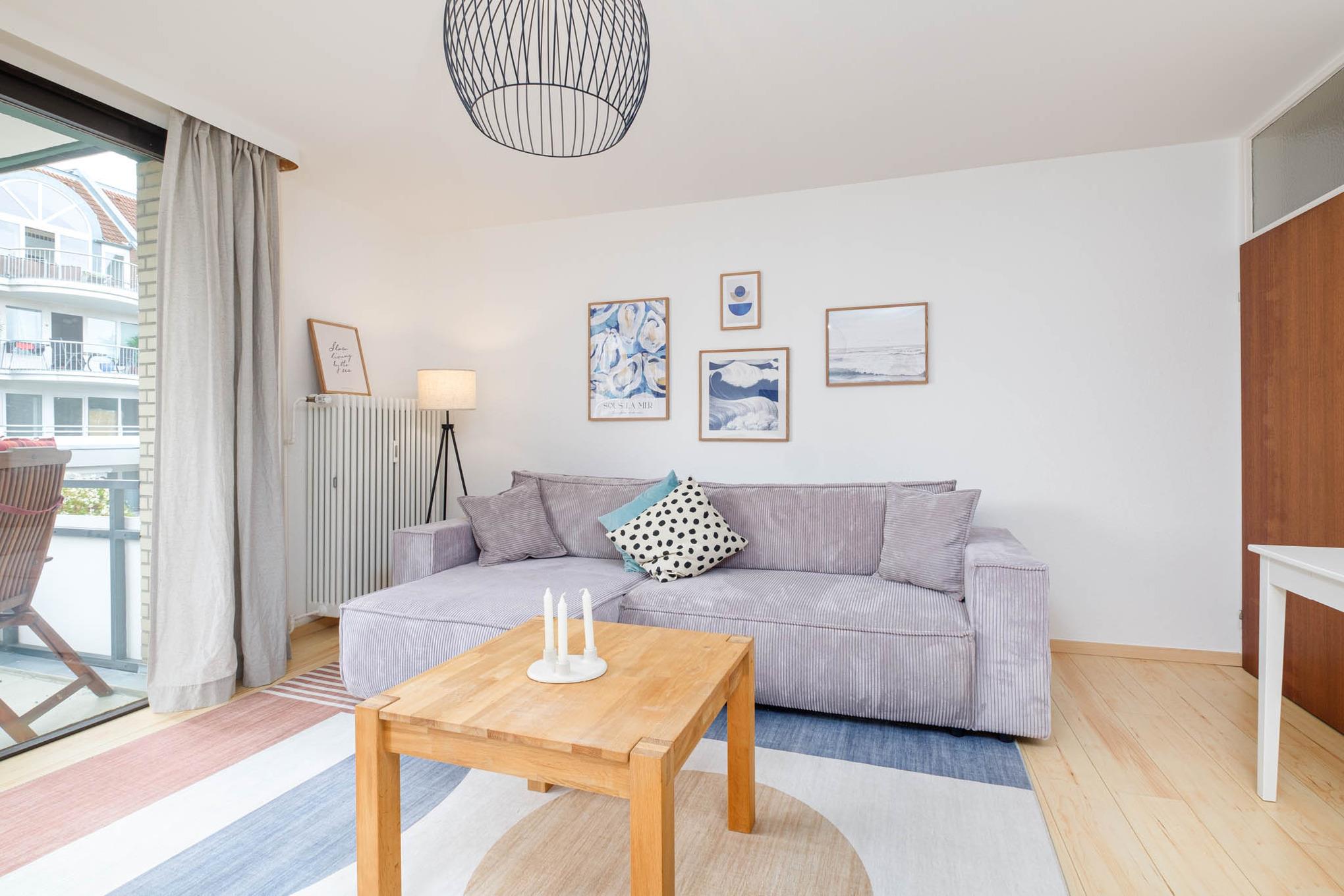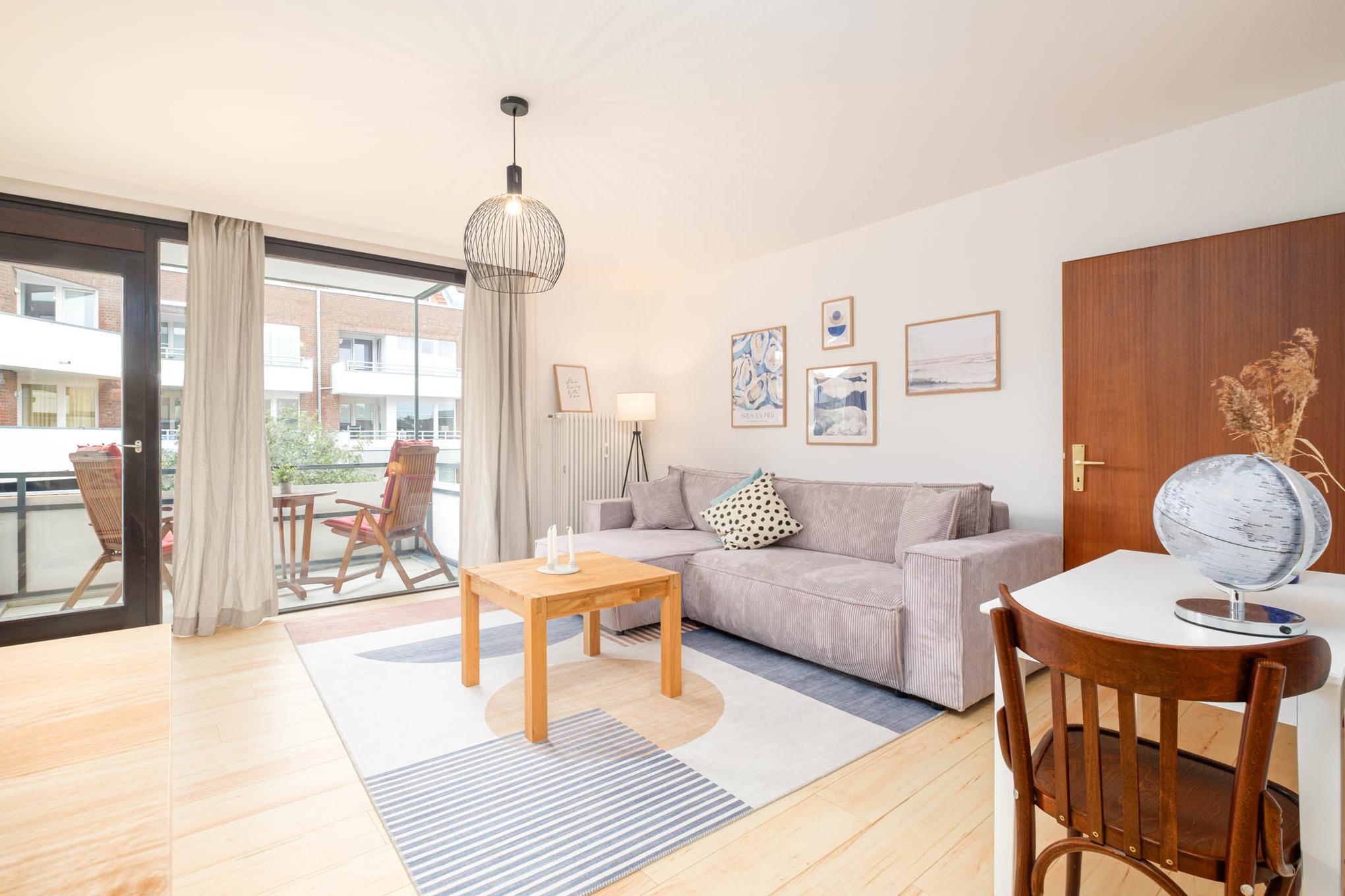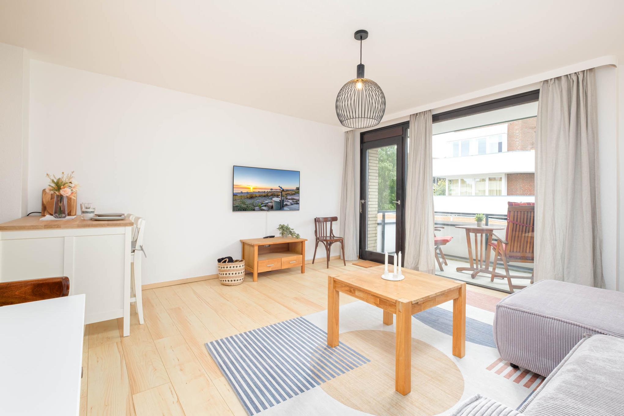 Es steht Ihnen ein gemütliches Schlafsofa (130x200 cm) zur Verfügung, ebenso wie ein Flatscreen-TV. Von hier aus erreichen Sie ebenfalls den überdachten Balkon in Nord-Ost-Ausrichtung. Hier genießen Sie den ersten Kaffee des Tages und starten entspannt in Ihren Urlaubstag.