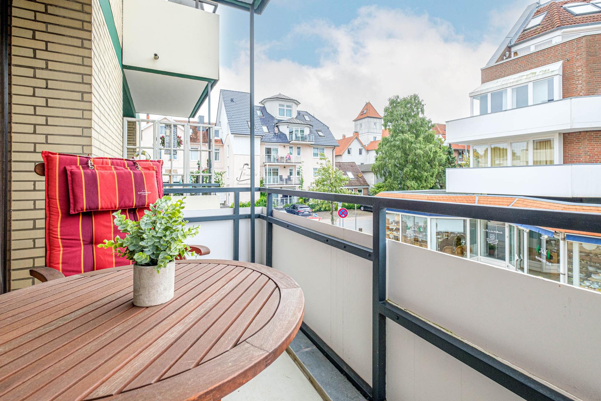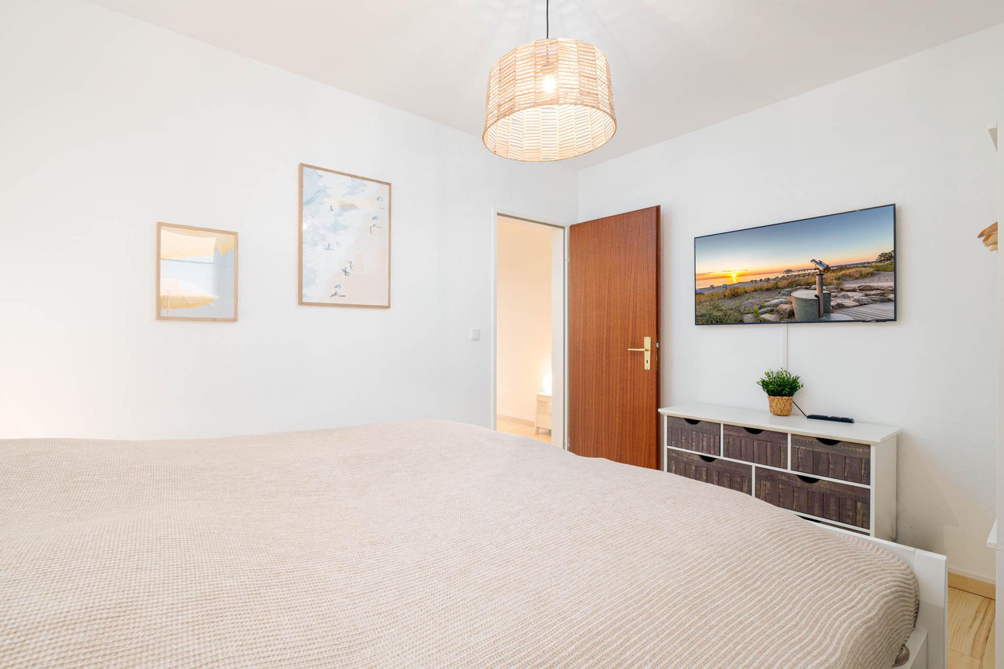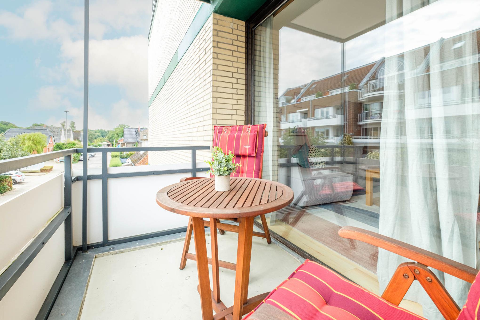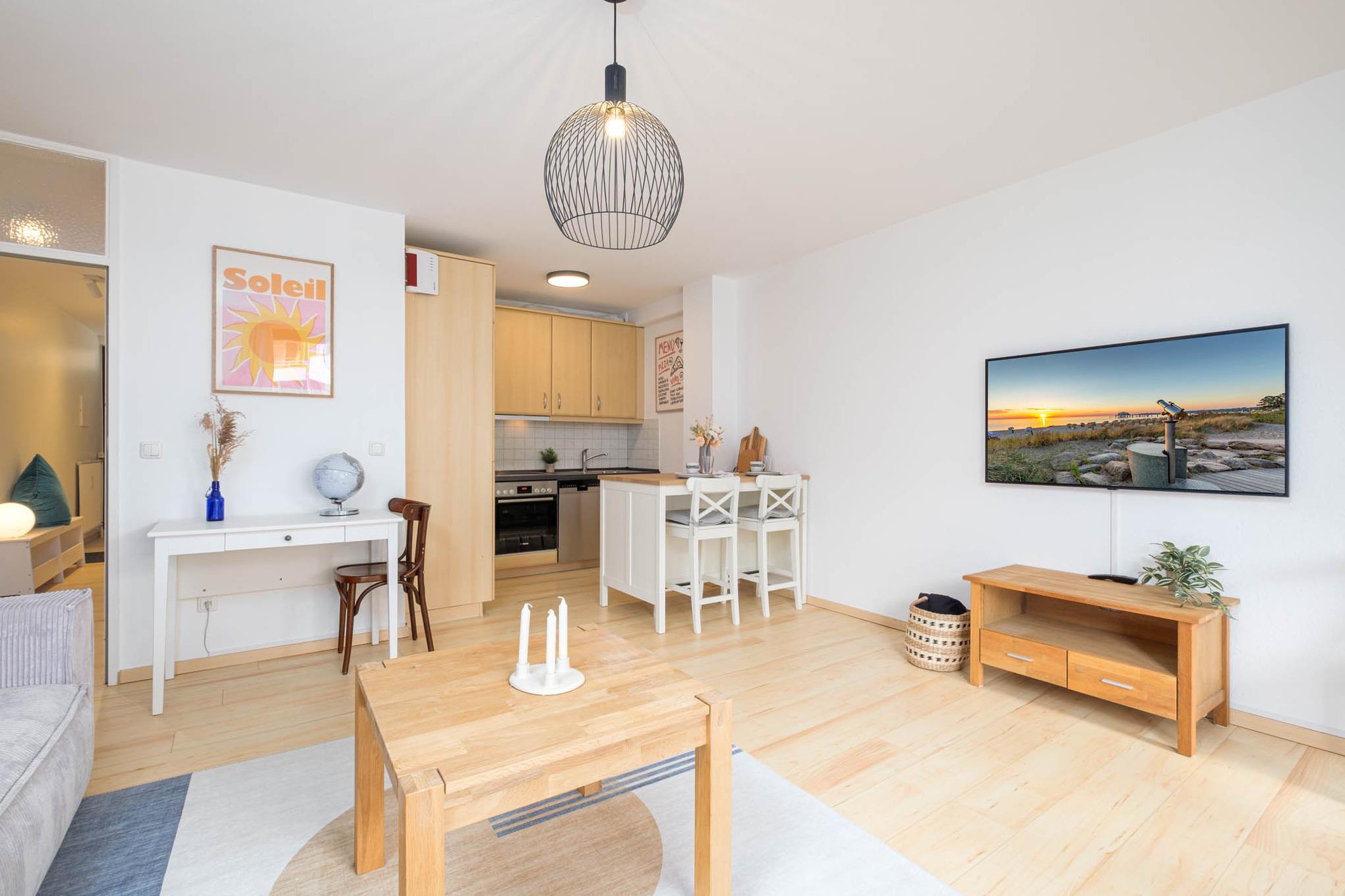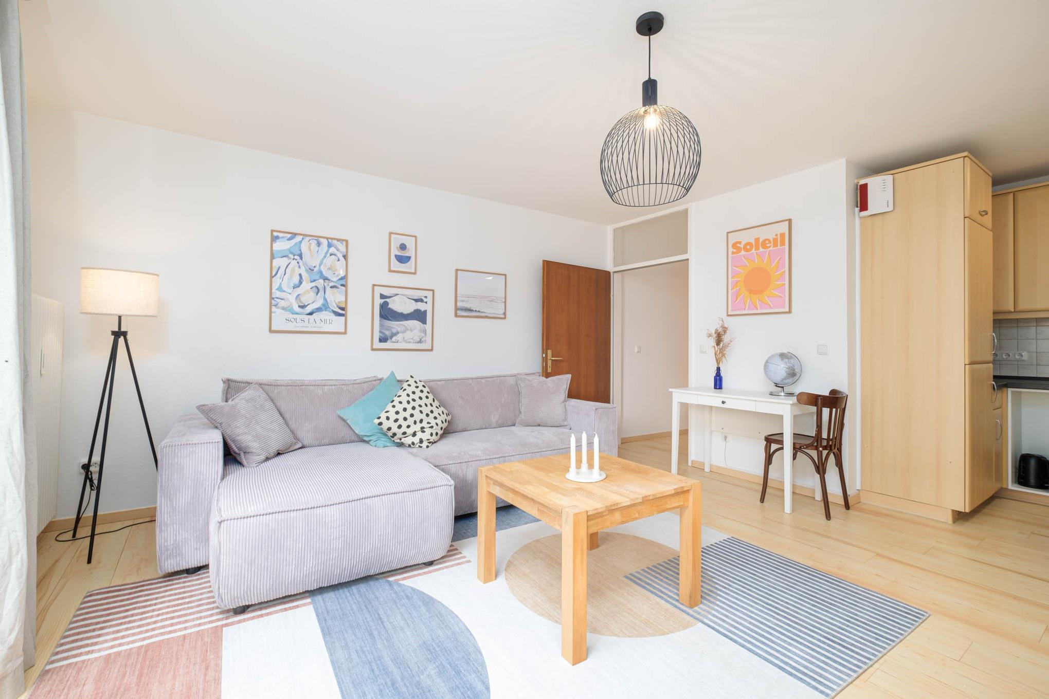 Es steht Ihnen ein gemütliches Schlafsofa (130x200 cm) zur Verfügung, ebenso wie ein Flatscreen-TV. Von hier aus erreichen Sie ebenfalls den überdachten Balkon in Nord-Ost-Ausrichtung. Hier genießen Sie den ersten Kaffee des Tages und starten entspannt in Ihren Urlaubstag.