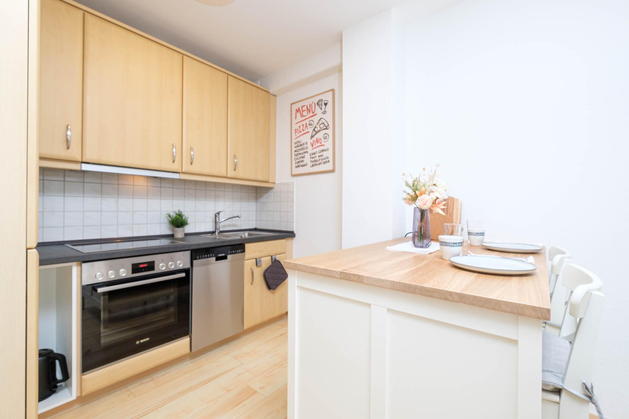 Die Ferienunterkunft verfügt über einen lichtdurchfluteten offenen Wohn- und Essbereich mit angrenzender Küche. Die Küche ist modern und rund um mit allem, was das kulinarische Herz höher schlagen lässt, ausgestattet - ein Kühlschrank mit Gefrierfach, ein Backofen, ein Cerankochfeld, ein Geschirrspüler, eine Filterkaffeemaschine, ein Toaster und ein Wasserkocher stehen für Sie bereit.