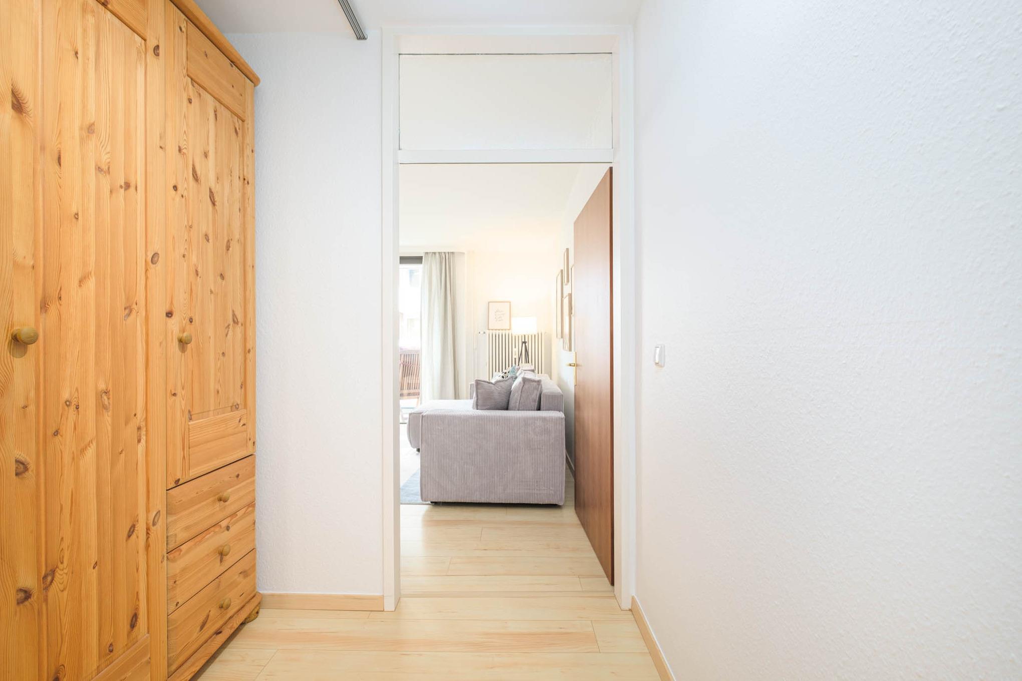 In der ersten Etage des Hauses begrüßen Sie die Wohnräume des 2-Zimmer-Appartements "Haus Boy, Appartement 2". Über einen großzügigen Flurbereich erreichen Sie das Schlafzimmer mit einem Doppelbett (180x200 cm) und den zweiten Fernseher. In der offenen Garderobe haben Sie genug Platz für Ihre Urlaubskleidung.