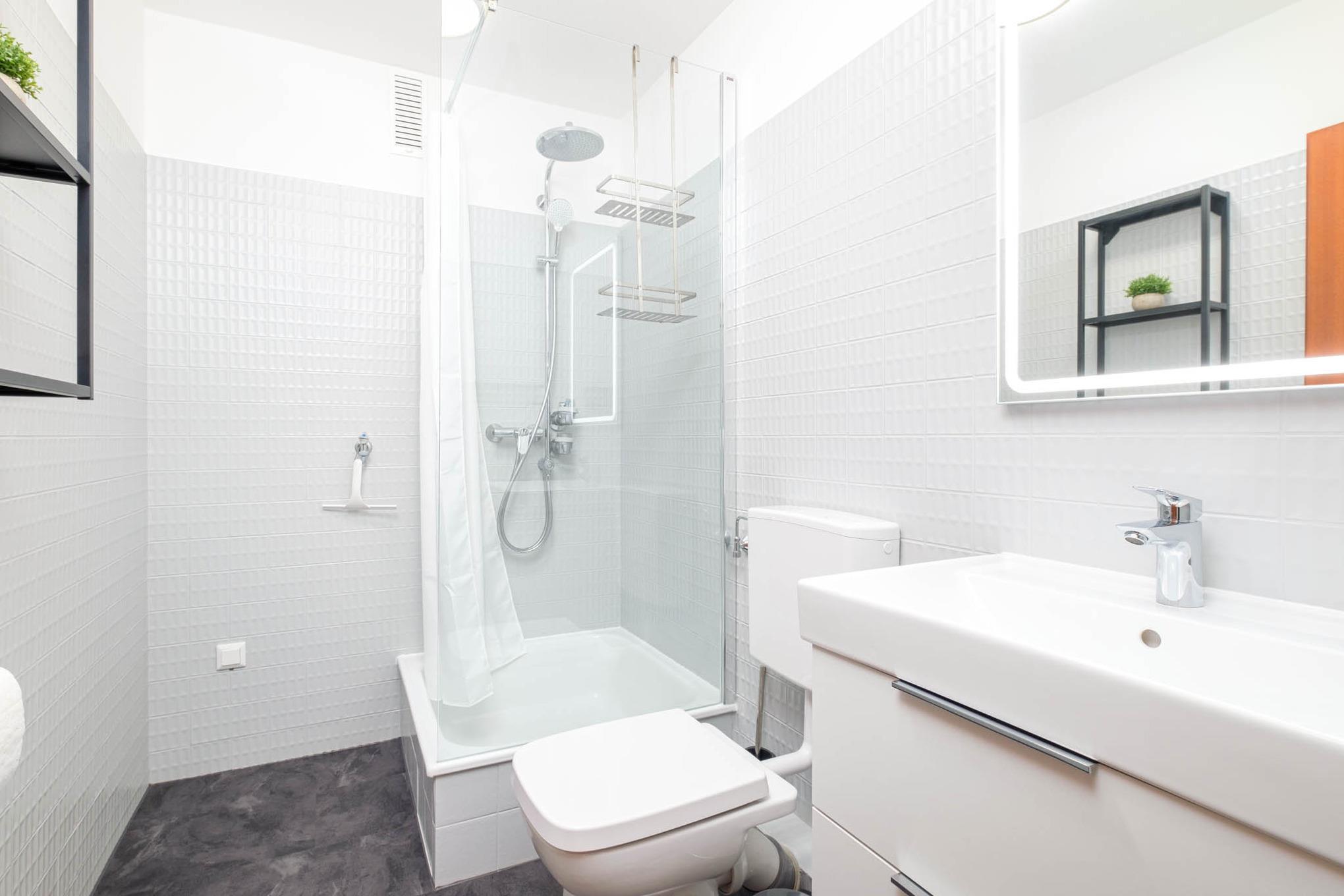 Im schicken Badezimmer erwartet Sie eine Dusche und WC.