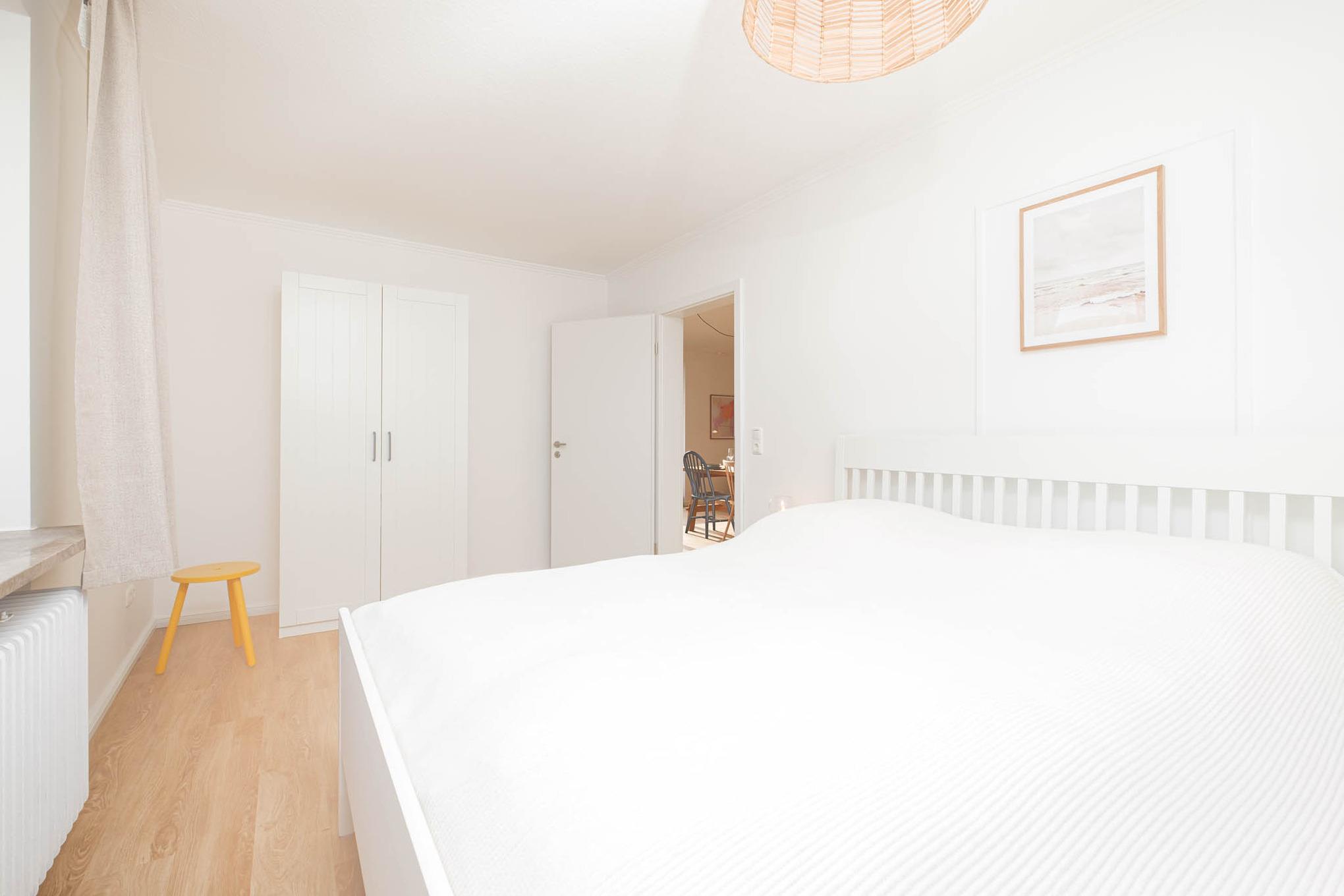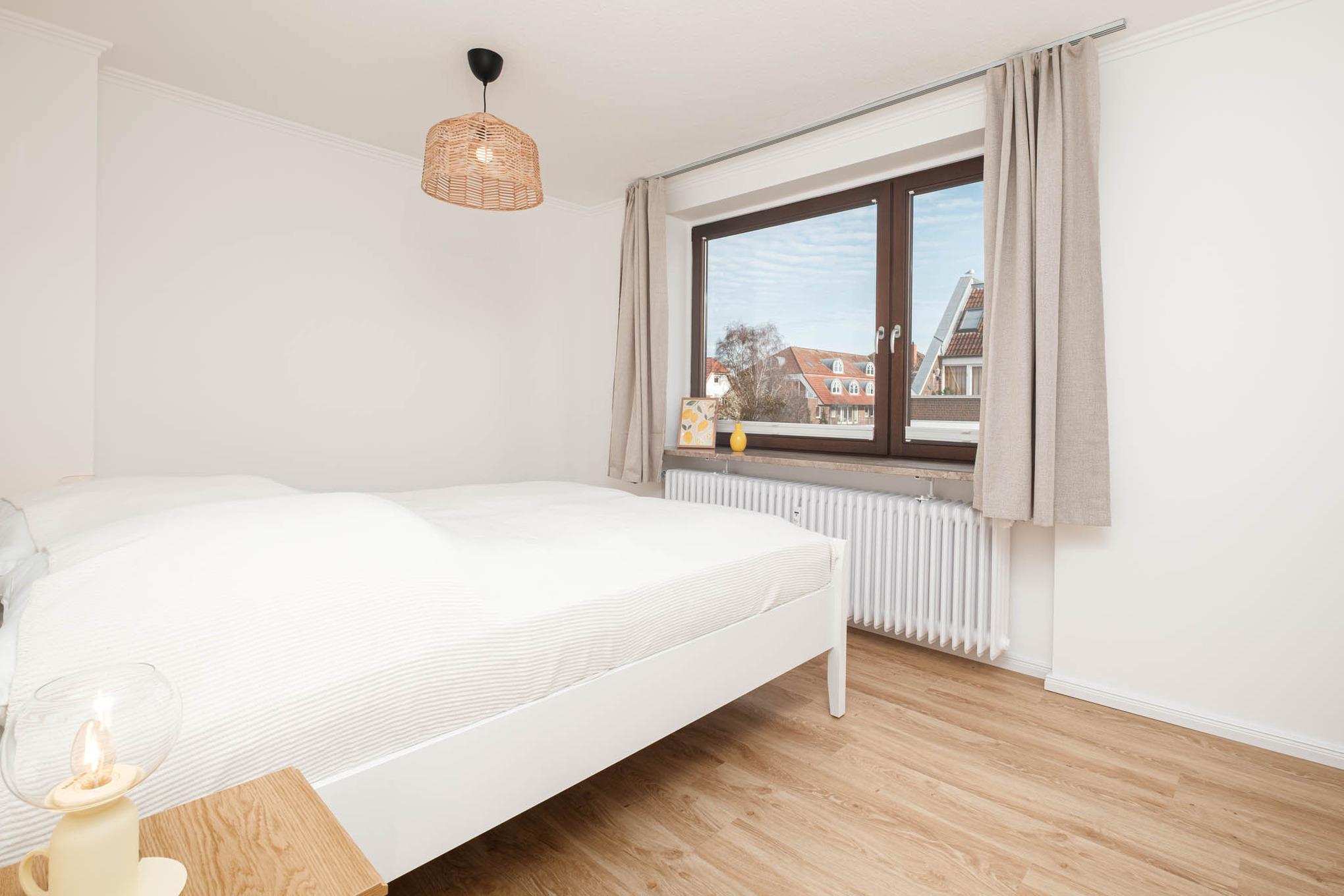 Zwei gemütliche Schlafzimmer mit Doppelbetten (180 × 200 cm, getrennte Matratzen) und Verdunkelungsvorhängen sorgen für erholsame Nächte und süße Träume nach einem Tag am Strand. Im Wohnbereich steht zusätzlich eine Schlafcouch (140 × 200 cm) bereit – ideal, wenn Sie mit mehreren Personen reisen oder etwas Flexibilität wünschen.