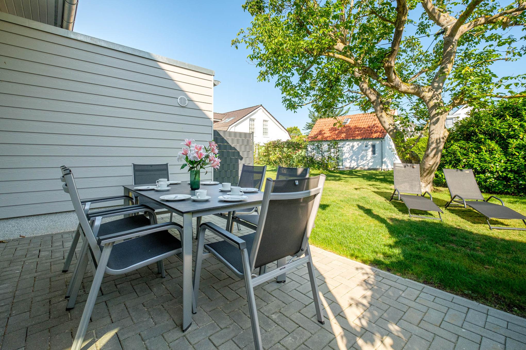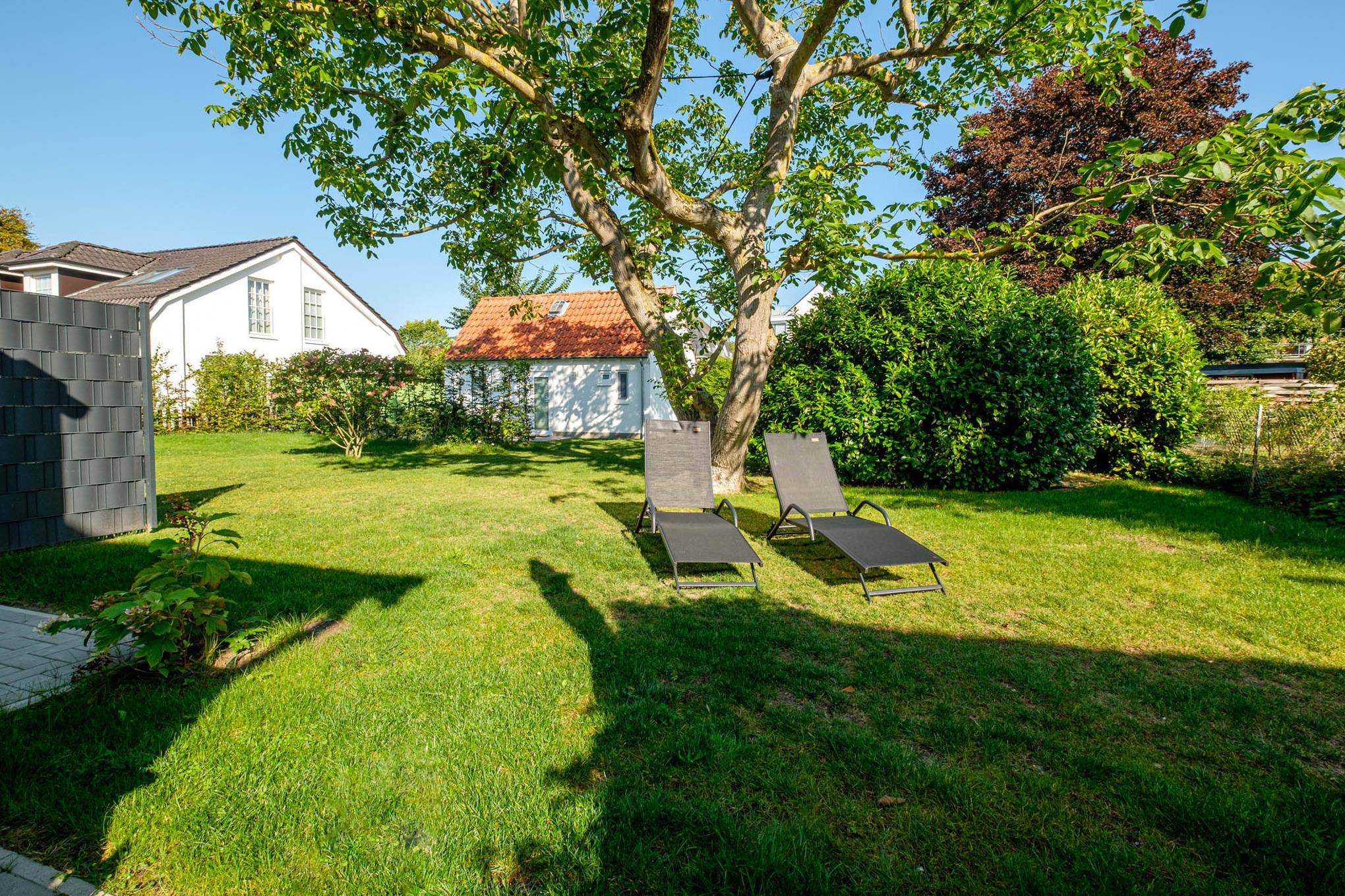 Abgerundet wird dieses geschmackvoll eingerichtete Traumdomizil durch die dem Wohnbereich angeschlossene Terrasse in Ausrichtung Nord/Nord-West mit Zugang zum Garten, den Sie sich mit der benachbarten Doppelhaushälfte "Bude A" teilen. Gönnen Sie sich am Morgen einen Moment bei einer Tasse Kaffee und atmen Sie ein wenig frische Ostseeluft. Während sich die Kinder im Garten rund um den schönen Nussbaum austoben, tanken Sie neue Energie und genießen den Moment für sich.