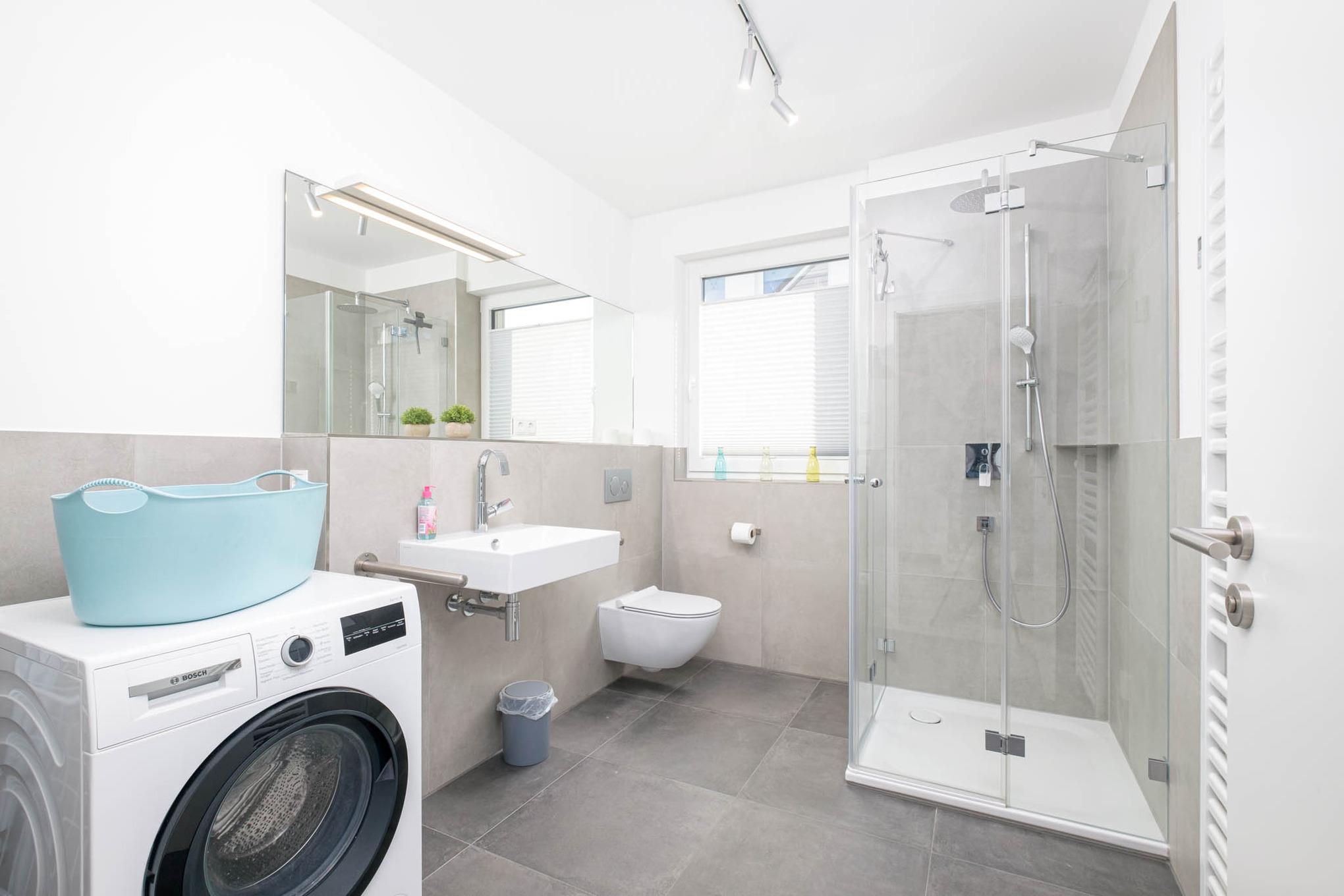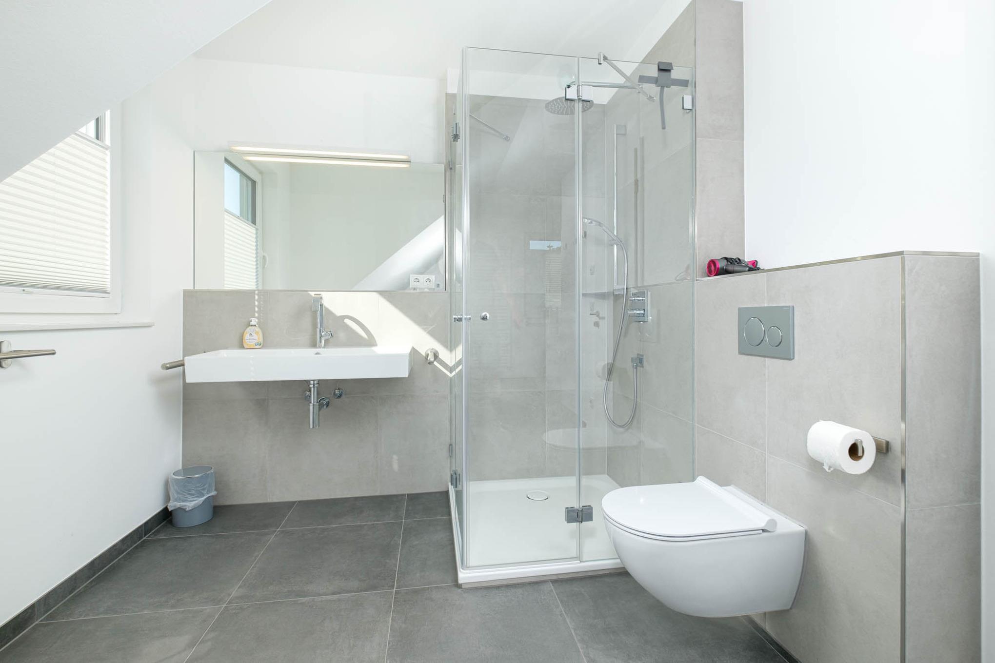 Auf dieser Wohnebene geht vom Flur zudem das Badezimmer I mit WC, Dusche, Waschmaschine, Wäscheständer und Handtuchtrockner ab.