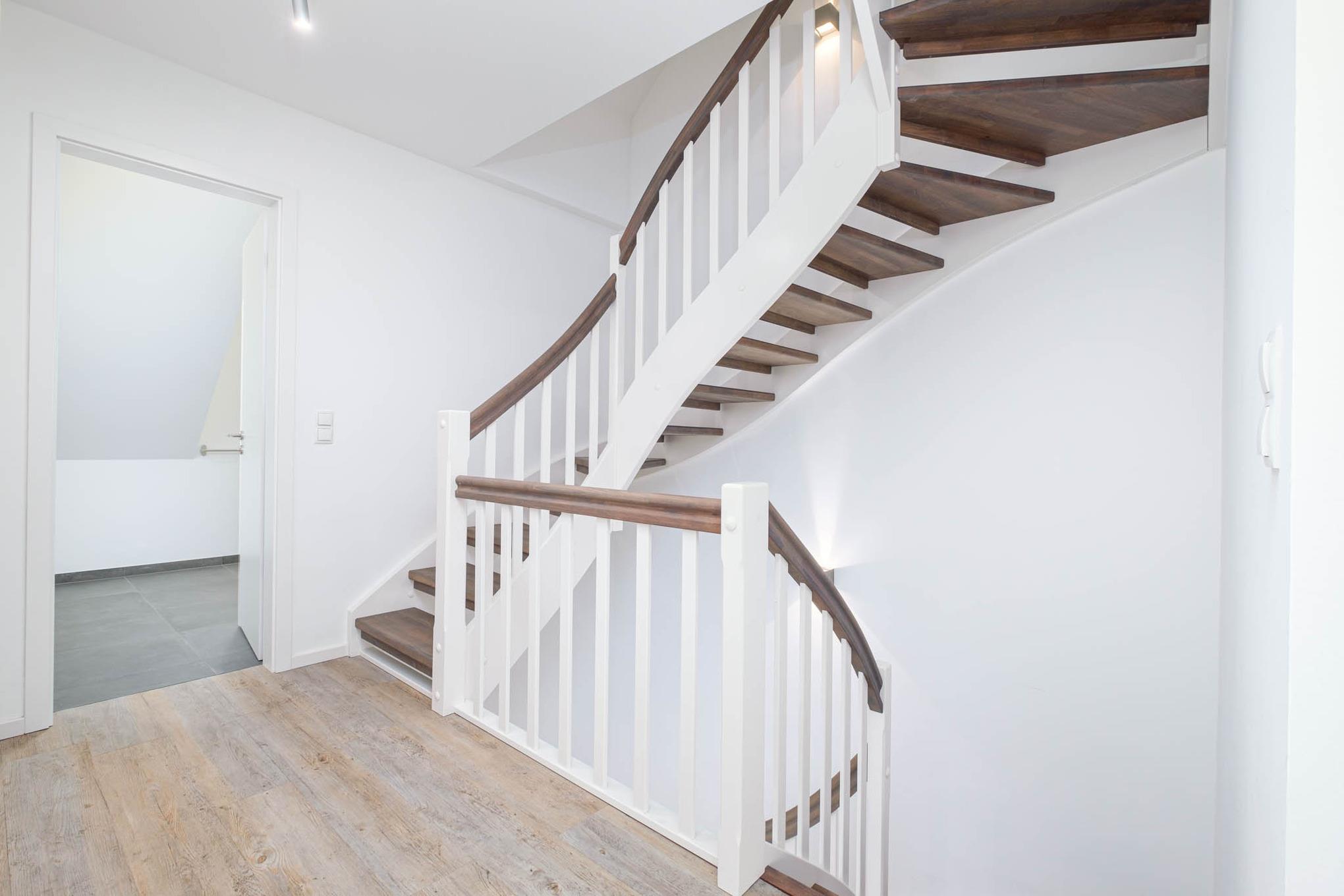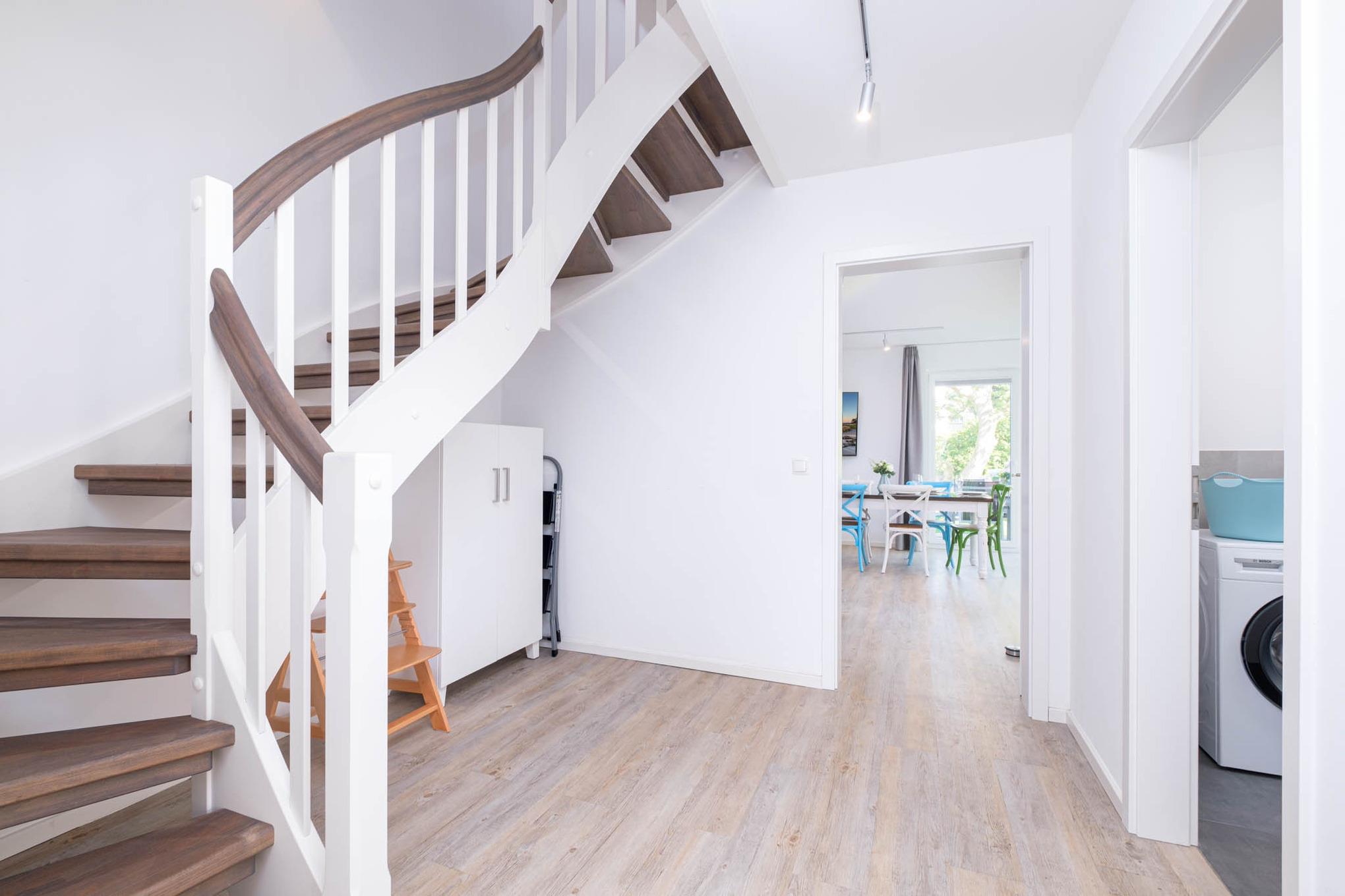 Der großzügige Flurbereich der Doppelhaushälfte wird vom Tageslicht, das durch die großen Fensterfronten des Wohnzimmers bis in den Flur fällt, schön ausgeleuchtet.