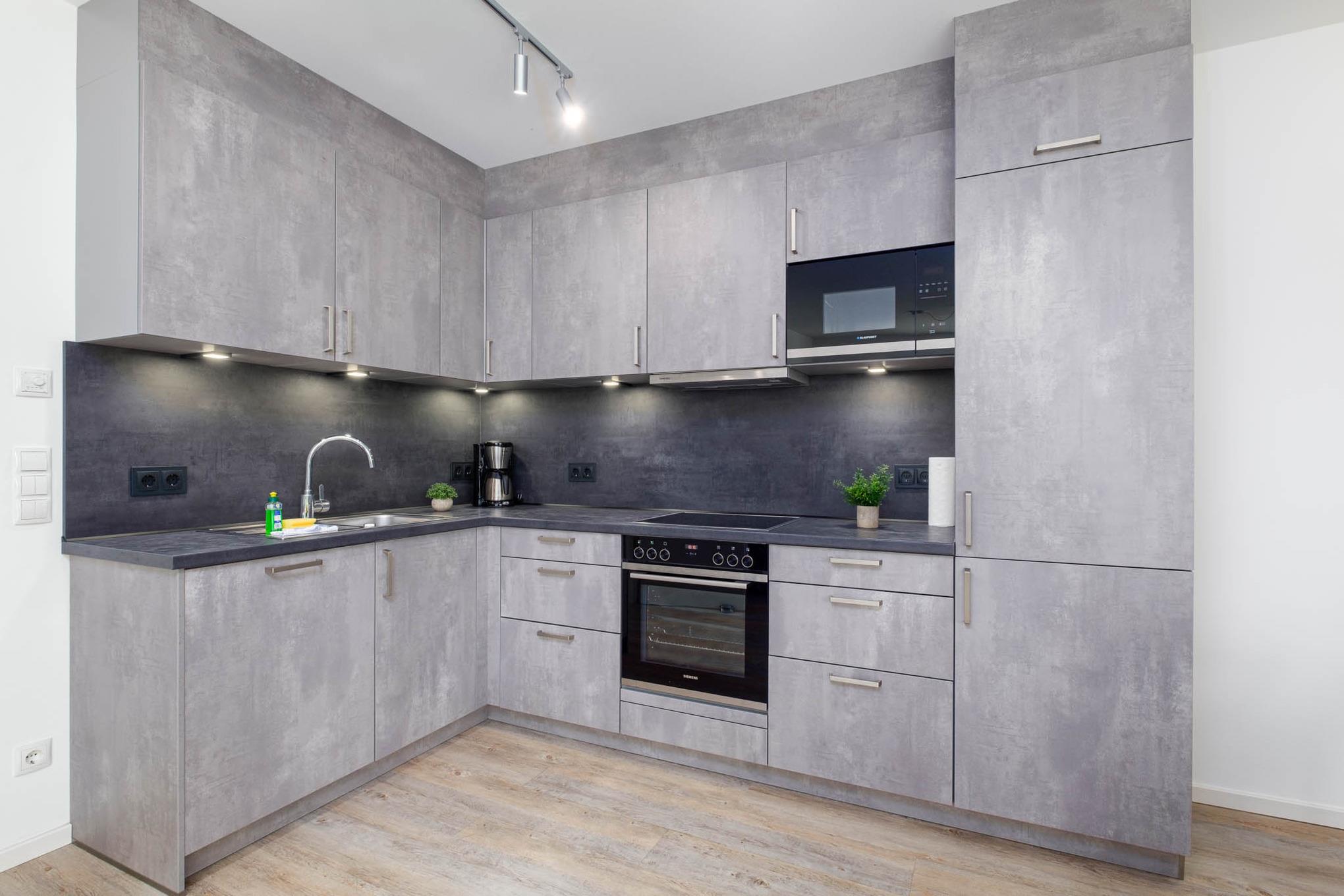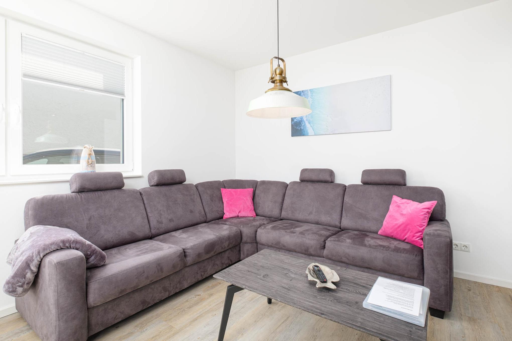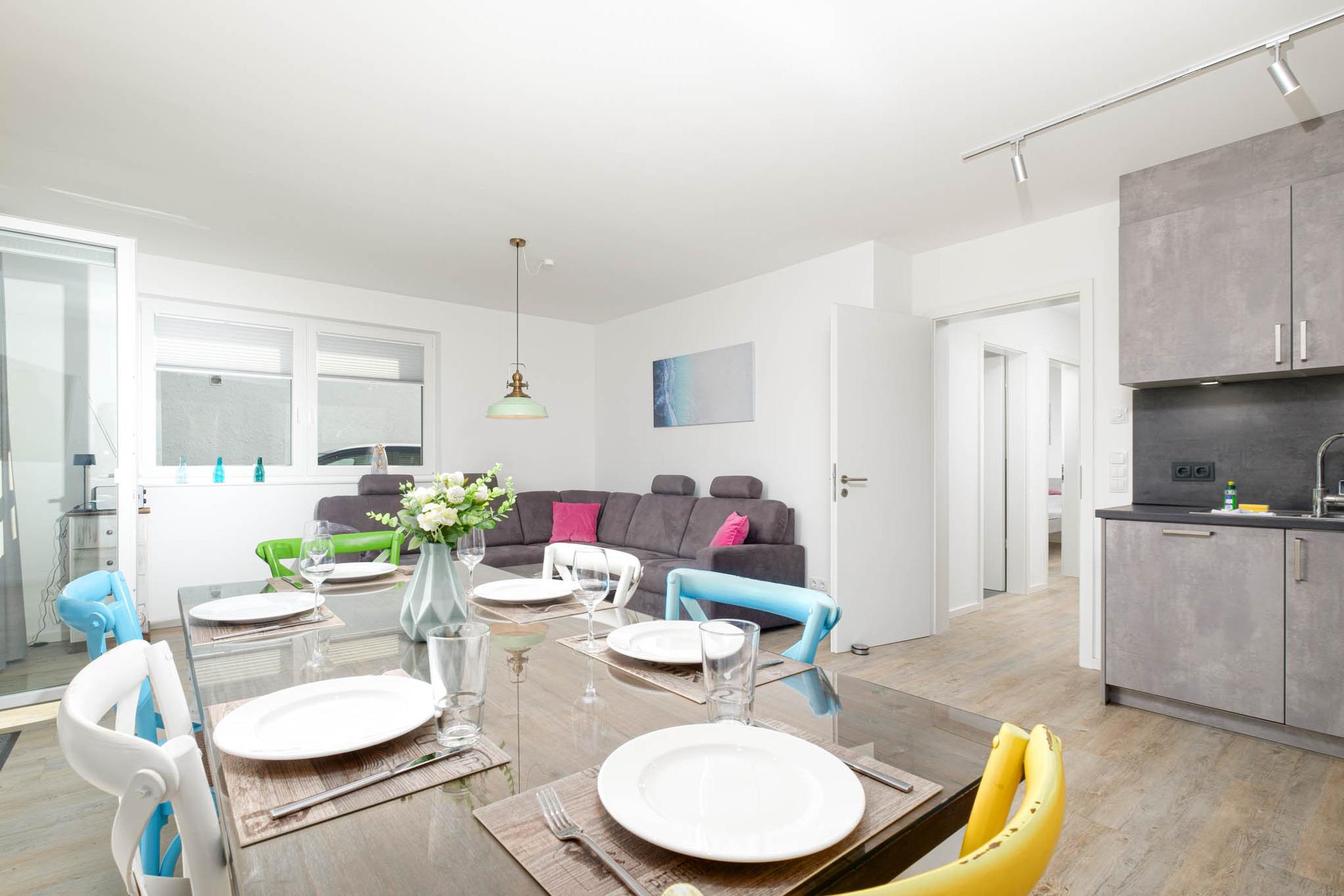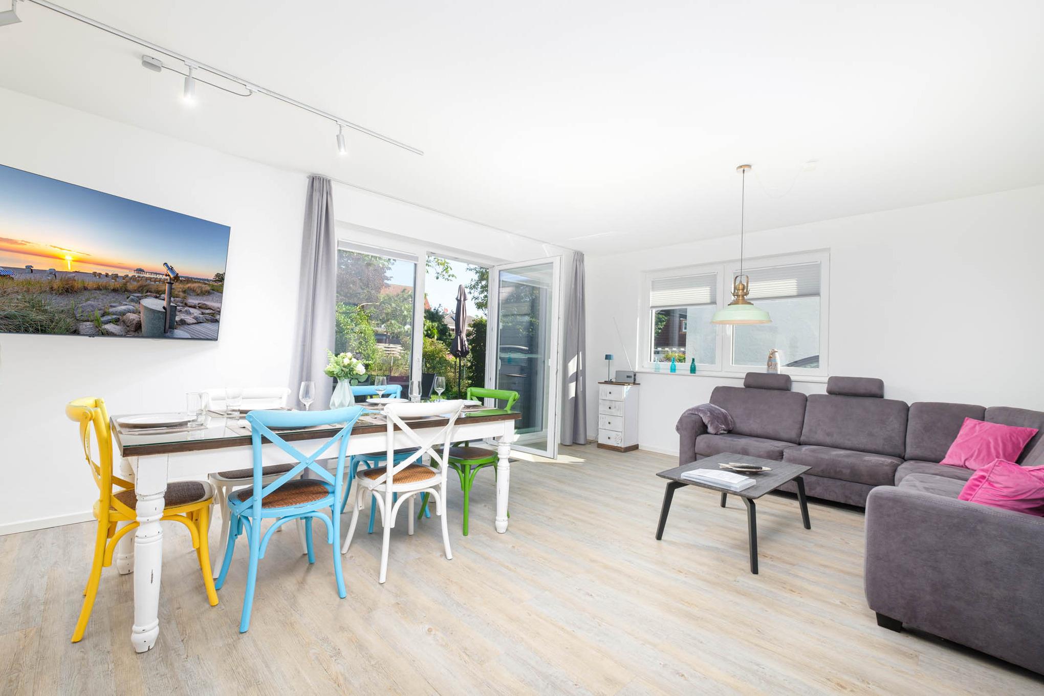 Der Blick geht direkt weiter in den angeschlossenen Wohnraum. Es erwarten Sie und Ihre Liebsten eine komfortable Couchgarnitur, die zu langen Spielabenden einlädt, ein TV sowie der offene Essbereich mit hochwertiger, moderner und voll ausgestatteter Küche. Vom Induktionskochfeld, über den Backofen, die Mikrowelle, Geschirrspüler, Kühl- und Gefrierschrank bis zur großzügigen Ausstattung an Geschirr und Besteck - nach Herzenslust kann gekocht und gebacken werden und ausreichend Arbeitsfläche ist ebenso vorhanden, um die Kleinsten mit einzubinden.