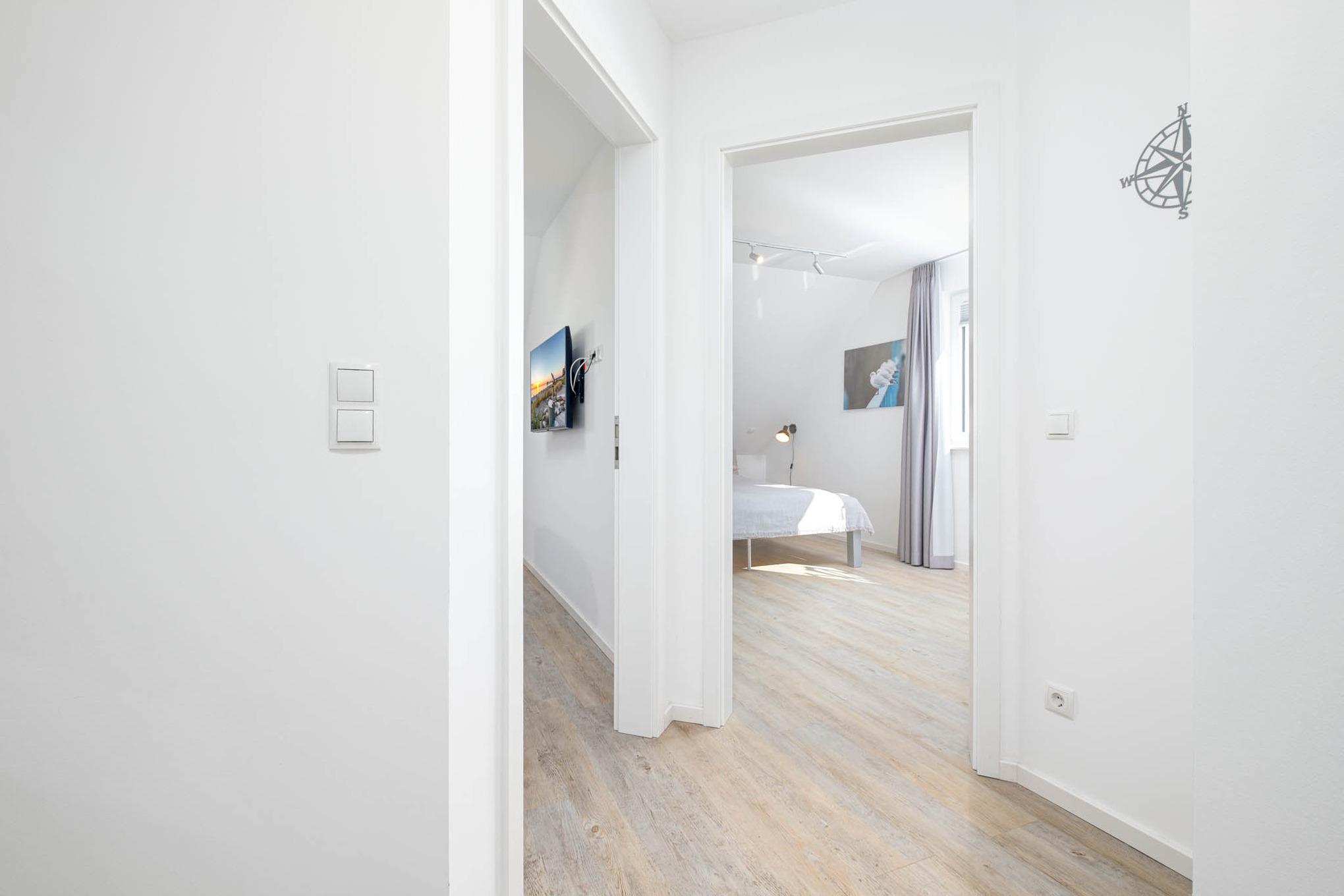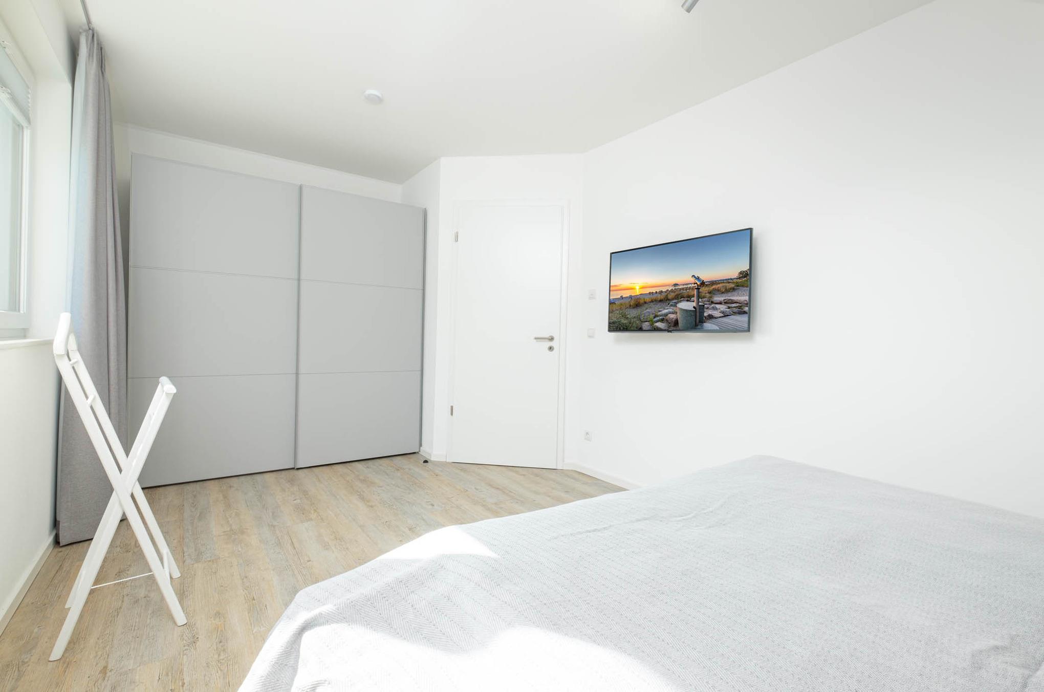 Eine Etage höher - im 1. Obergeschoss - sind das Schlafzimmer II und III gelegen. Beide bieten Ihnen für den wohlverdienten Erholungsschlaf, wie auch das Schlafzimmer I, je ein Doppelbett (1,80 x 2,00m, getrennte Matratzen) sowie einen weiteren TV und in Form von großen Kleiderschränken eine Möglichkeit, Ihr Reisegepäck ordentlich zu verstauen.