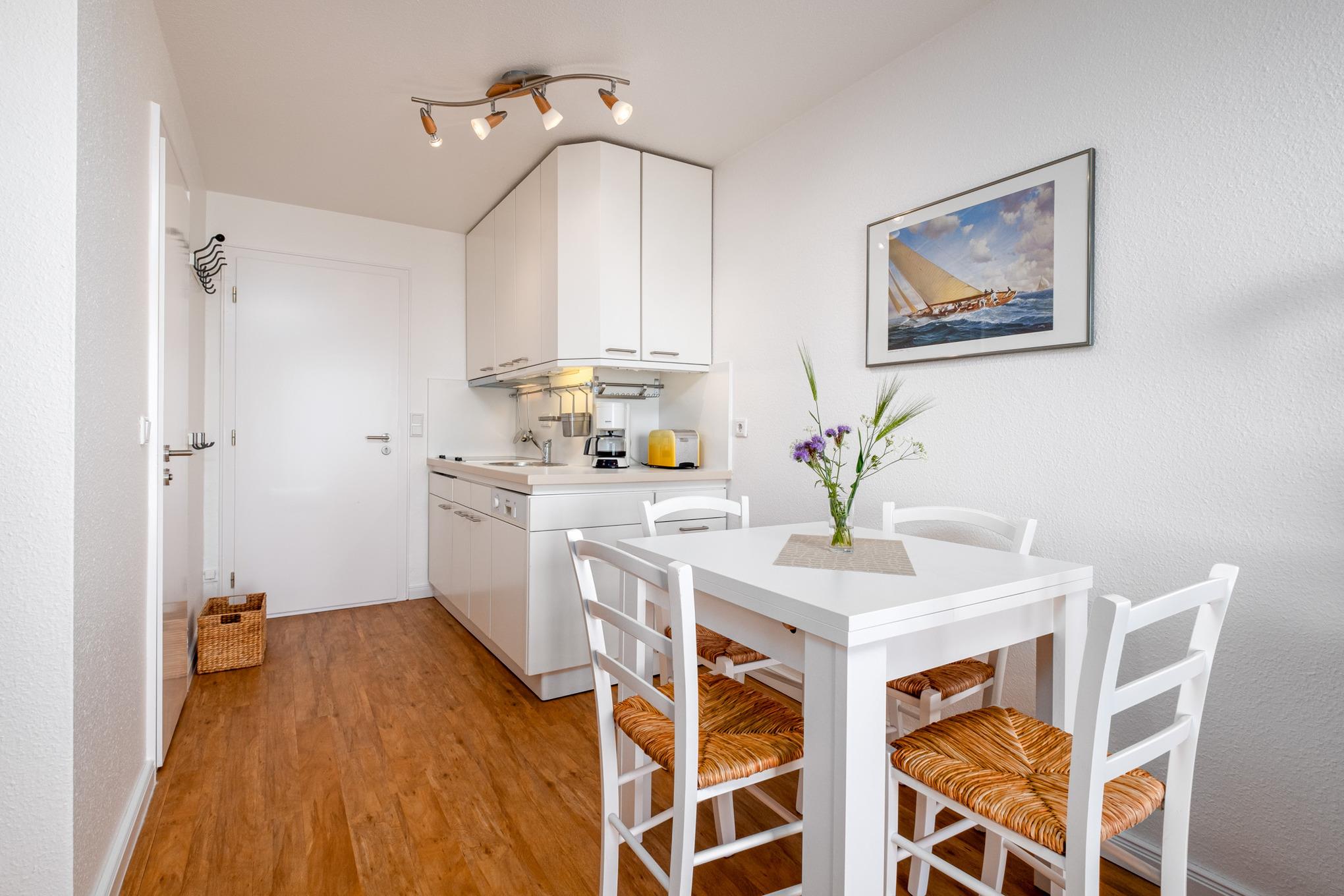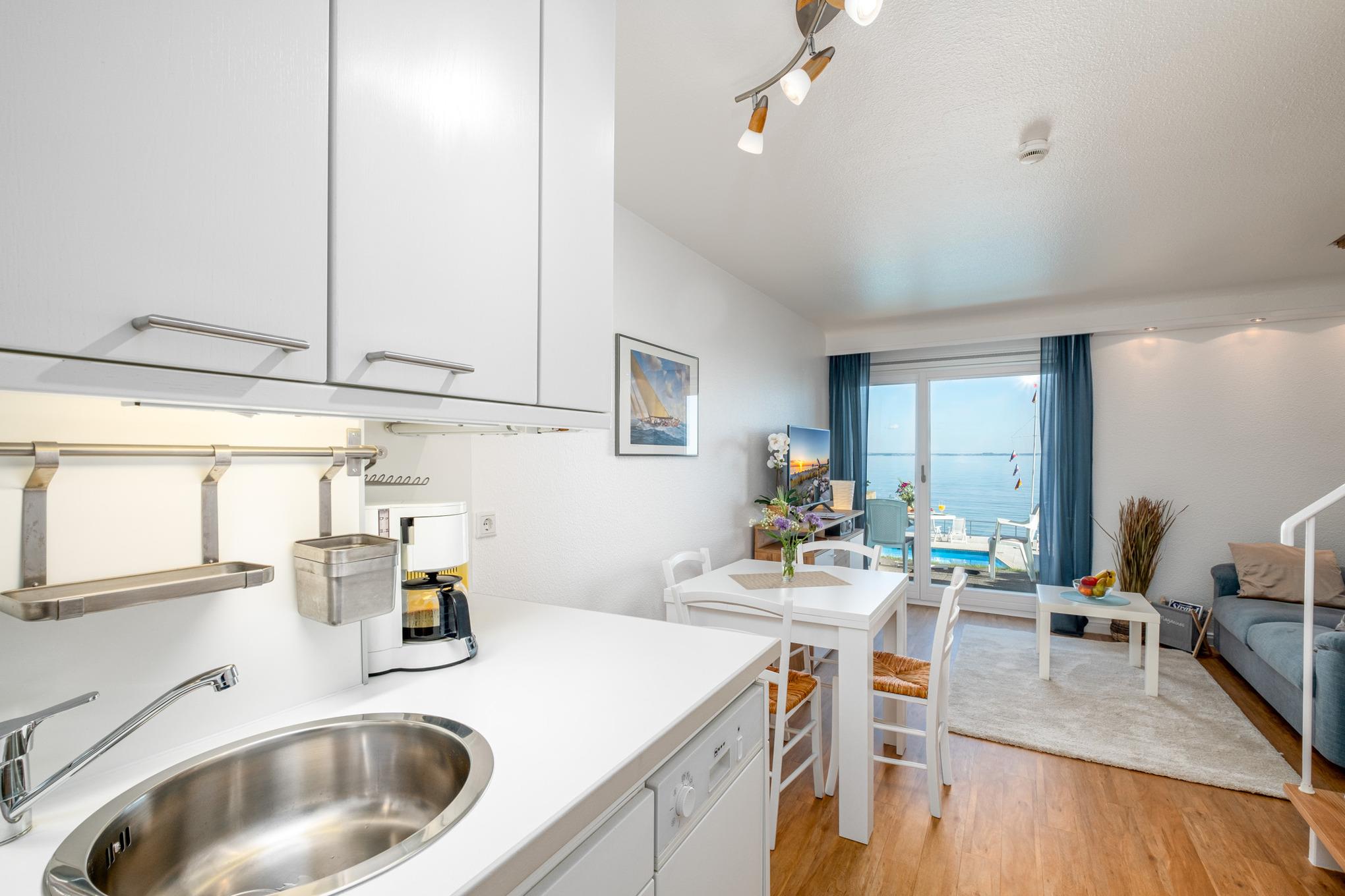 Der Küchenbereich ist mit einem Cerankochfeld, Geschirrspüler, Wasserkocher, Toaster, Kaffeemaschine und einem Kühlschrank ausgestattet. Ebenfalls ist auf dieser Ebene das Badezimmer mit Dusche, WC und Waschbecken.
