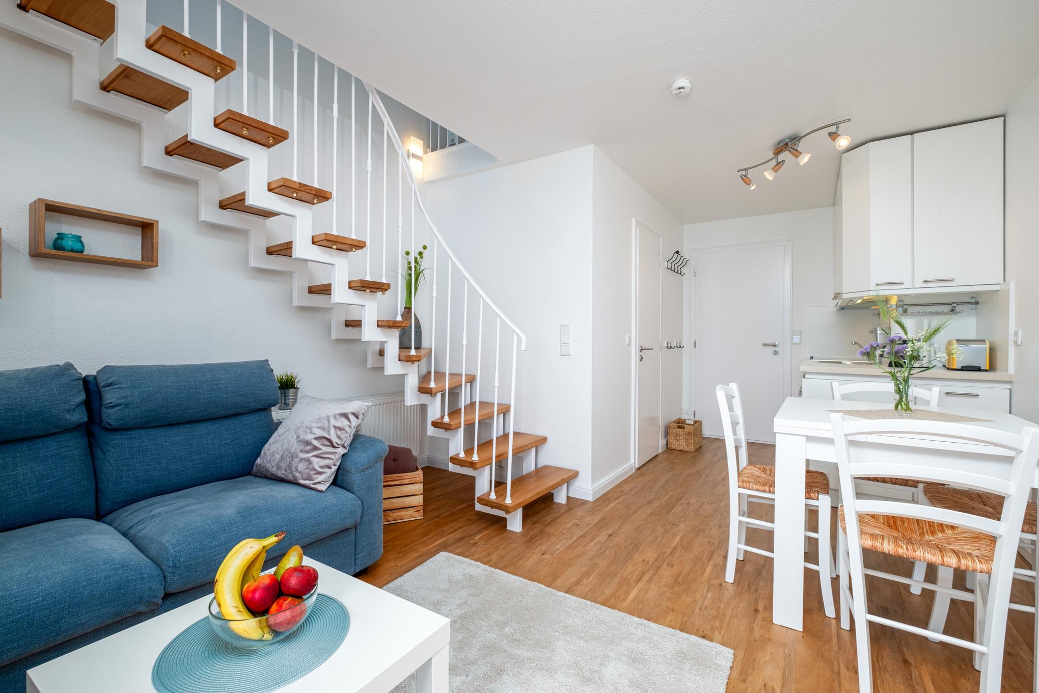 Die Ferienwohnung geht über 2 Ebenen. Im Erdgeschoss erwartet Sie das Wohnzimmer mit hochwertiger Couchgarnitur, großem Flatscreen-TV mit Kabelanschluss und gemütlichem Essbereich für vier Personen.