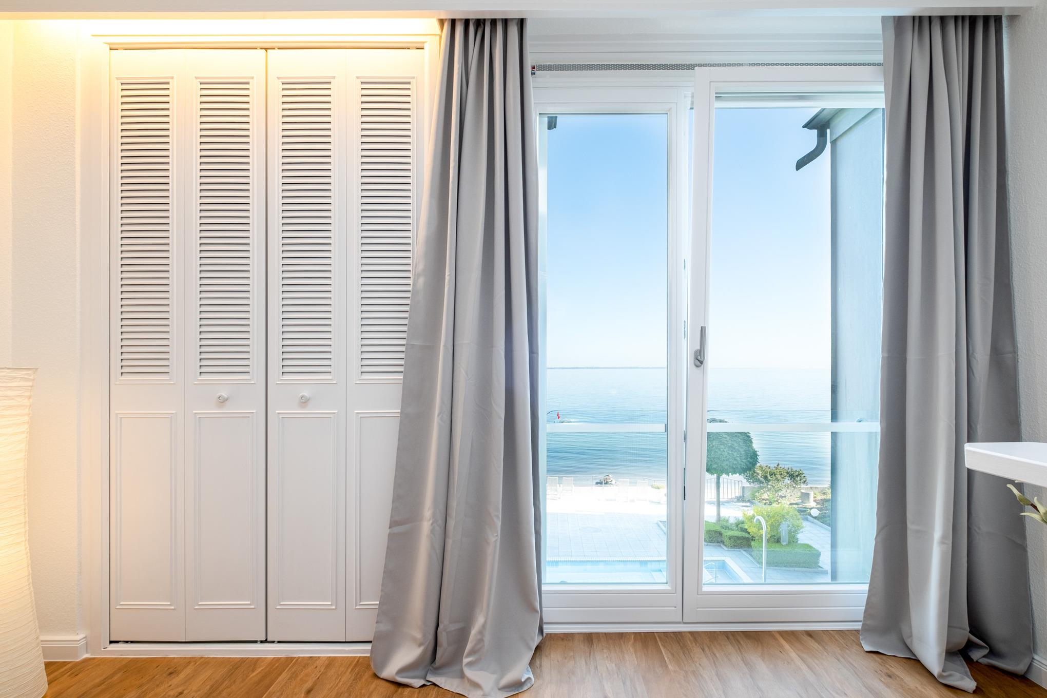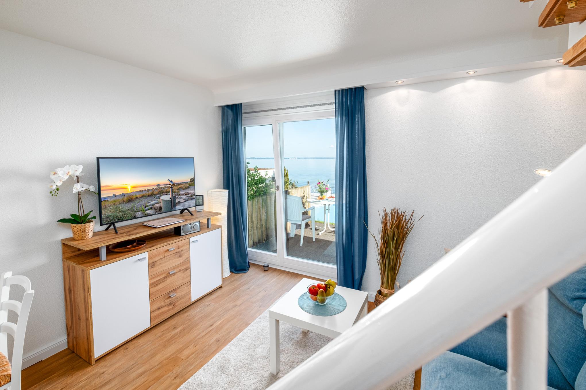 Über die Treppe im Wohnzimmer erreichen Sie den offenen Maisonettebereich mit dem Schlafzimmer. Das Schlafzimmer verfügt über ein komfortables Boxspringbett mit direktem Meerblick (180x200cm und durchgängige Liegefläche durch Topper) sowie eine bequeme Schlafcouch (140x190cm). Hier steht Ihnen darüber hinaus ein zweiter TV zur Verfügung.
