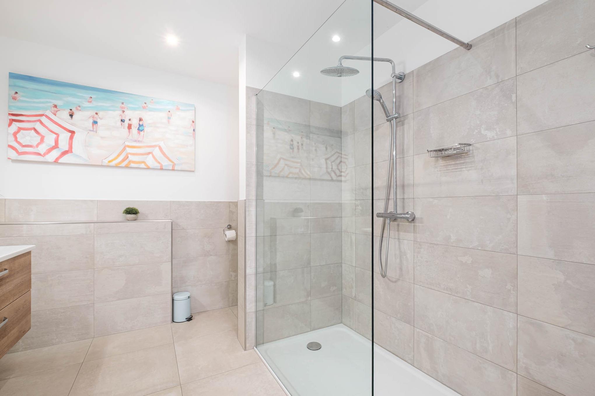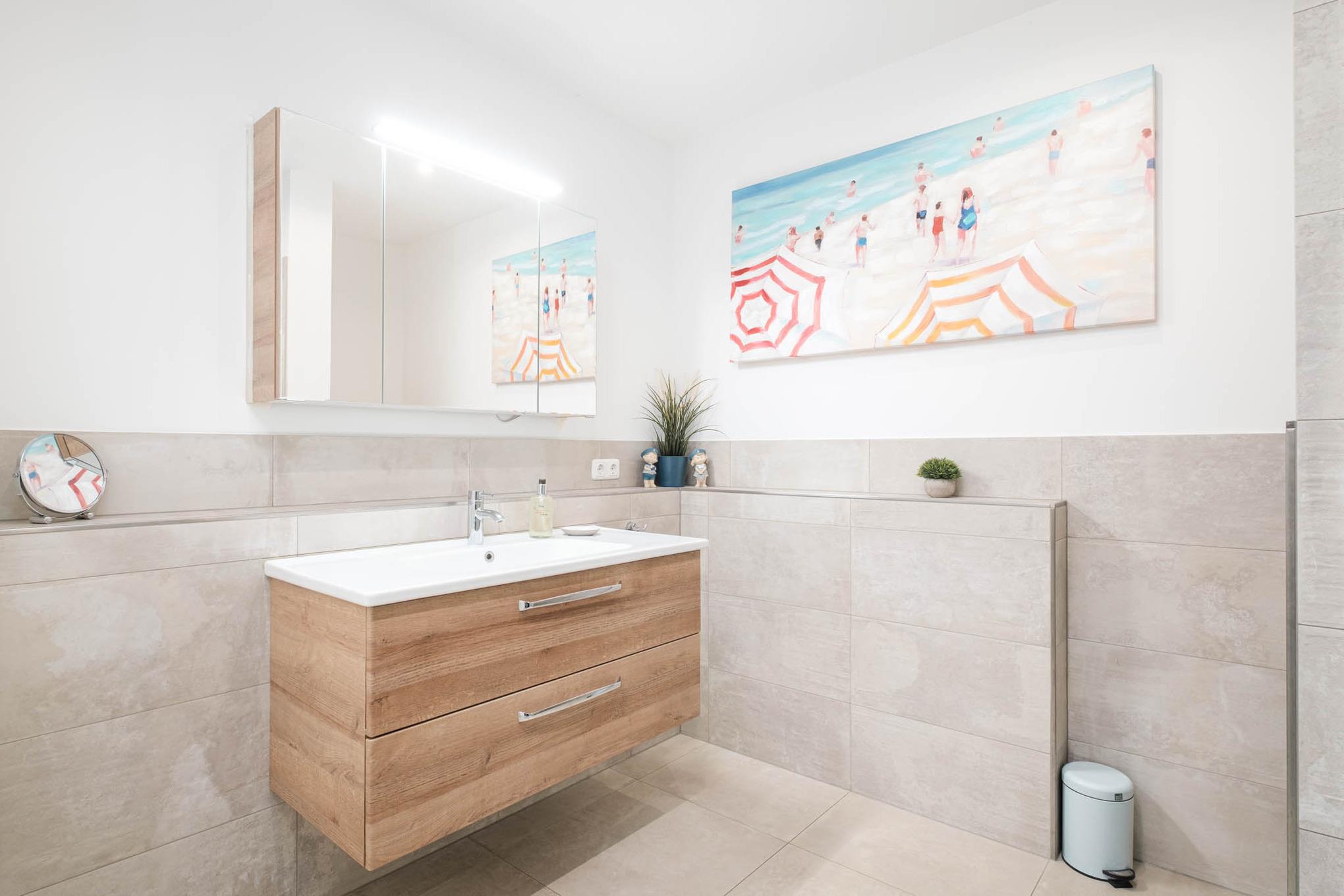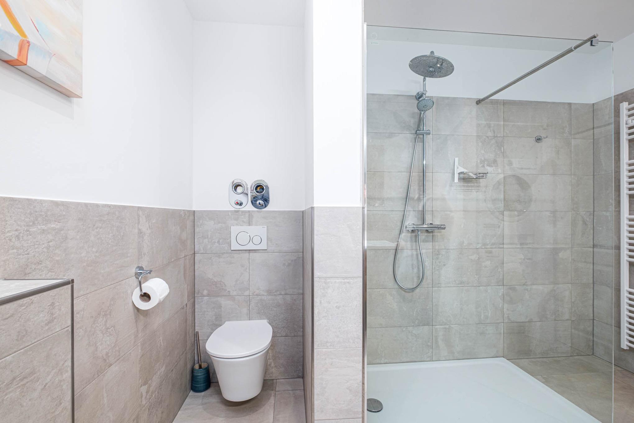 Das Badezimmer mit der großen, bodengleichen Dusche bietet ebenfalls viel Platz und einen gehobenen Komfort. Hier erwarten Sie zusätzlich eine Waschmaschine sowie ein Trockner, beides können Sie kostenlos benutzen.