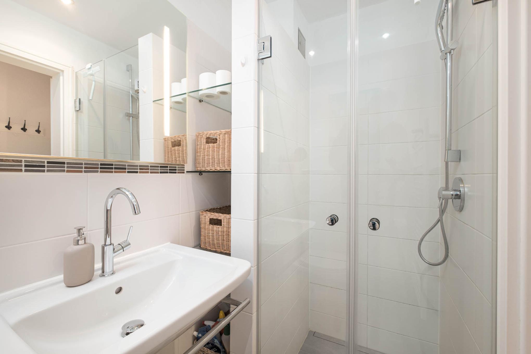 Im Appartement befindet sich ein Badezimmer mit Dusche. Der möblierte Balkon mit einem Sonnenschirm rundet diese wunderschöne Ferienwohnung für 4 Personen in Niendorf an der Ostsee ab.