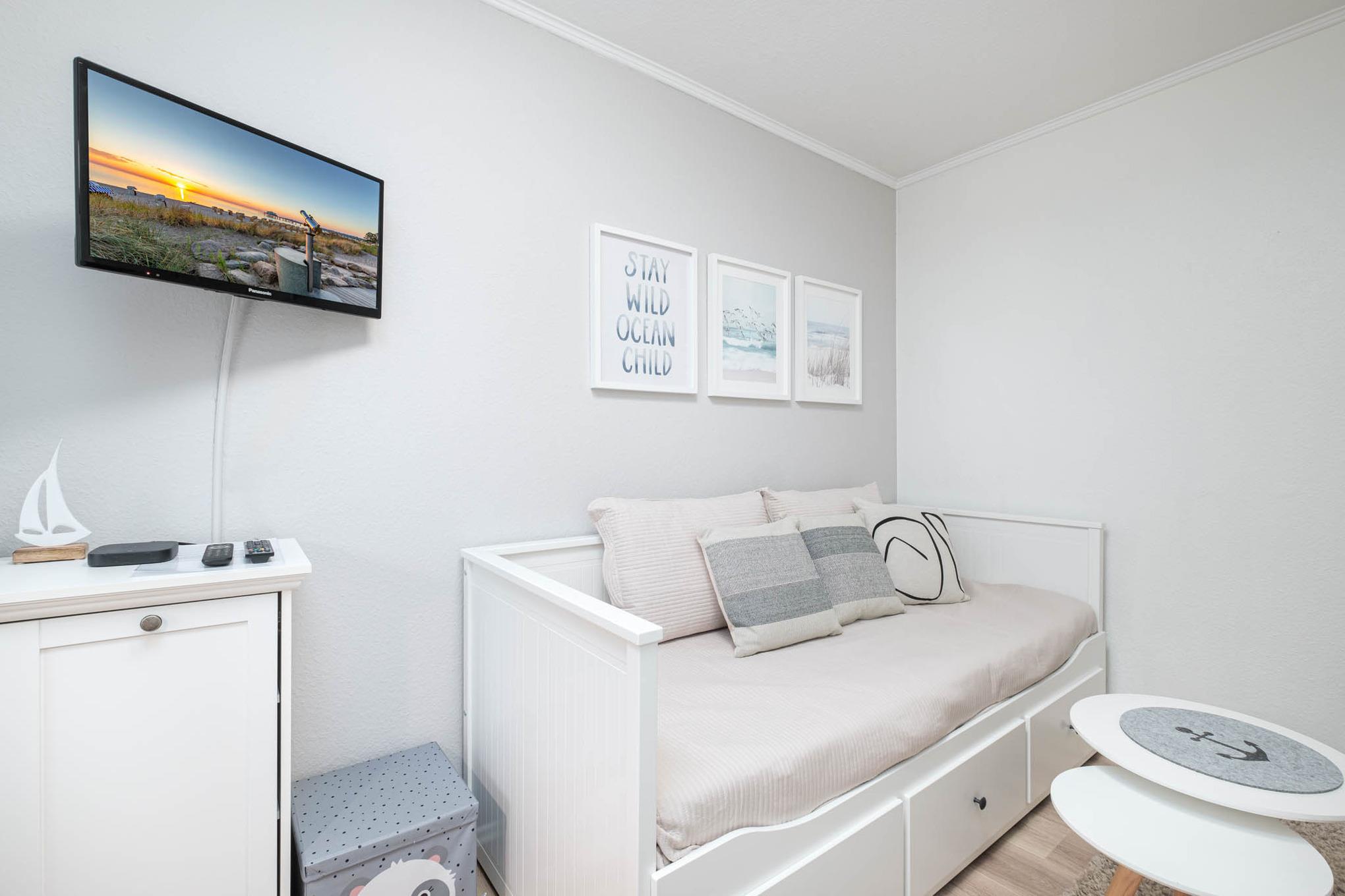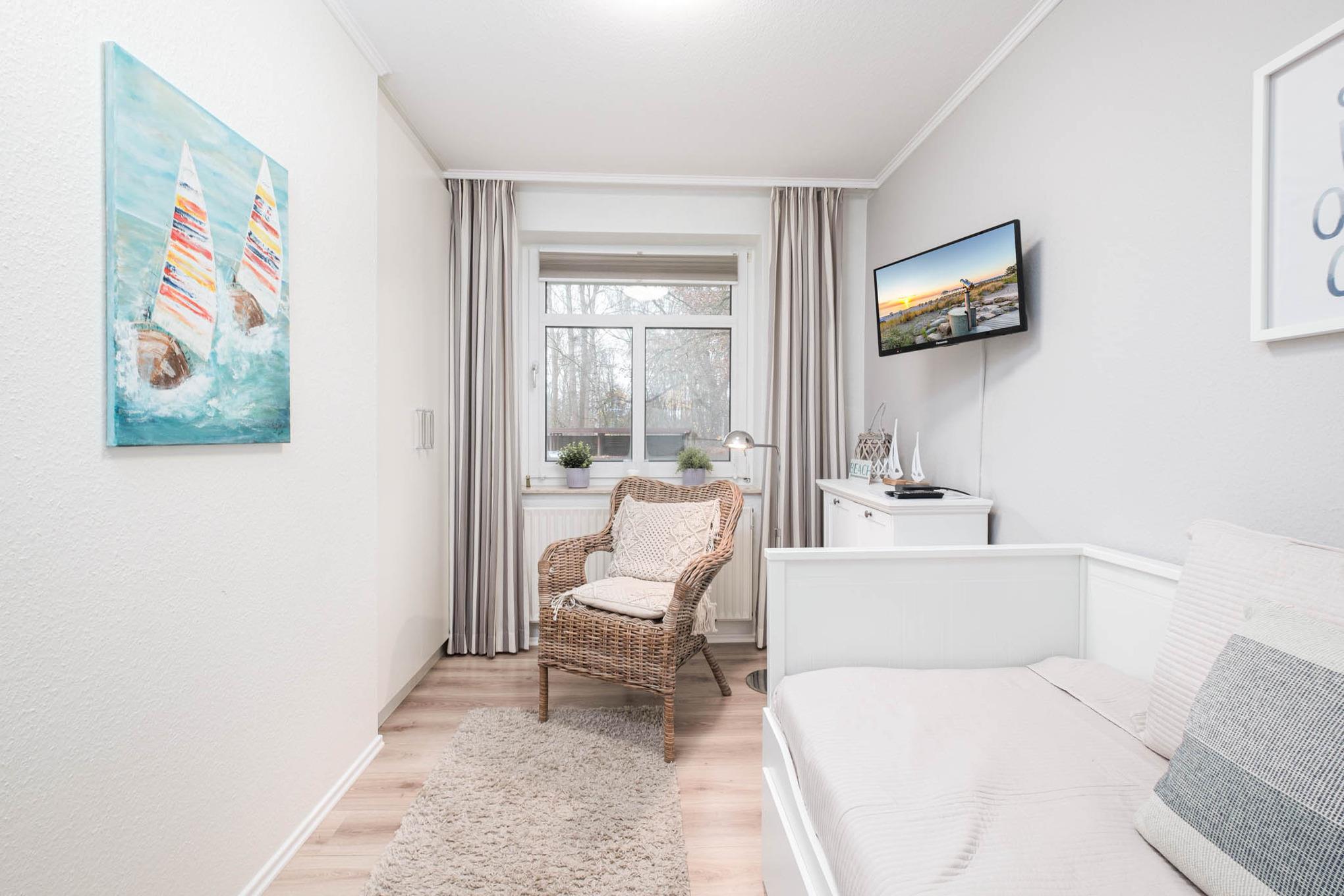 Ein zweites Schlafzimmer ist mit einem Tandembett (2x80x200cm), einer Kommode, sowie einem weiteren TV ausgestattet. Plissees sowie zusätzliche Vorhänge sorgen in beiden Schlafzimmern für einen erholsamen Schlaf. Ein besonderes Highlight des Ferienappartements bietet Ihnen außerdem Disney+ und Netflix, beides steht Ihnen bei jedem Fernseher zur Verfügung.