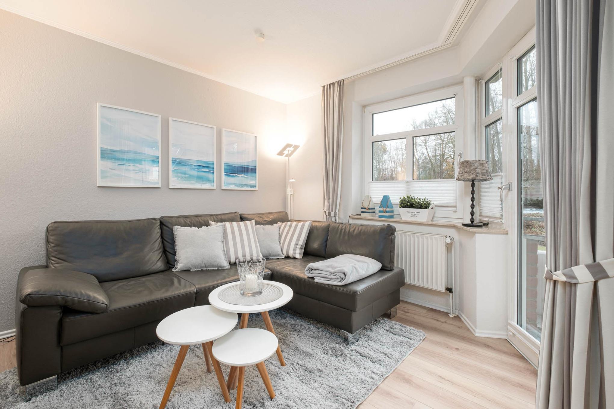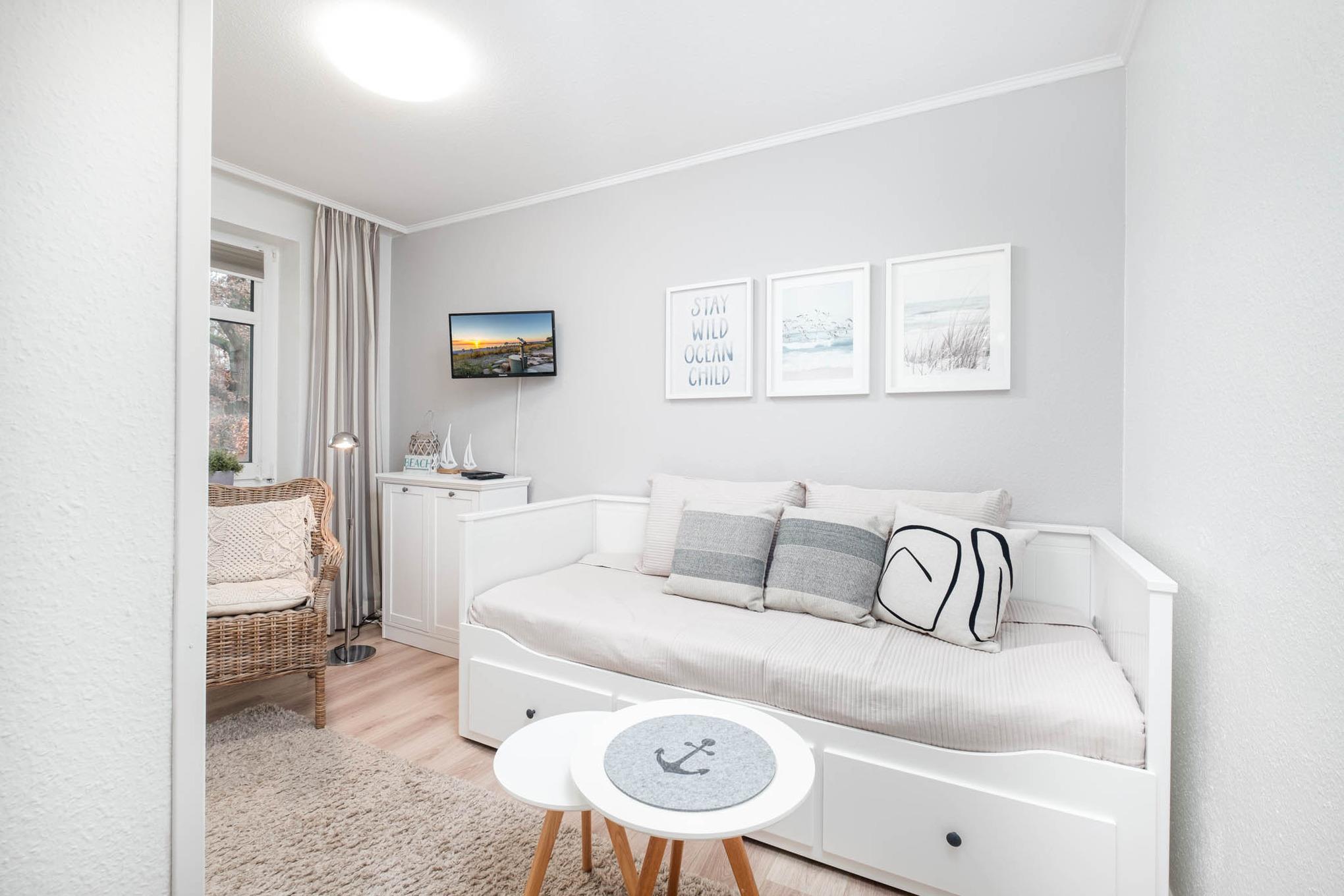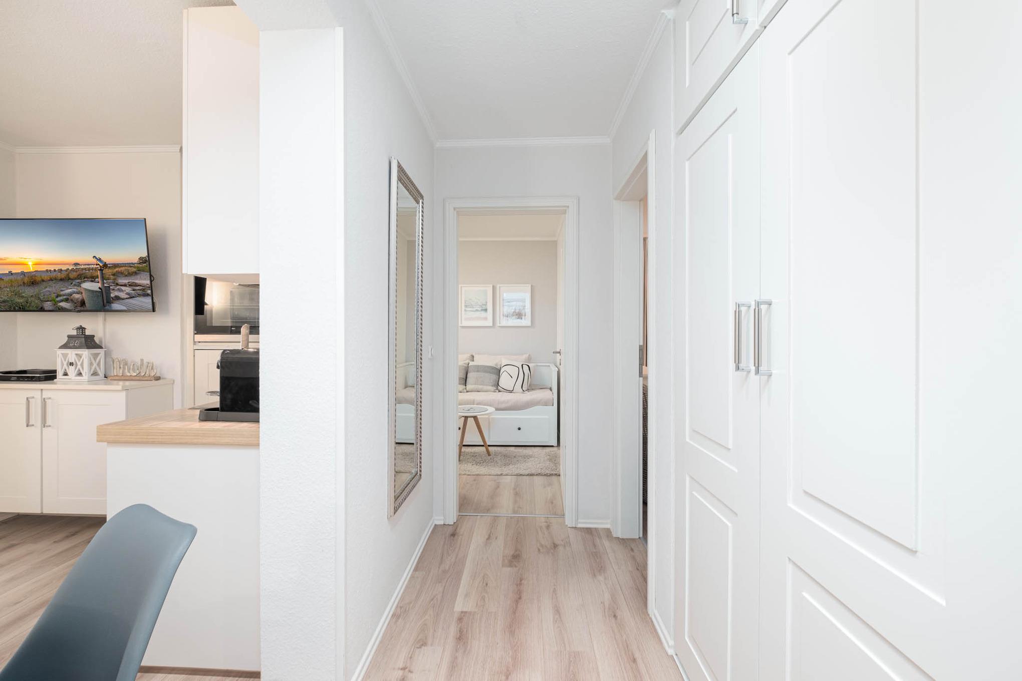 Sie betreten die liebevoll eingerichtete Niendorf Ferienwohnung über die Diele. Von hier aus gelangen Sie in den gemütlich und hellen Wohn- und Essbereich.