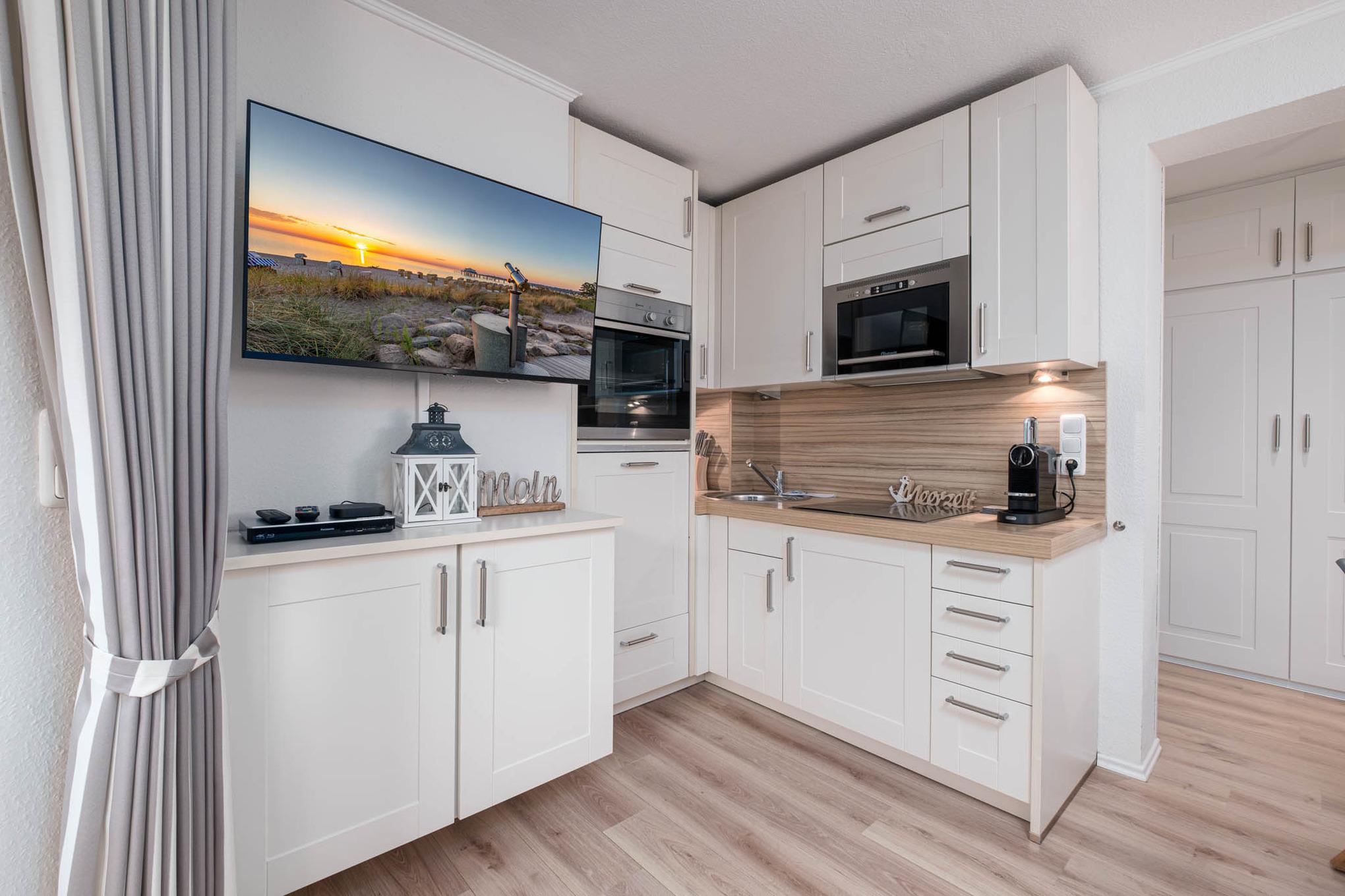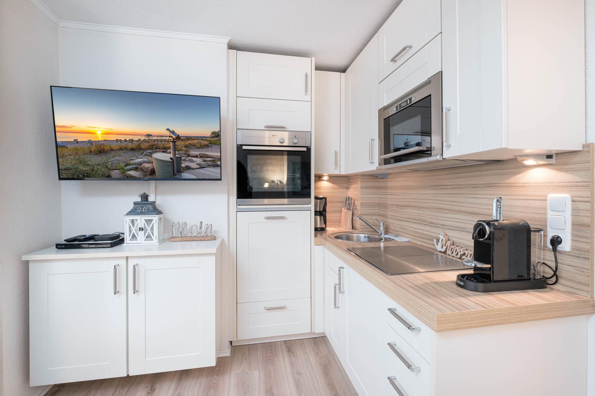 Das Wohnzimmer verfügt über einen gemütlichen Couchbereich mit Flatscreen-TV und Blue-Ray-Player, der Essbereich und die kleine aber hochwertige Küche ist diesem direkt angeschlossen. Die offene Wohnküche ist ausgestattet mit einem Cerankochfeld, einem Kühlschrank mit Gefrierfach, einer Mikrowelle, ein Toaster und ein Wasserkocher stehen Ihnen hier ebenfalls zur Verfügung. In dem Niendorf Ferienappartement steht Ihnen neben einer Filterkaffeemaschine eine Nespresso-Maschine zur Verfügung. Abgerundet wird die Ausstattung mit einem Geschirrspüler.