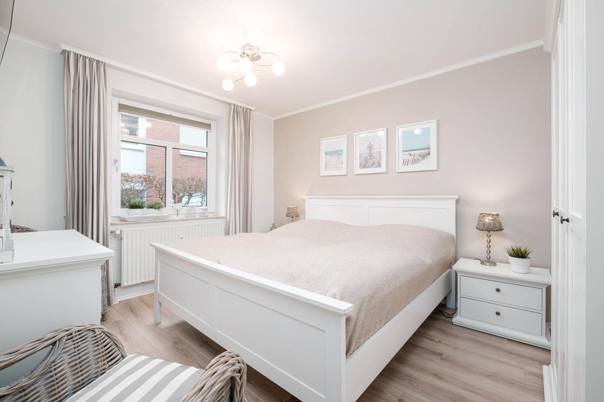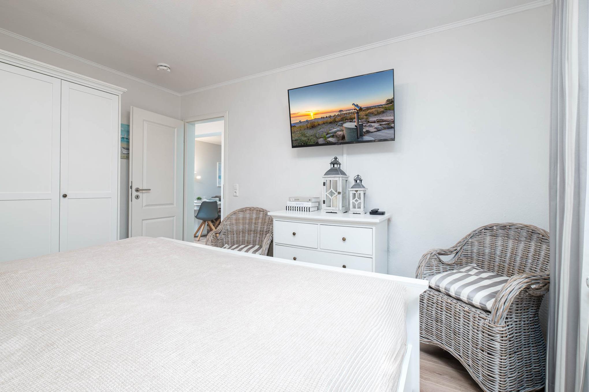Im Schlafzimmer steht Ihnen ein hochwertiges Doppelbett (180x200cm) mit getrennten Toppern, sowie ein großzügiger Kleiderschrank für Ihre Urlaubsgarderobe zur Verfügung. Ein weiteres TV-Gerät mit Magenta-TV steht Ihnen hier ebenfalls zur Verfügung.