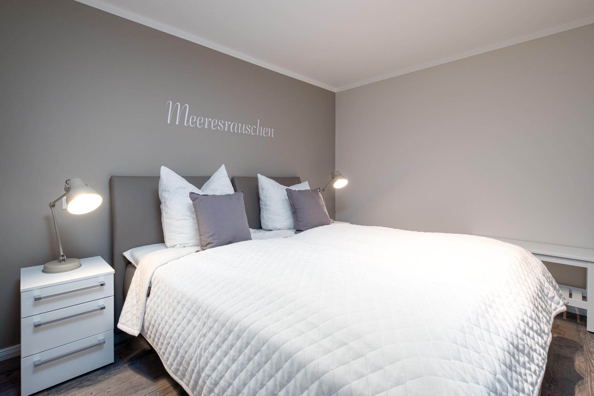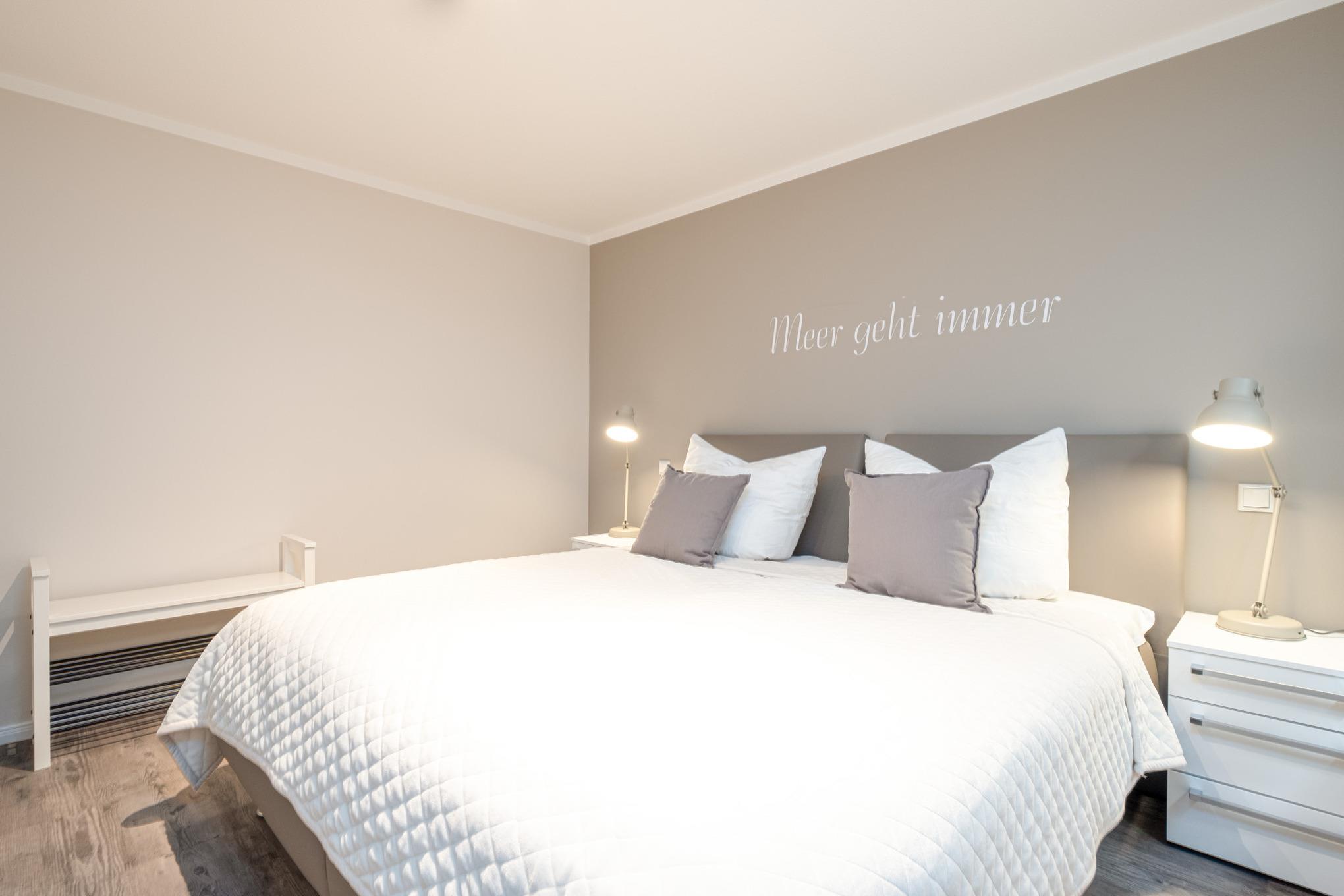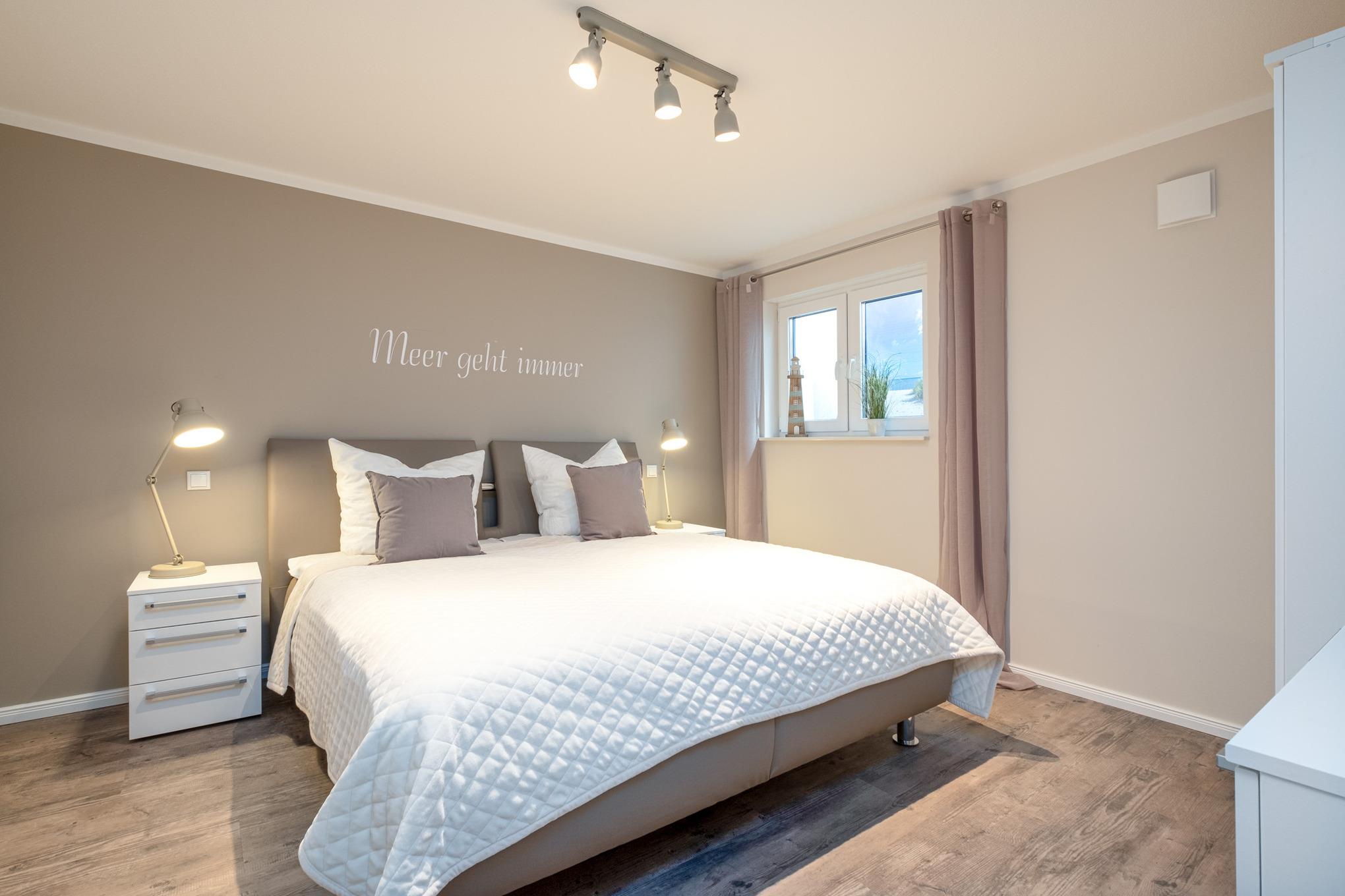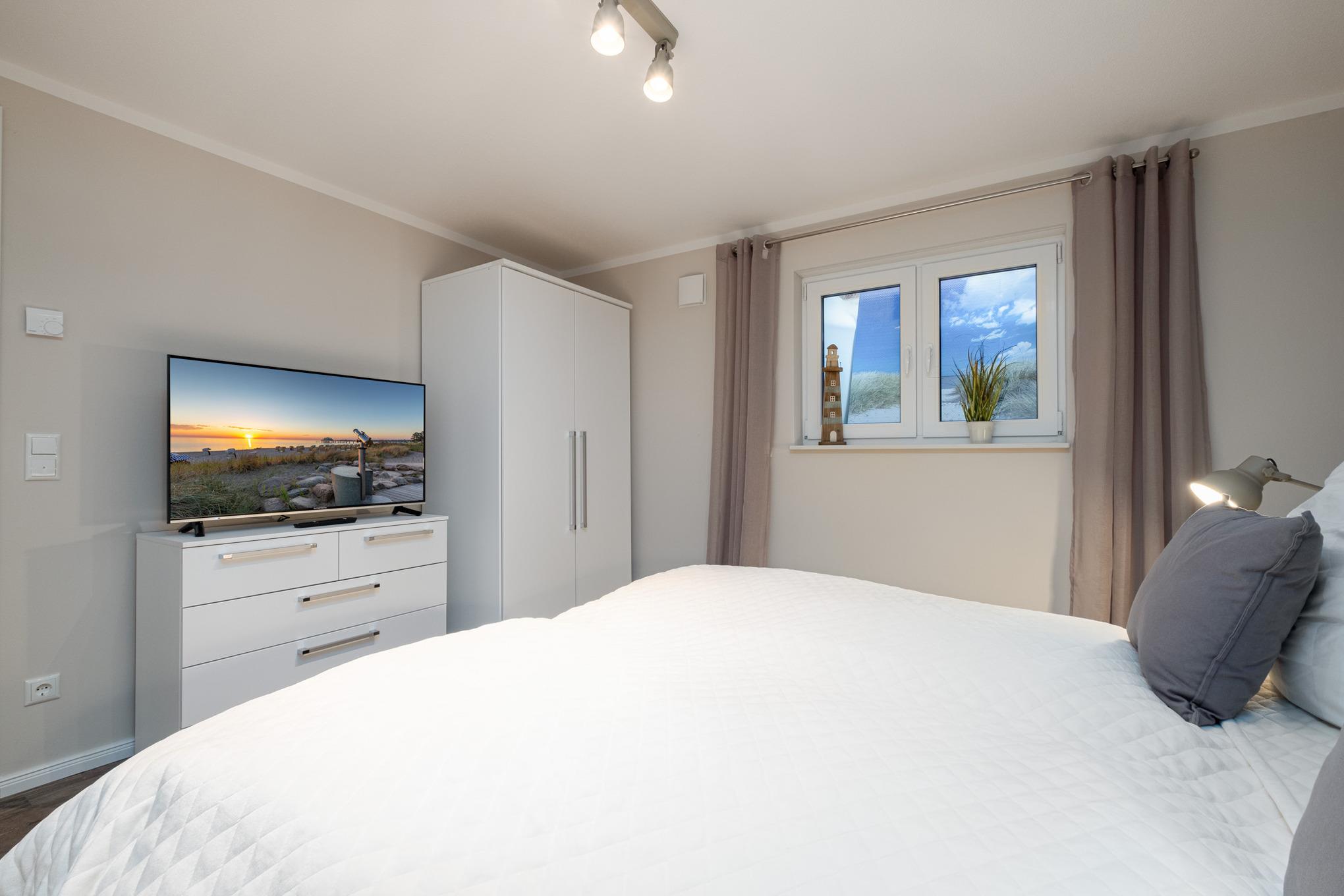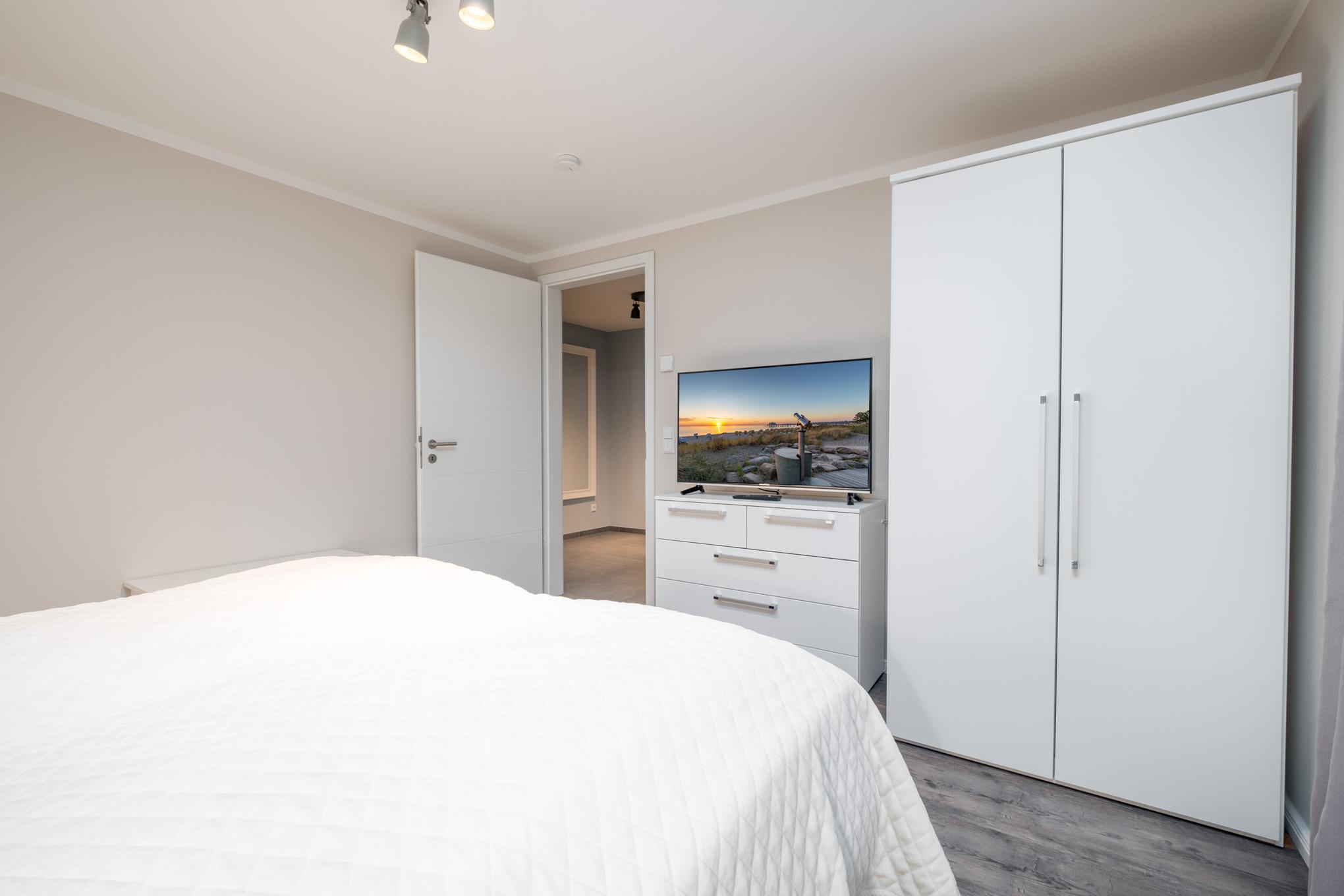 Das Schlafzimmer I sowie das Schlafzimmer II befinden sich beide im Untergeschoss der Niendorf/Ostsee Ferienwohnung und sind je mit einem Doppelbett (180x200cm), einem Kleiderschrank und einem zusätzlichen Flatscreen-TV ausgestattet. Die großen Erdlichtschächte sorgen auch hier für einen hellen Raum.