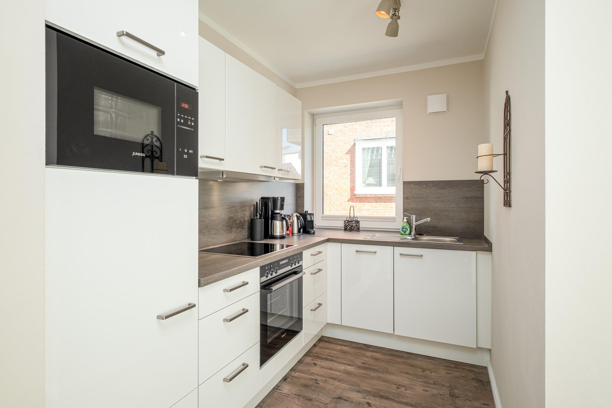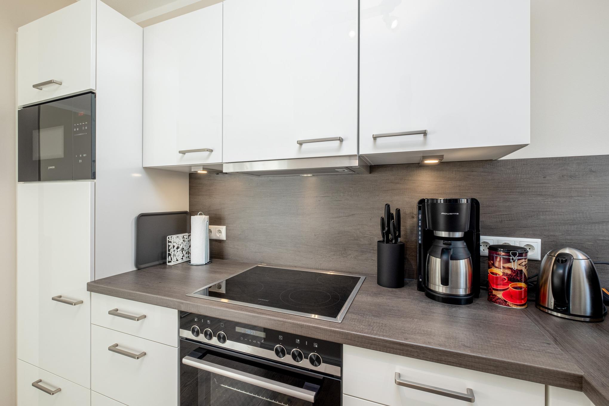 Die offene Küche ist mit allem Komfort ausgestattet u.a. sind Ceranfeld, Backofen, Mikrowelle und Geschirrspüler vorhanden.