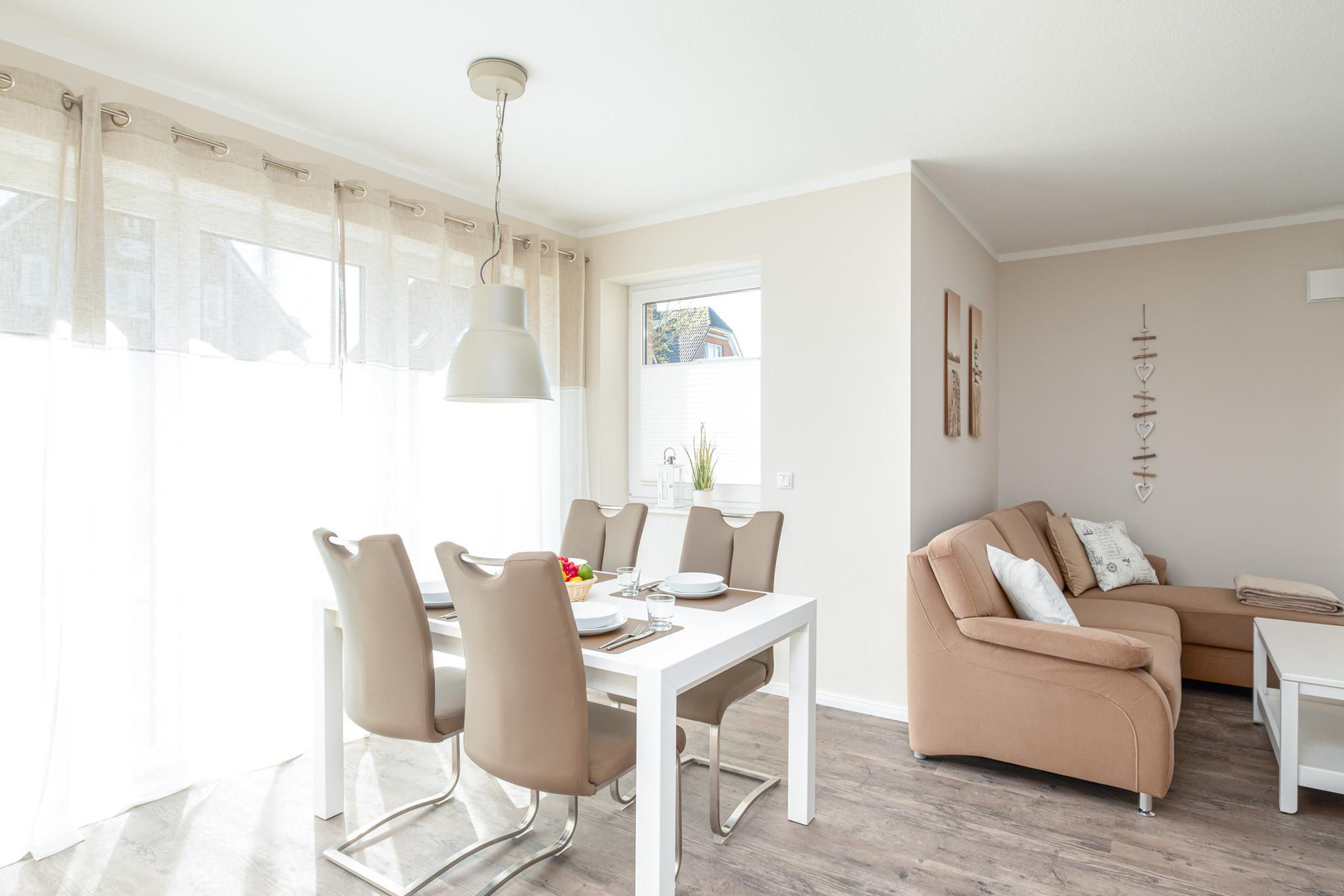 Das moderne 3-Zimmer Appartement Nr. 6 im Haus Strandperle erstreckt sich auf ca. 102qm Wohnfläche über 2 Ebenen und bietet ausreichend Platz für bis zu 4 Personen. Die Raumaufteilung ist wie folgt: