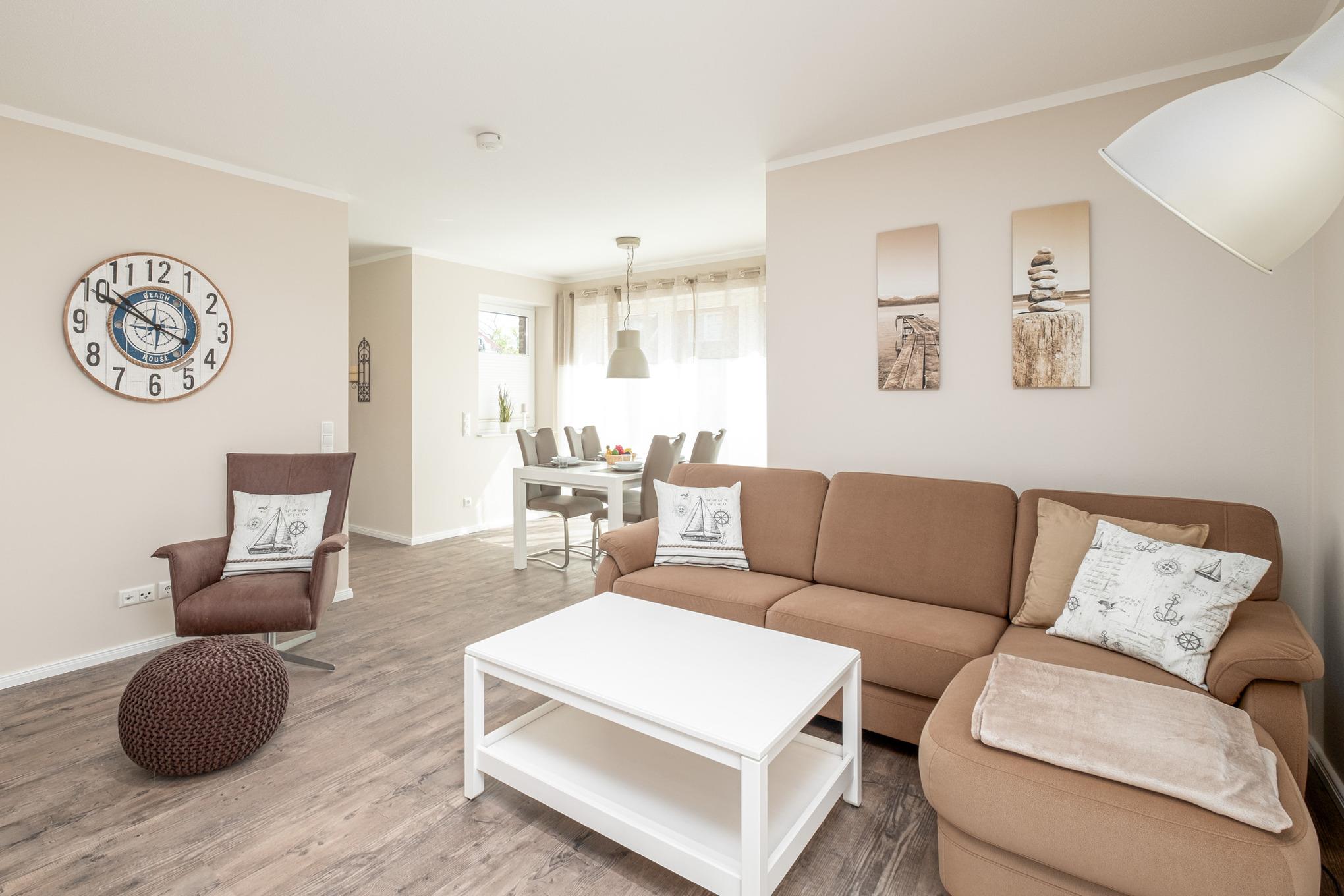 Das Herzstück des geschmackvoll und hochwertig eingerichteten Hauses bietet das moderne Wohnzimmer mit Couchgarnitur, Internetradio, Flatscreen-TV und Essbereich.