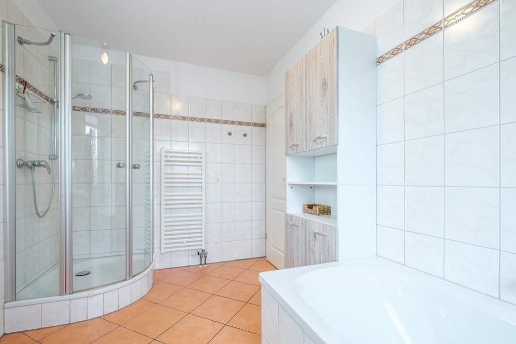Im Badezimmer finden Sie neben einem WC eine Badewanne, Dusche und einen Handtuchheizkörper vor. Für zusätzliche Behaglichkeit sorgt die Fußbodenheizung. Des Weiteren sind ausreichend Ablagemöglichkeiten vorhanden.