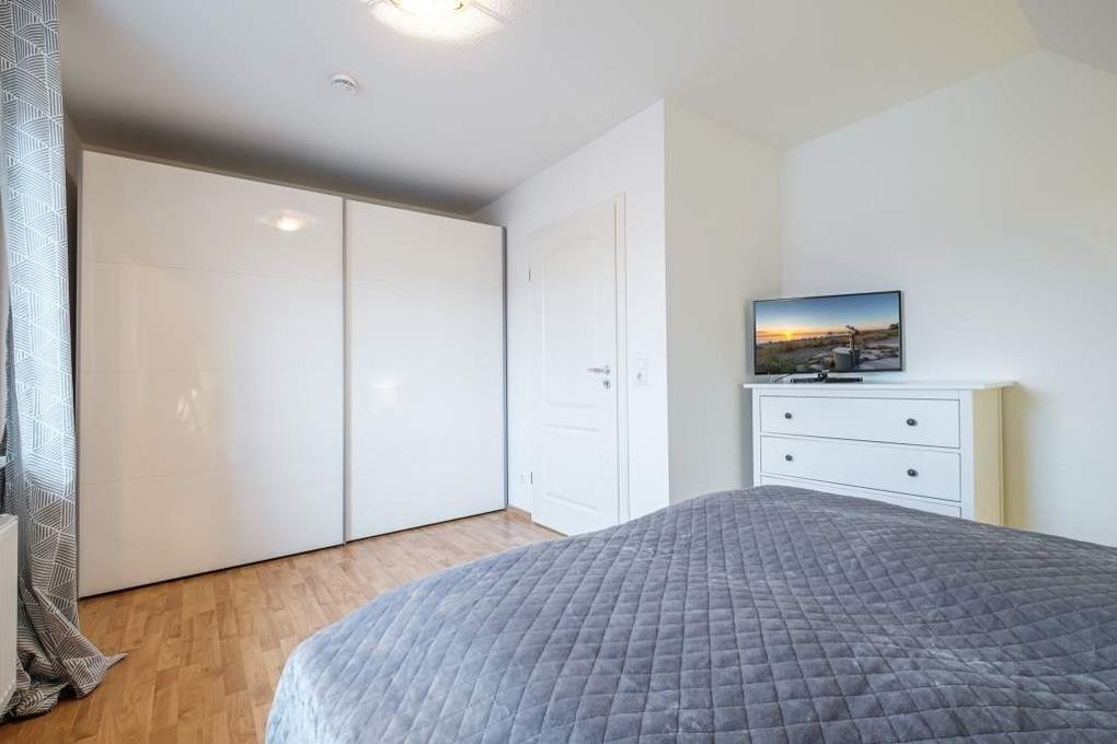 Das Schlafzimmer der Ferienwohnung Niendorf ist mit einem Boxspringbett (durchgängiger Topper: 180x200cm), Kleiderschrank, Kommode und Flatscreen-TV ausgestattet. Für einen besonderen Schlafkomfort sorgen Außenjalousien, durch die sich der Raum komplett abdunkeln lässt.