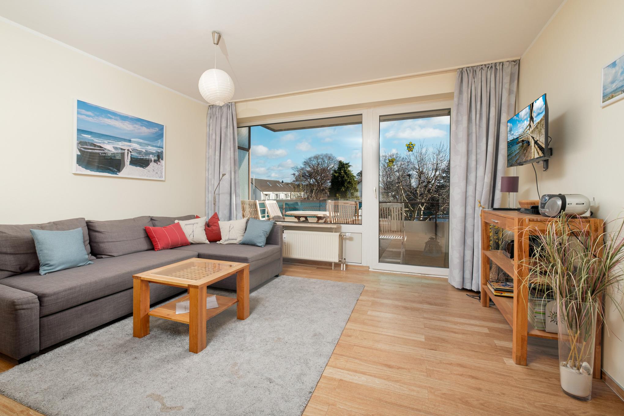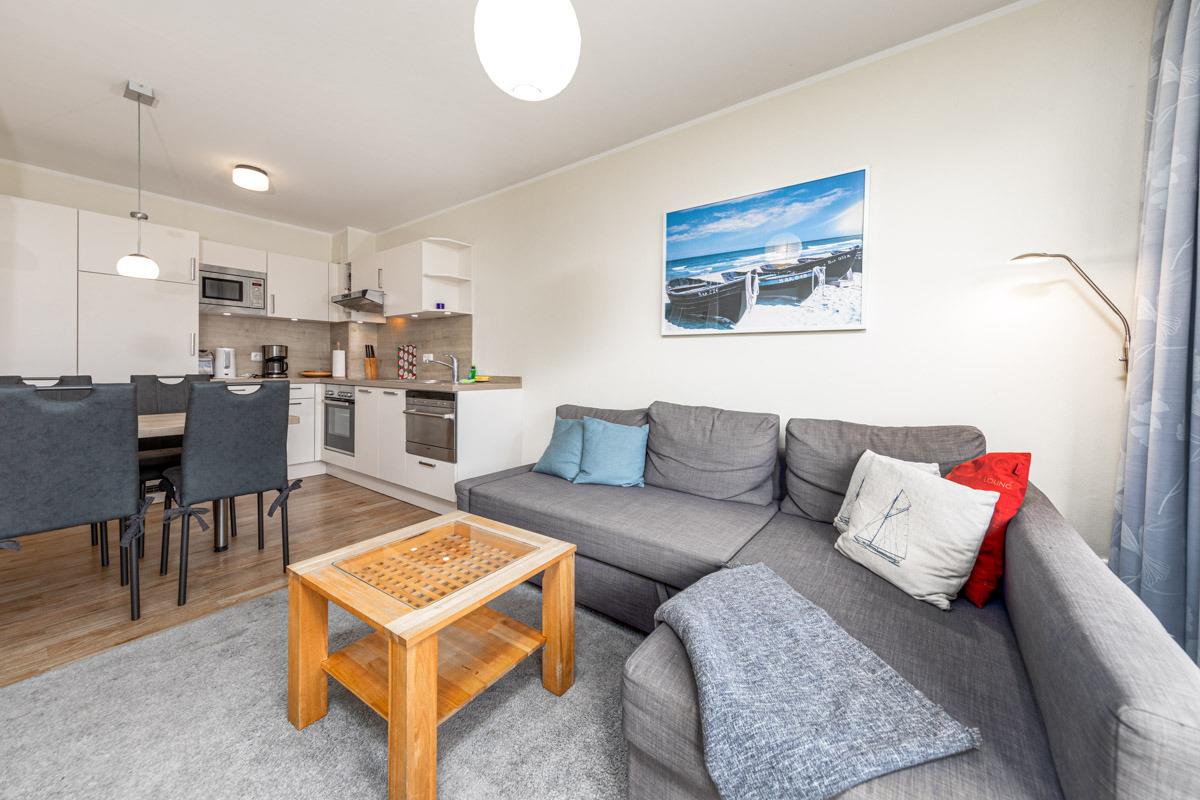 Die geschmackvoll eingerichtete 2-Zimmer Niendorf Ferienwohnung ist für max. 4 Personen ausgestattet. Es erwartet Sie ein Wohn-Schlafraum mit Schlafcouch, Smart-TV mit Internetzugang und Netflix (wenn ein eigenes Konto vorhanden ist) und DVD-Player. Die offene, komplett eingerichtete Küche verfügt über einen Esstisch, Geschirrspüler, Toaster und Kaffeemaschine, Backofen, Ceranfeld und Mikrowelle. Das Schlafzimmer ist separat und mit einem Doppelbett (160x200cm) und einem 2. Flatscreen TV ausgestattet. Ein modernes Badezimmer mit Dusche steht ebenso zur Verfügung wie eine Diele. Der möblierte Balkon mit Sonnenliege in Süd-Ost-Lage rundet diese geschmackvoll eingerichtetete Ferienwohnung Niendorf ab.