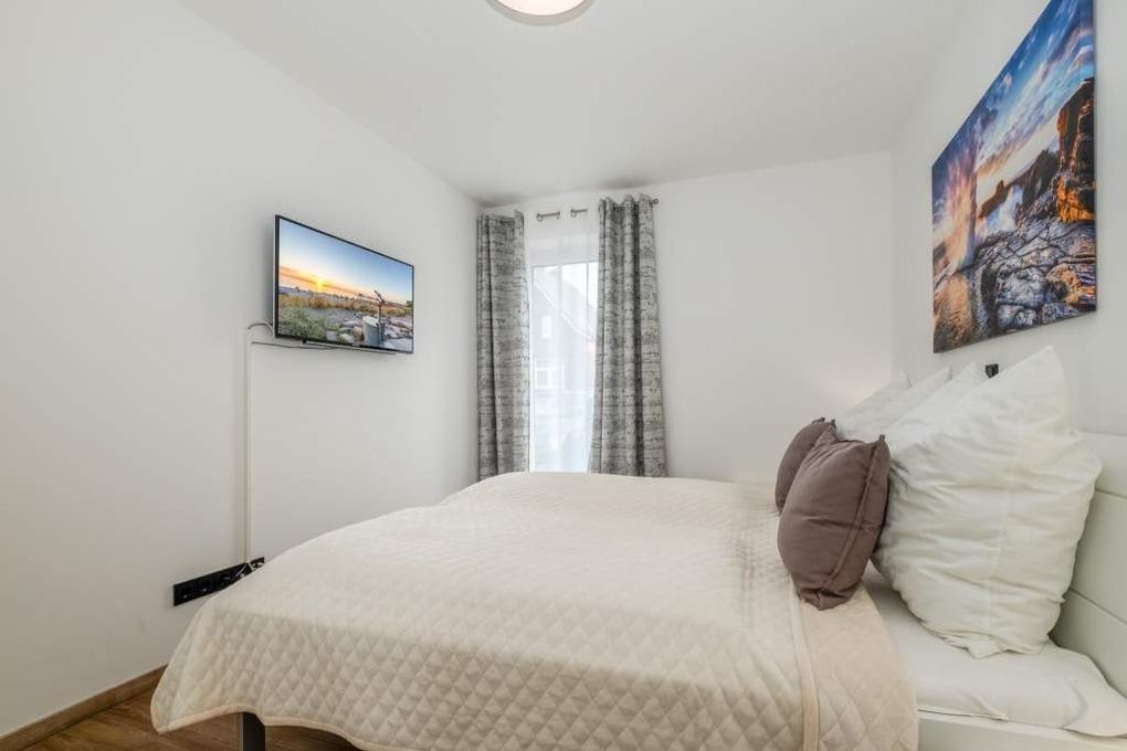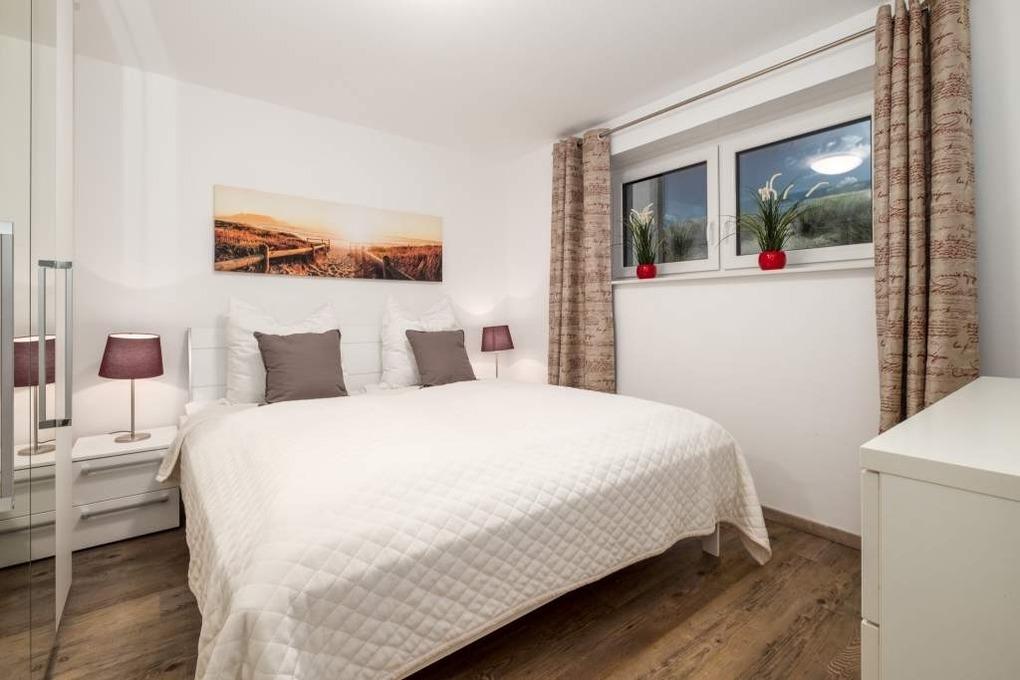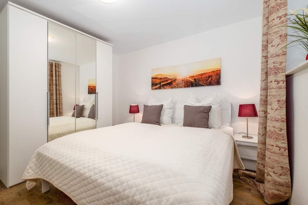 Das Schlafzimmer I befindet sich auch auf derselben Ebene und ist mit einem Doppelbett (1,80 x 2,00m, getrennte Matratzen), Kleiderschrank und Flatscreen-TV ausgestattet.