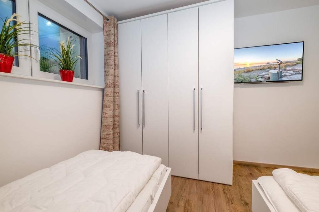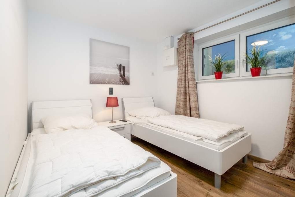 Im Untergeschoss befindet sich das zweite Schlafzimmer mit einem Doppelbett (1,80 x 2,00m, getrennte Matratzen), einem Schrank sowie einem Flatscreen-TV. Im dritten Schlafzimmer finden Sie 2 Einzelbetten (je 0,90 x 2,00m), einen Kleiderschrank und einen Flatscreen-TV vor.