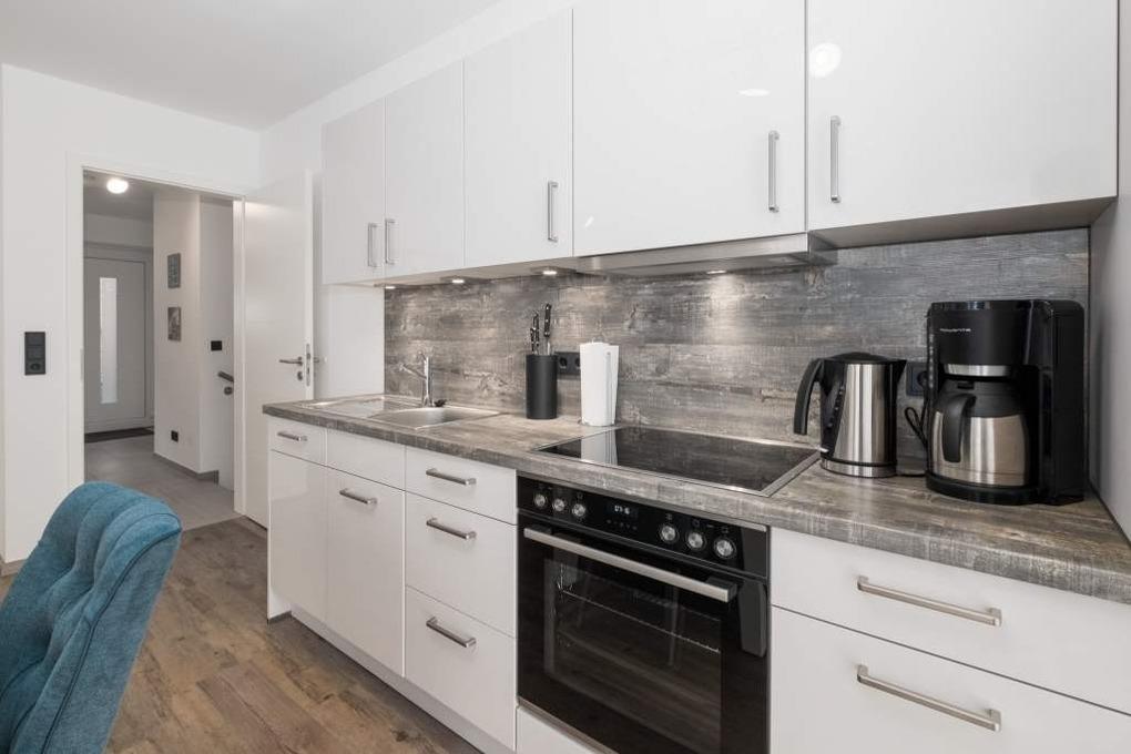 Die offene Küche ist mit allem Komfort ausgestattet u.a. sind Ceranfeld, Backofen, Mikrowelle und Geschirrspüler vorhanden.