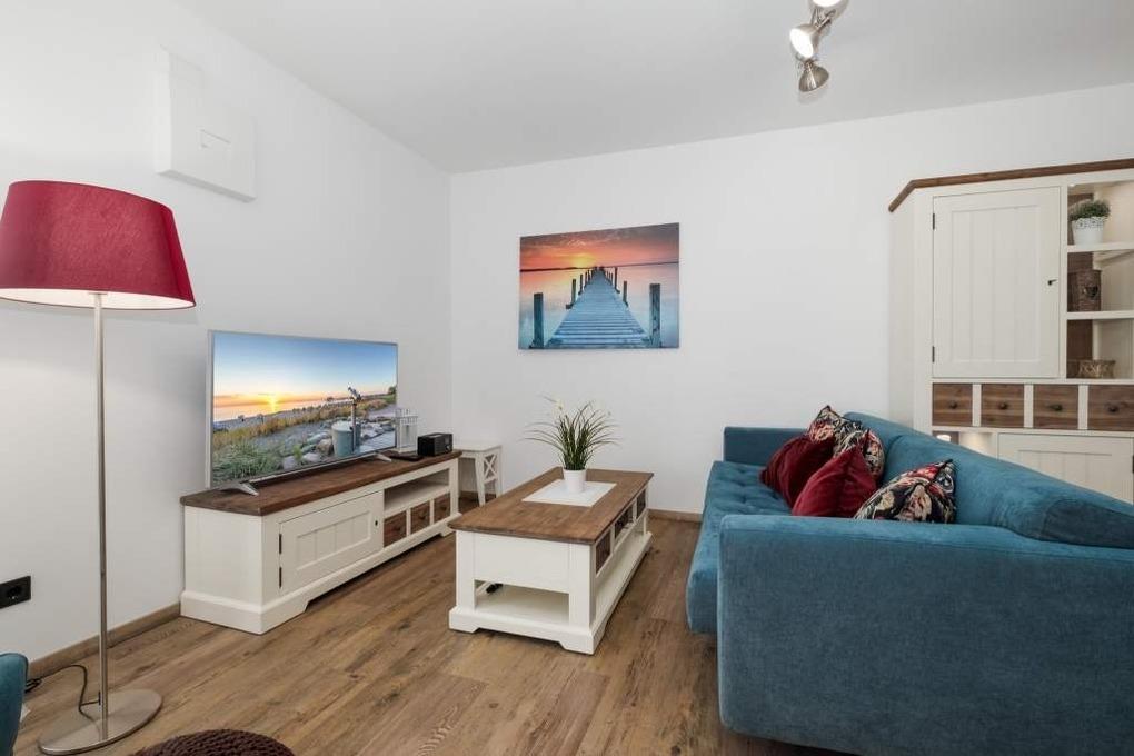 Das Herzstück des geschmackvoll und hochwertig eingerichteten Hauses bietet das moderne Wohnzimmer mit Couchgarnitur, Internetradio, Flatscreen-TV und Essbereich.