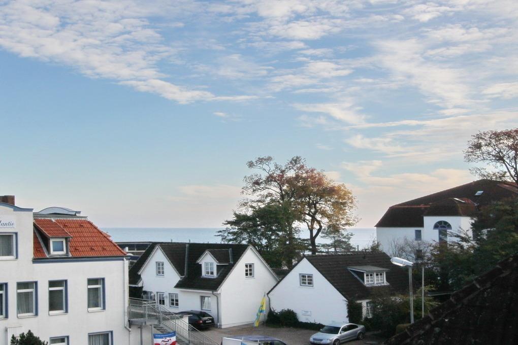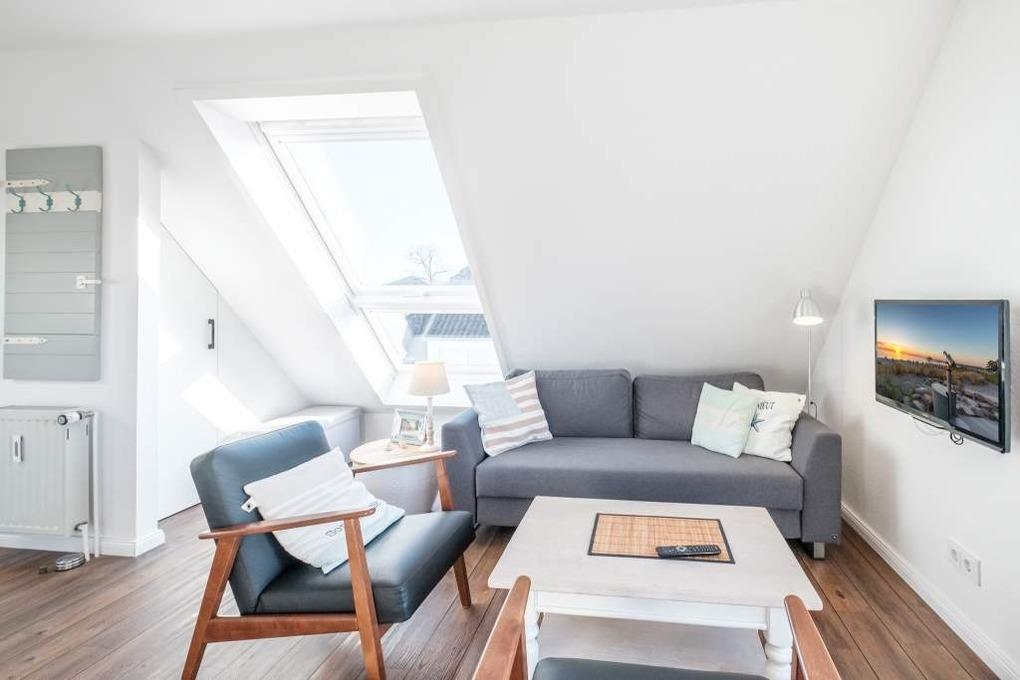 In der 3. Etage empfängt Sie ein in 2013 komplett renoviertes, großzügiges Wohnzimmer mit einer hochwertigen Schlafcouch, Flatscreen-TV und Stereo-Anlage. An die gemütliche Essecke schließt sich eine offene Einbauküche mit Ceranfeld, Mikrowelle mit Back/Grillfunktion sowie Geschirrspüler an. Im Wohnzimmer der Ferienwohnung Niendorf ist ein großes Dachflächenfenster eingebaut, von hier haben Sie einen seitlichen Meerblick. Vom Wohnzimmer aus geht es auch auf den möblierten Balkon in Süd-Westlage (mit elektrischer Markise).