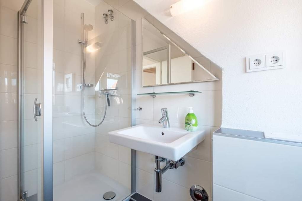 Das separate Schlafzimmer ist mit einem Boxspringbett (180x200cm) ausgestattet. Ein helles Duschbad ist ebenfalls vorhanden.