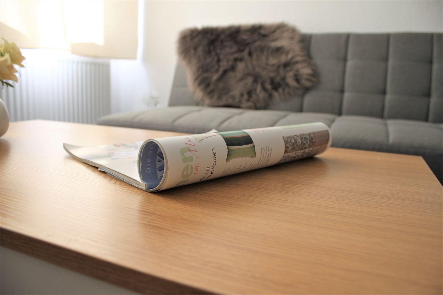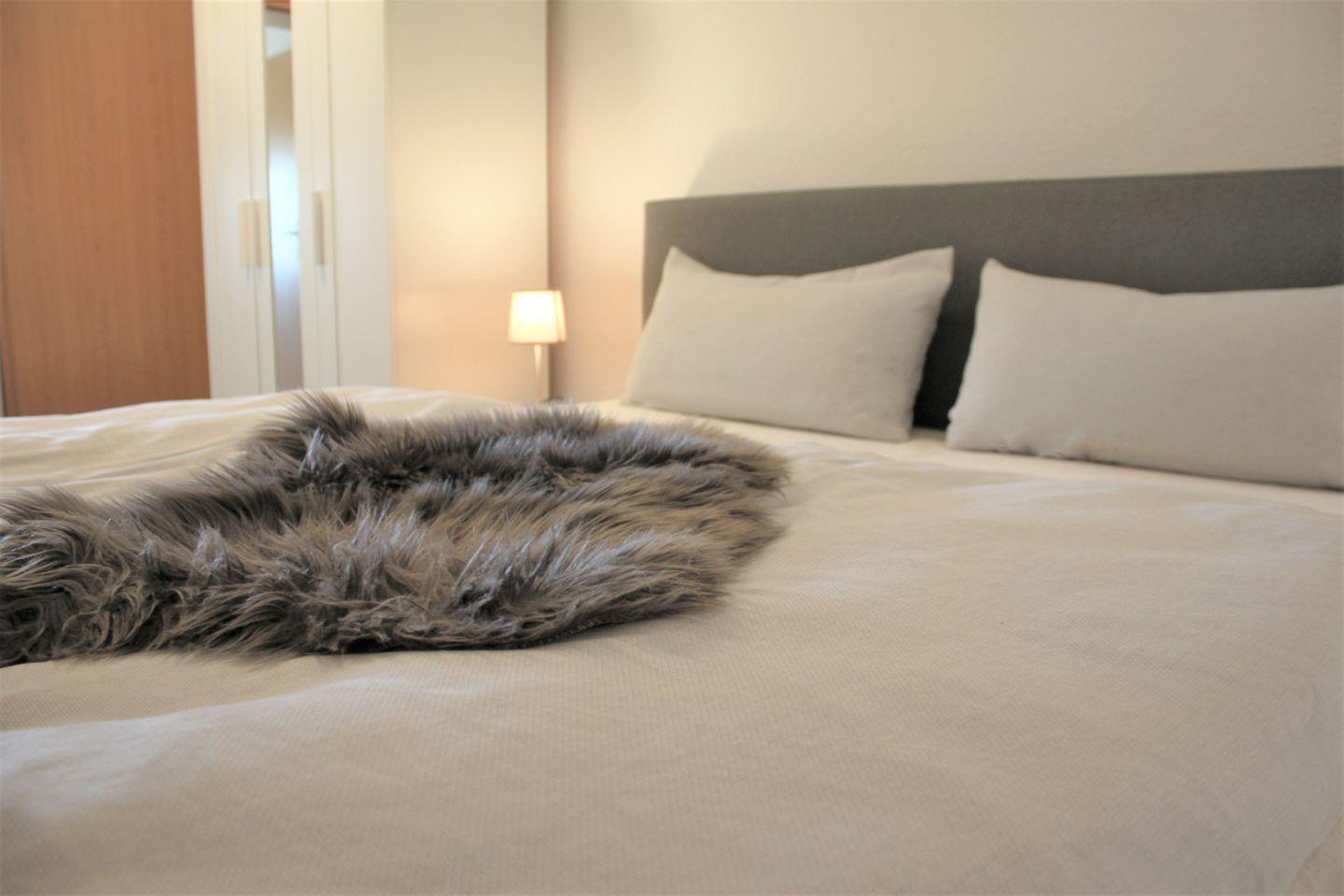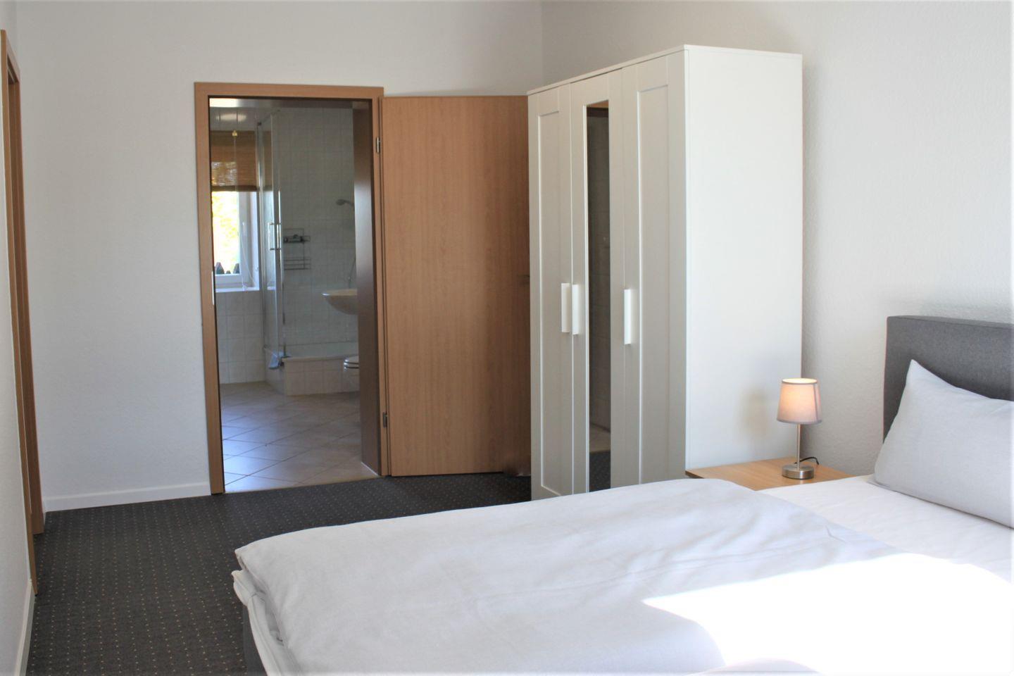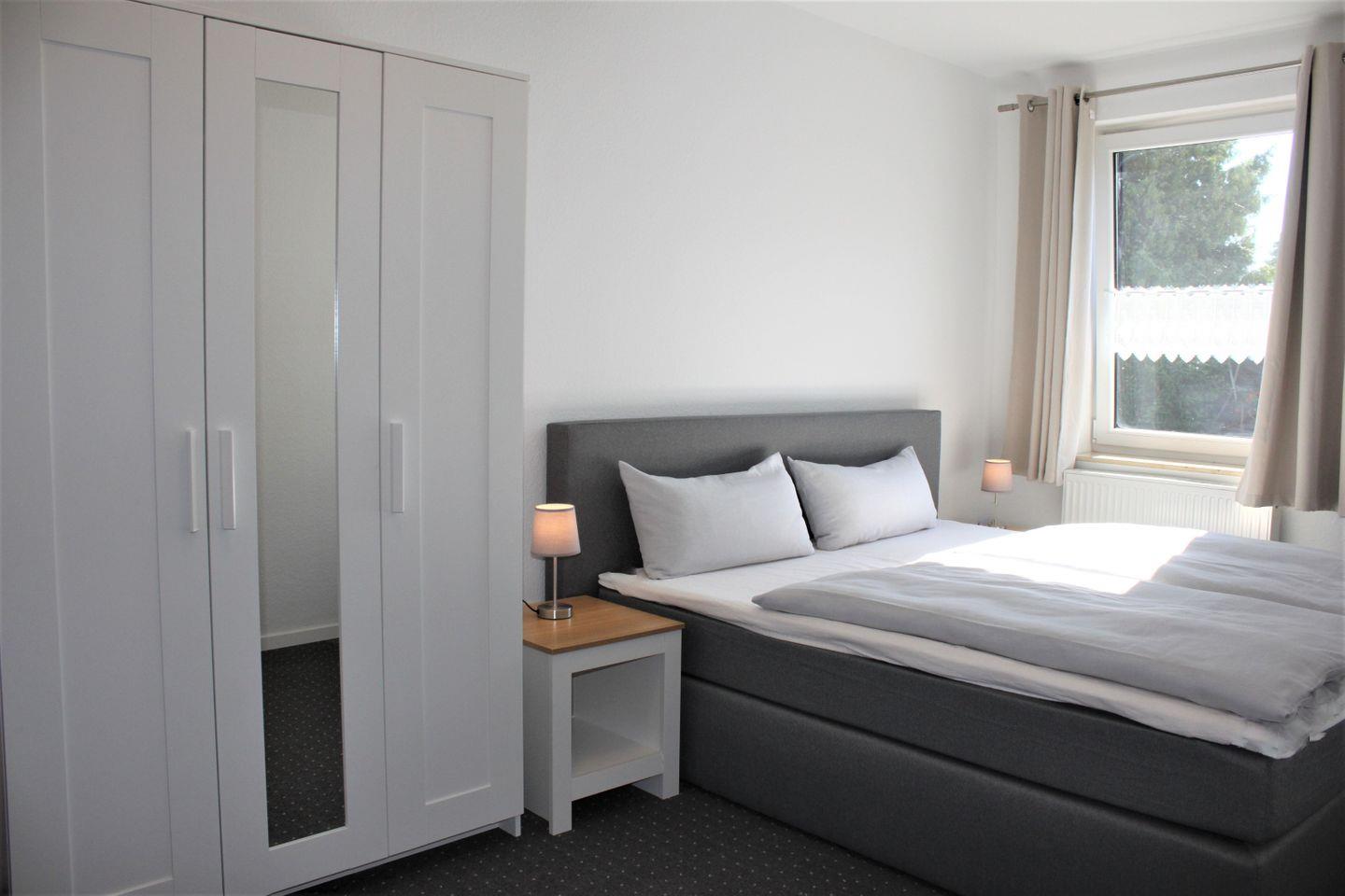 Das helle und geräumige Wohnzimmer mit dem Sofa, Sessel, WLAN und TV-Gerät lädt zu entspannten Stunden ein. Angrenzend befindet sich das separate Schlafzimmer mit komfortablem Boxspringbett (180 x 200 cm; durchgehende Matratze) und Kleiderschrank.