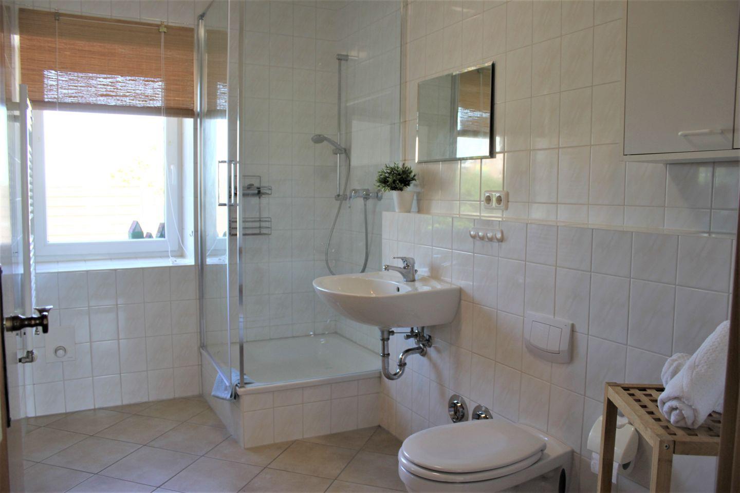 Das moderne Badezimmer mit Fenster verfügt über eine Dusche, Waschtisch und WC.
