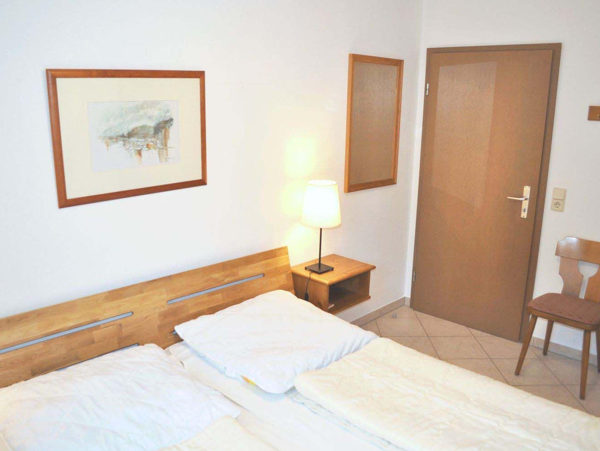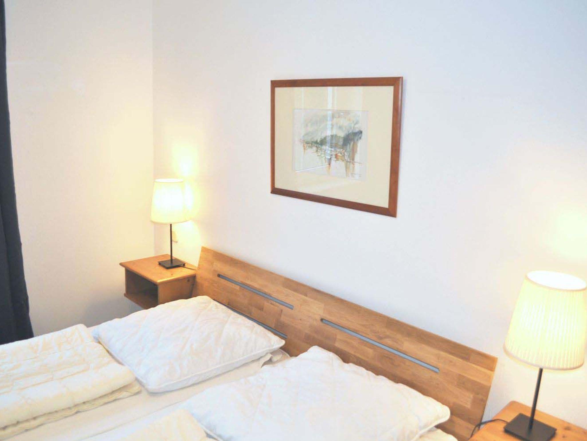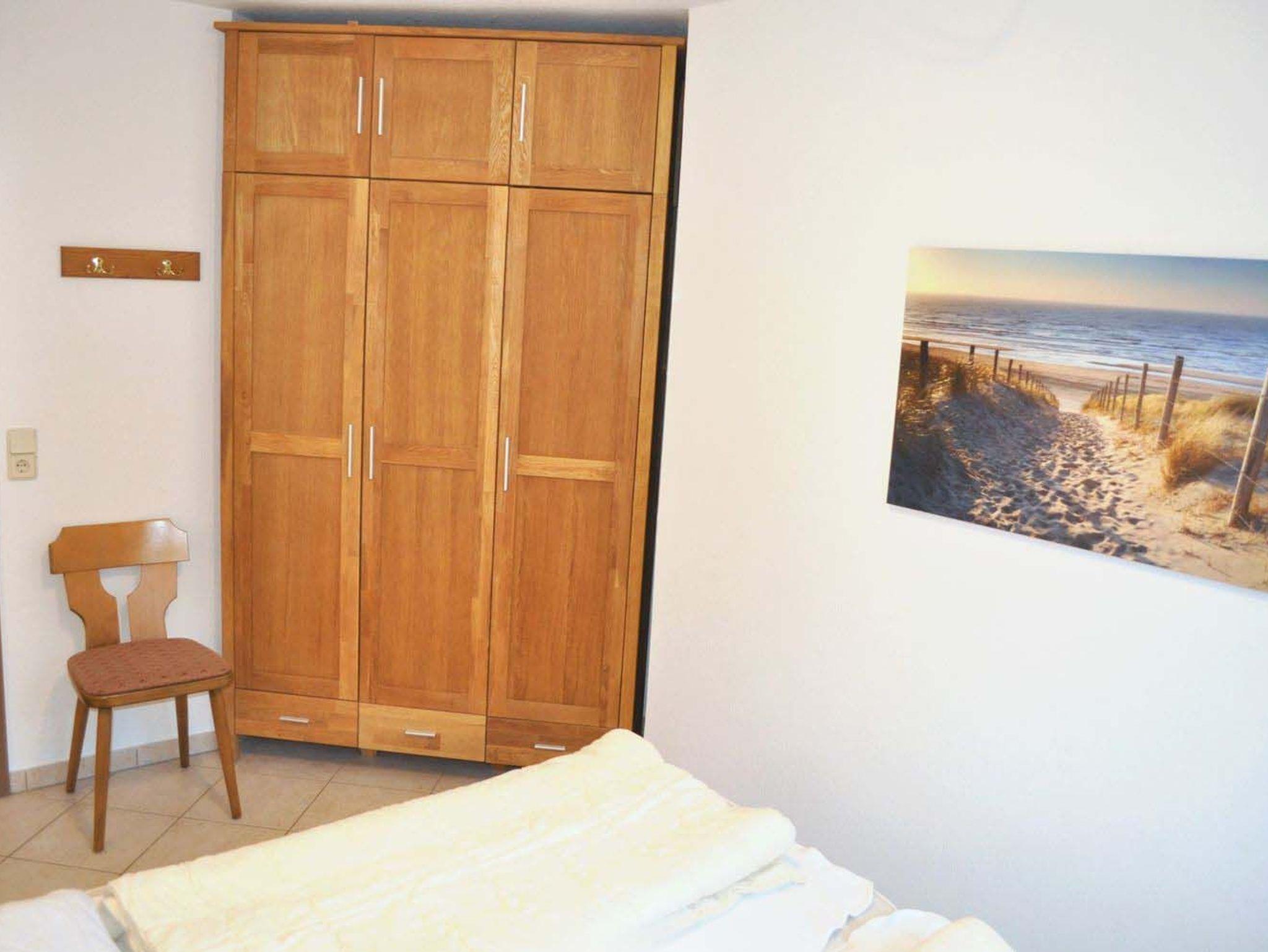 Schlafzimmer 1: 2 Ablagen, Doppelbett, Garderobe, Kleiderschrank, Radiowecker, Spiegel, Staubsauger, Stuhl, Bügelbrett, Bügeleisen
