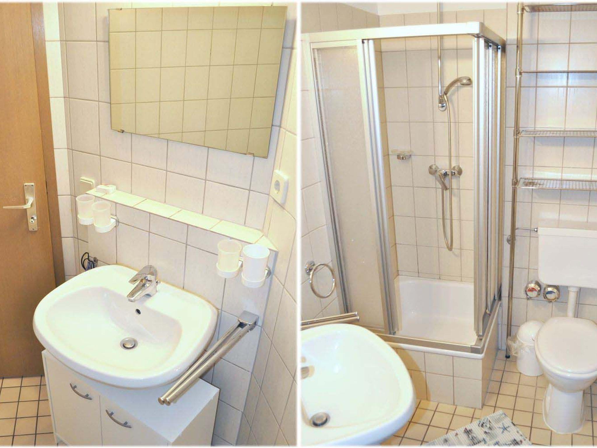 Bad 1: Dusche, Duschkabine, Hocker, Waschbecken, WC