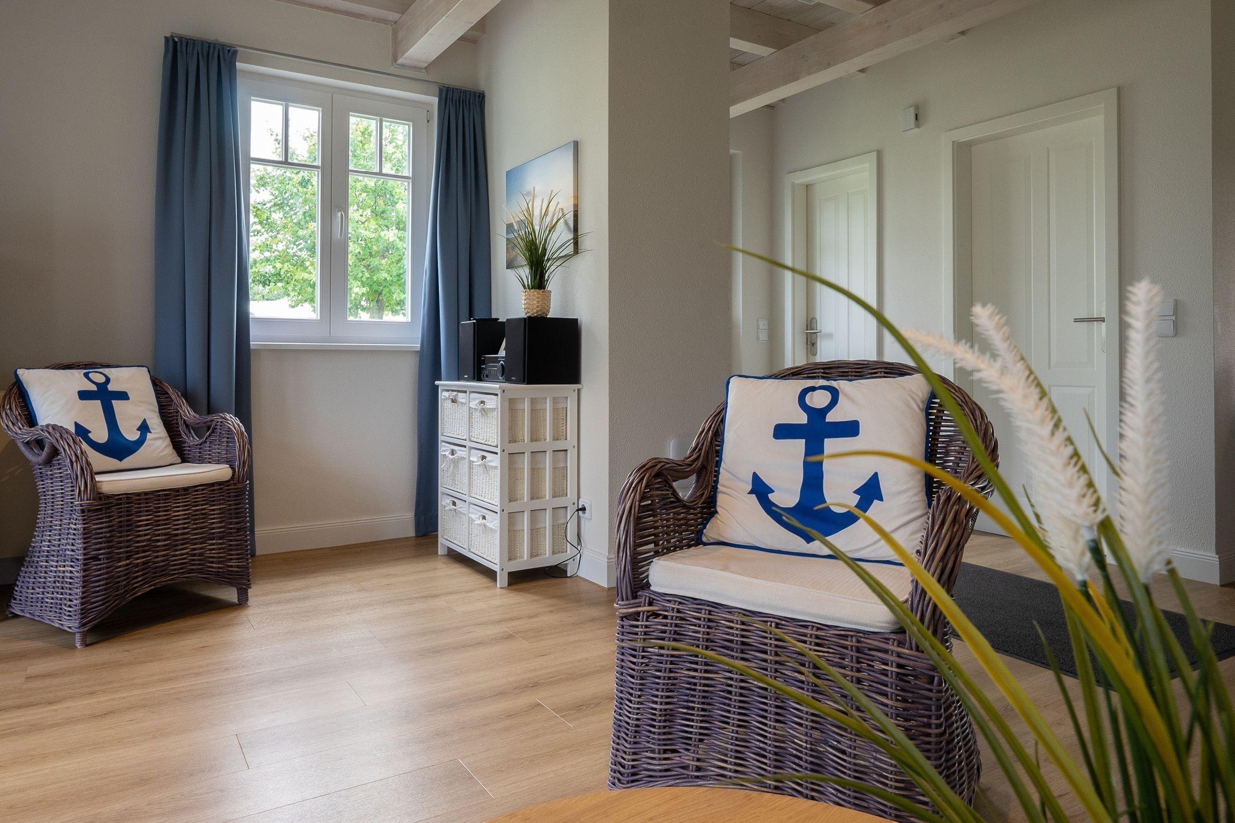 Genießen Sie den imponierenden Ausblick auf die nahe Umgebung und weitläufigen, sehr gepflegten Rasenflächen von der idyllisch anmutenden Terrasse. Diese ist ausgestattet mit modernen Gartenmöbeln und einem hübschen Strandkorb für das besondere maritime Ambiente. Ein Highlight im Außenbereich des Ferienhauses.