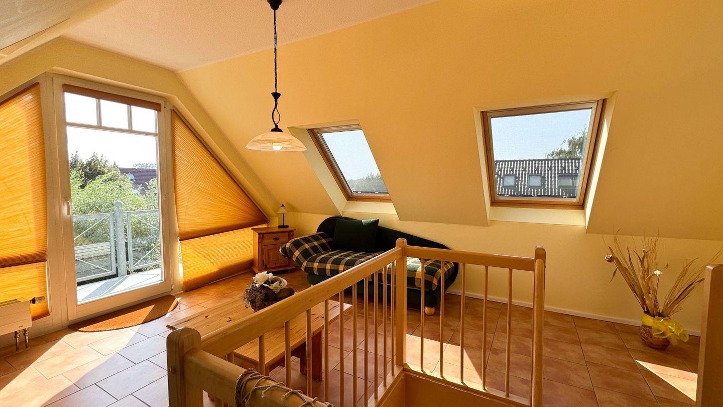 Im Dachgeschoss befinden sich zwei Einzelbetten (Polsterliegen) und ein Bad mit