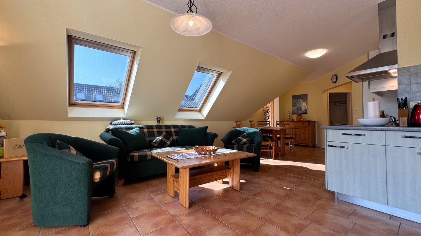ein Wohn-/Esszimmer (Polstermöbel, Essplatz, LCD-TV, HiFi-Anlage, W-LAN), eine