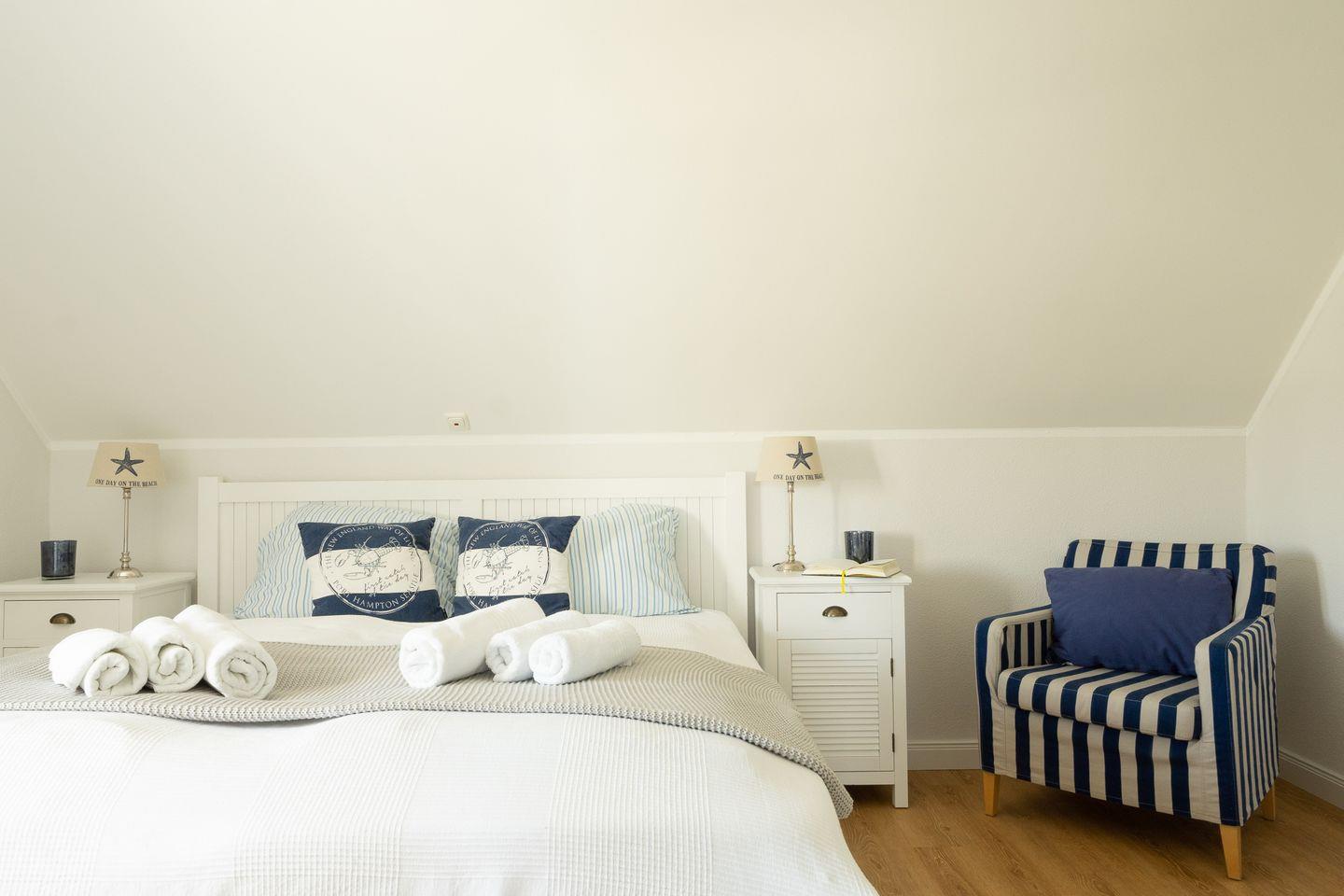 Im Erdgeschoss erwartet Sie ein liebevoll gestalteter Wohnbereich mit zwei bequemen Sesseln und einer gemütlichen Schlafcouch, die sich bei Bedarf in einen komfortablen Schlafplatz für zwei Personen verwandeln lässt. Warme Farben, stilvolle Dekoration und hochwertige Möbel schaffen eine behagliche Atmosphäre – perfekt für entspannte Abende nach einem erlebnisreichen Tag an der Ostsee.