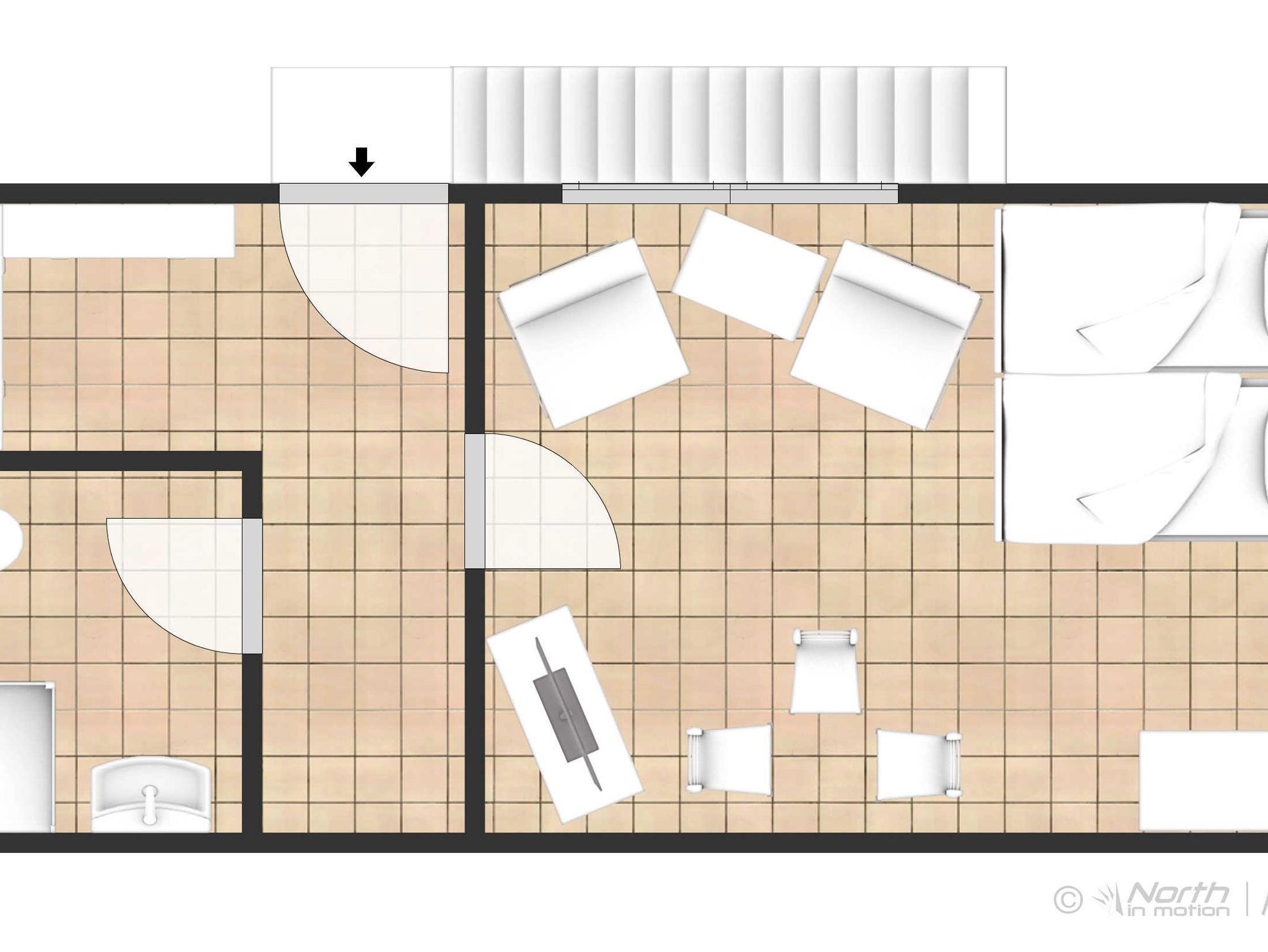 Den Gästen stehen im Wohn-/Schlafraum 2 Einzelbetten (90x200auch als Doppelbett stellbar), eine gemütliche Sitzecke, ein Essplatz, Sat/TV und Radio sowie WLAN zur Verfügung. Die separate Küchenzeile befindet sich im Vorraum und ist mit zwei Kochplatten, Kühlschrank mit Gefrierfach, Kaffeemaschine, Wasserkocher, Toaster ausgestattet. Selbstverständlich gibt es auch Dusche, WC, Fön und Heizung. Die Aufbettung für eine dritte Person besteht aus einem Zustellbett (90x190), welches anstelle der Sessel und des Tisches aufgestellt wird.